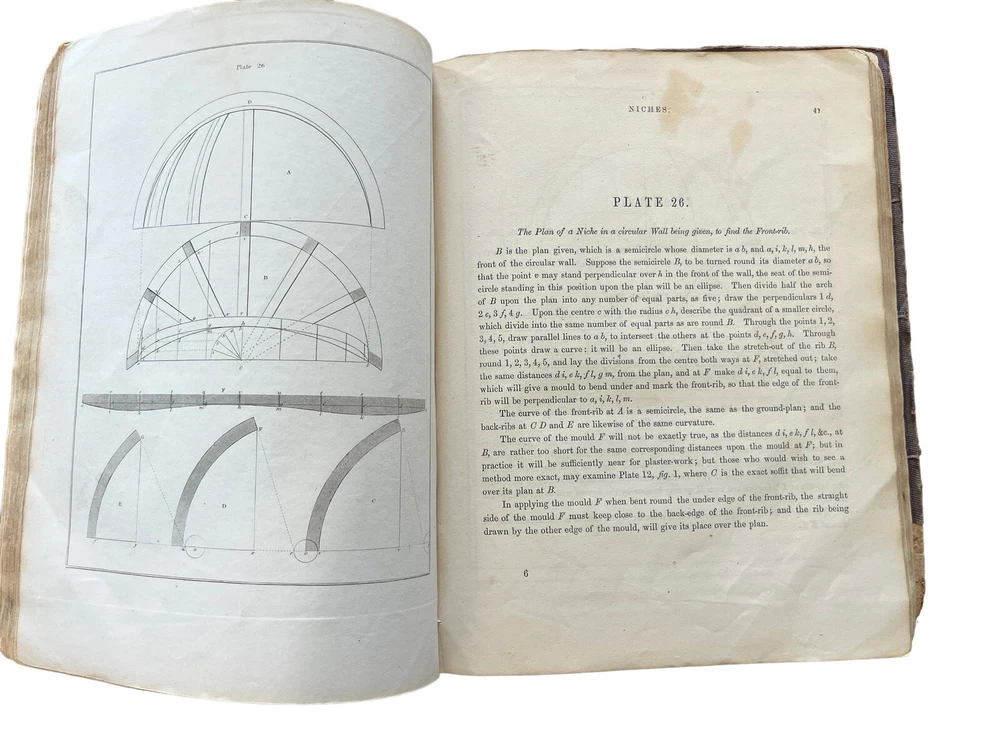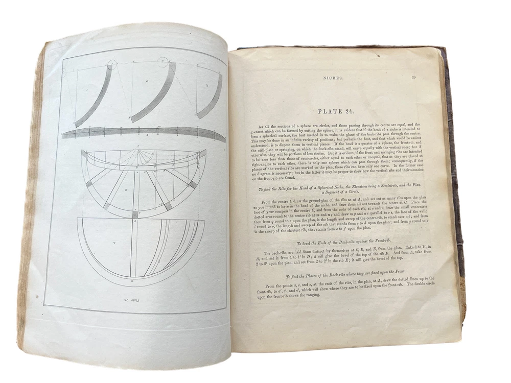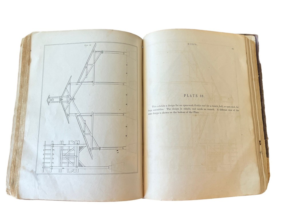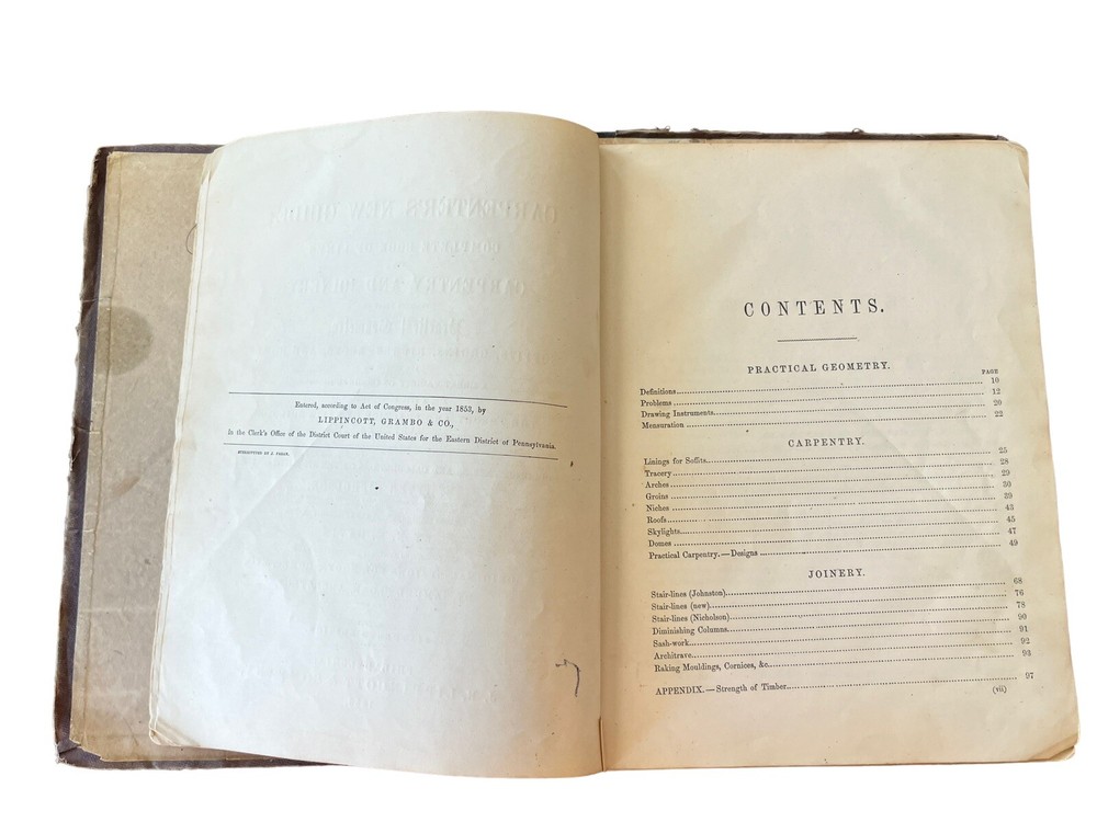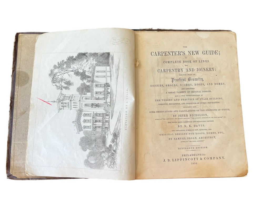 The Carpenter's New Guide - A Complete Book of Lines and Carpentry and Joinery. This is a very old book. It was printed in 1856 in Philidelphia as a sixteenth edition. All of the pages are intact, attached to the spine, and still look good. The outside spine is very worn. The front and back cover have separated from the spine. There is some yellowing of the pages around the edges. There is an odd printing error in this book. Plate 26 got put in twice, it is the same picture for plate 24 and 26. Except on plate 24 page it is upside down. It looks like the printer made a mistake. Please see pictures for more details and forward any questions.