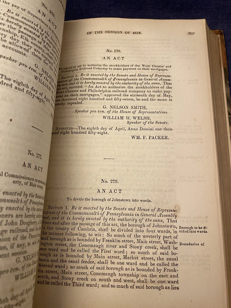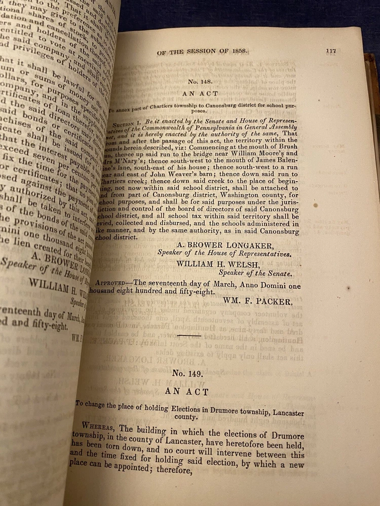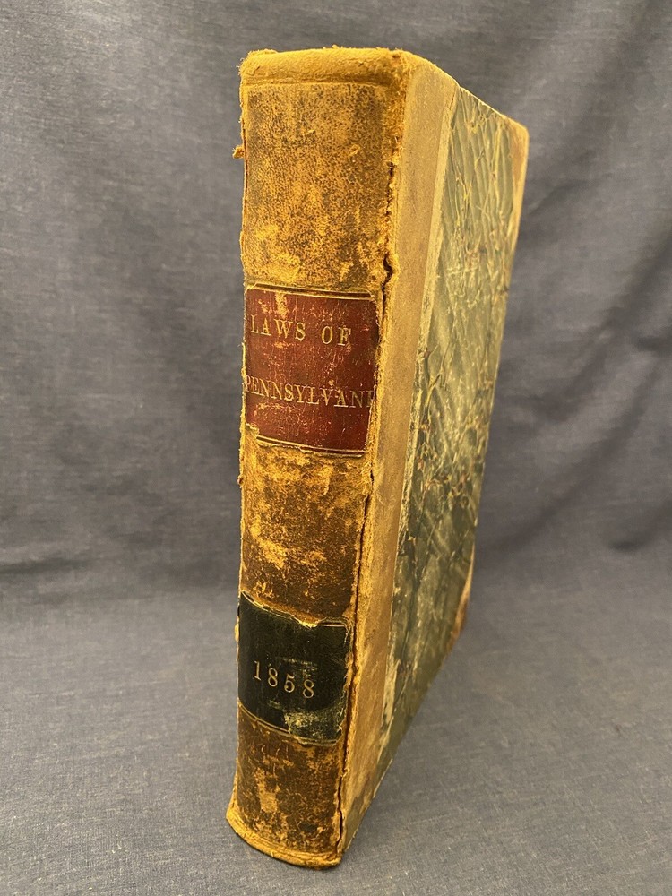 Laws of the General Assembly of the Commonwealth of Pennsylvania Passed at the Session of 1858 in the Eighty-Second Year of Independence With an Appendix Signed inside cover with the name Benjamin De Long Measures 6 1/4" x 9" -- I never use stock photos. The photos you see are the actual item you will be purchasing. Books stored in smoke-free home . Always sold as is, but I ensure customer satisfaction. You come first. I allow my feedback to speak for me. Shipping: USPS Media Mail. Well wrapped and protected in a custom-made box. I ship within one day of receiving payment, often the same day. I can accommodate special requests at buyer’s expense & combined shipping is welcome. I do not ship on Saturday. Return Policy: If you are not happy with your purchase please give me the opportunity to make it right. Returns accepted via ebay policy.