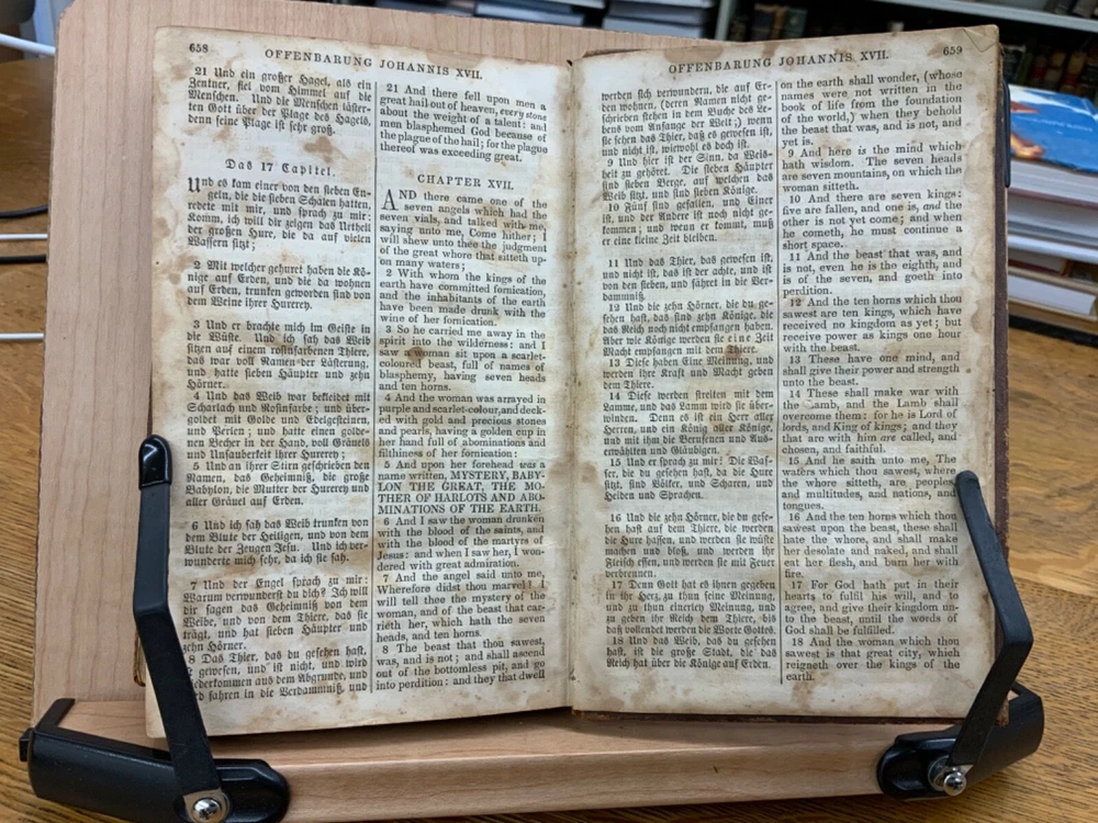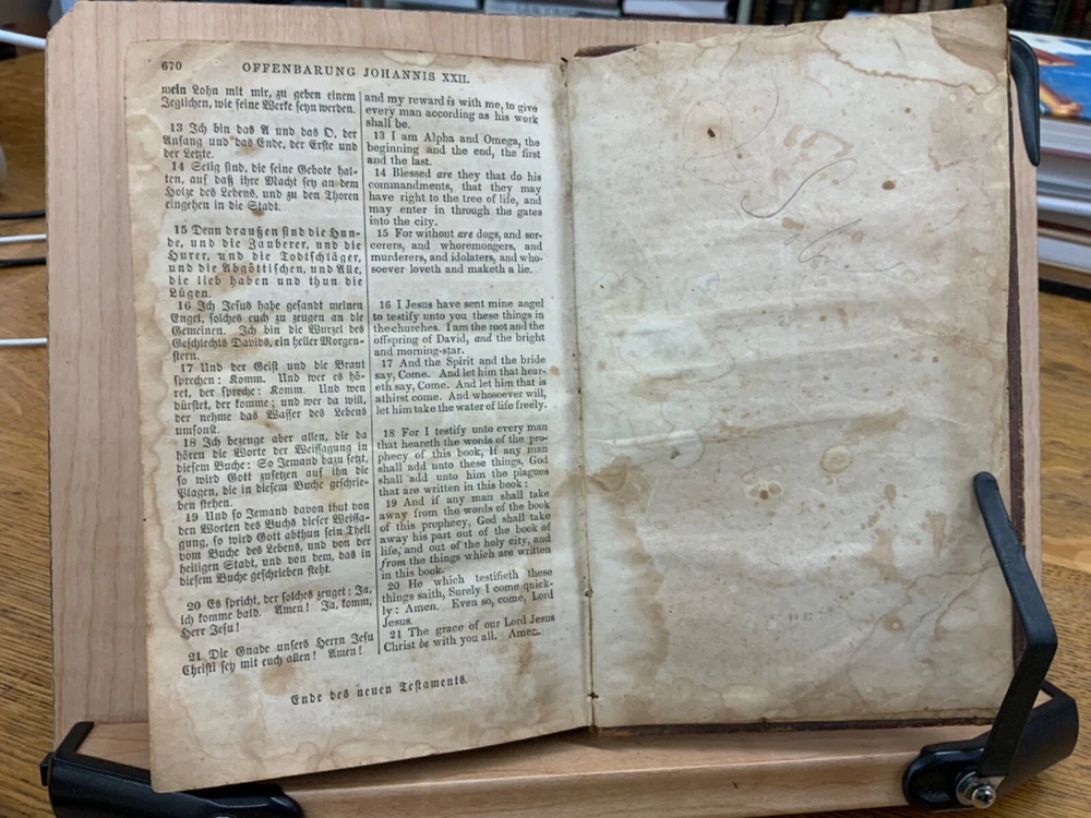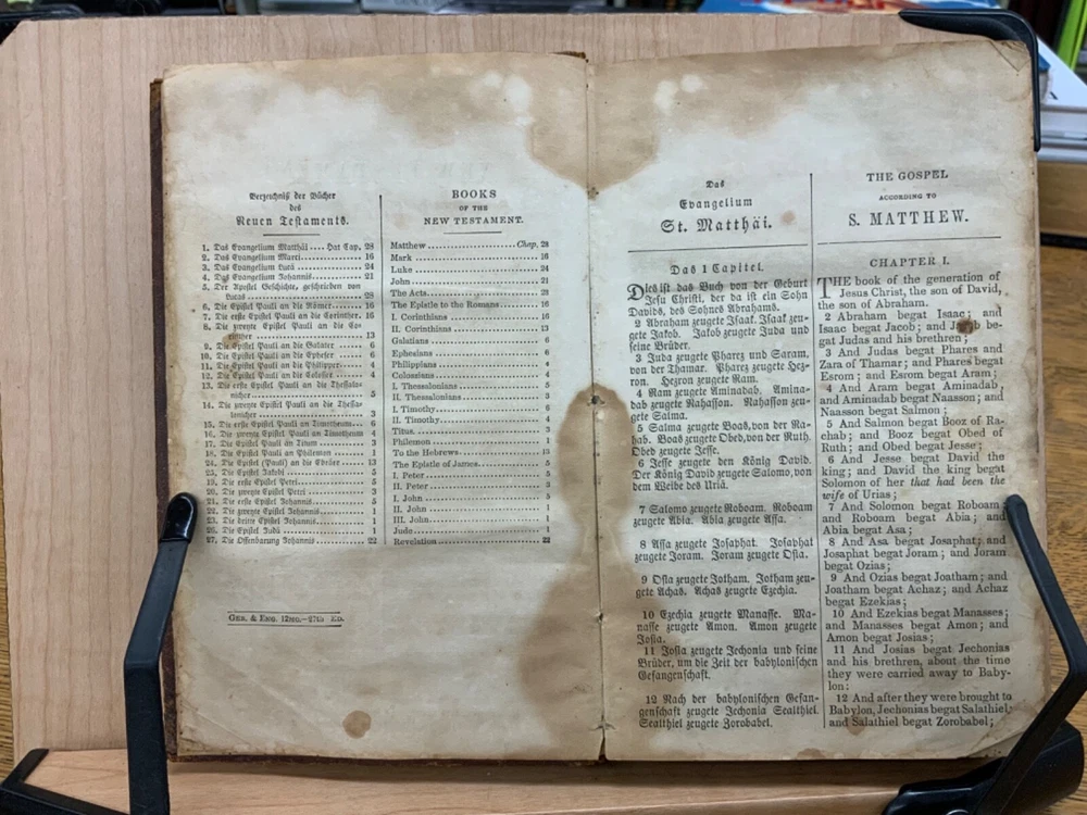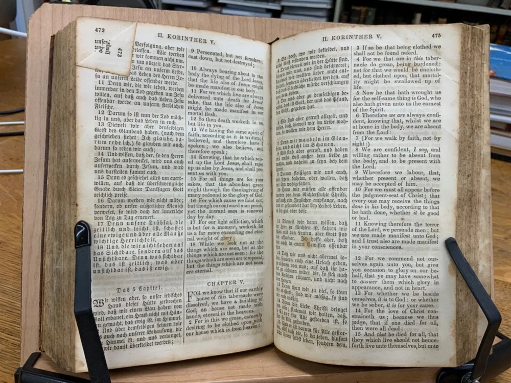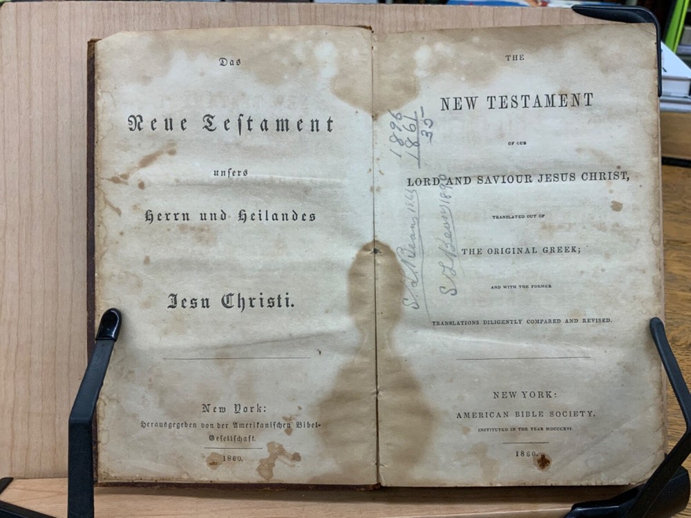 The New Testament of the Lord and Saviour Jesus Christ, Translated out of the Original Greek; and with former translations diligently compared and revised, New York: American Bible Society, 1860, stamped leather, 670 pp, 7 x 4.5”, 8vo. In fair condition. Typical wear to edges and corners of front and back boards. Stamped leather front and back boards. Gilt letter on spine slightly scuffed. Head of spine on beginning to split from boards. Cording exposed in front gutter. Writing on fore edge. Pencil signatures from past ownerships in preliminary text. Age staining throughout. Dampness staining throughout. Some chipping on pages. Slight foxing throughout textblock. Binding is intact. Please see photos. This edition of the New Testament includes bilingual parallel texts in German and English. Beautiful stamped leather. Complete text. COLR1860ABCB