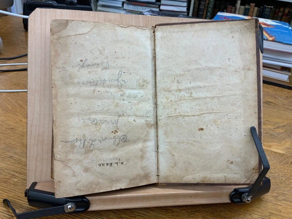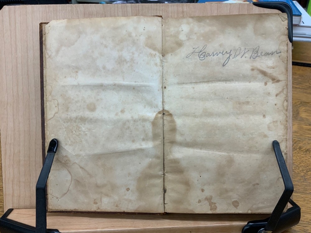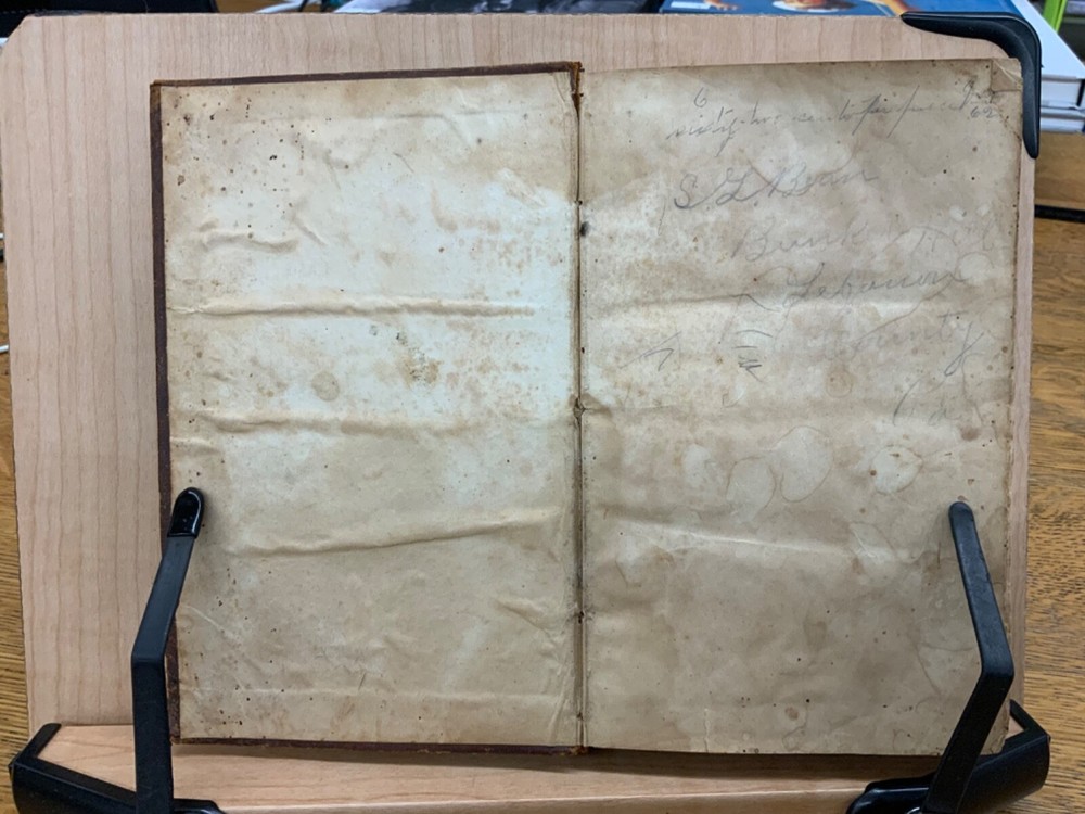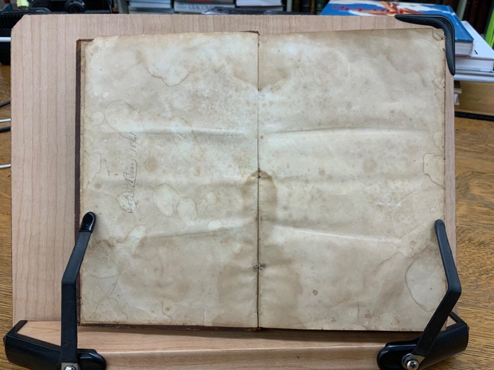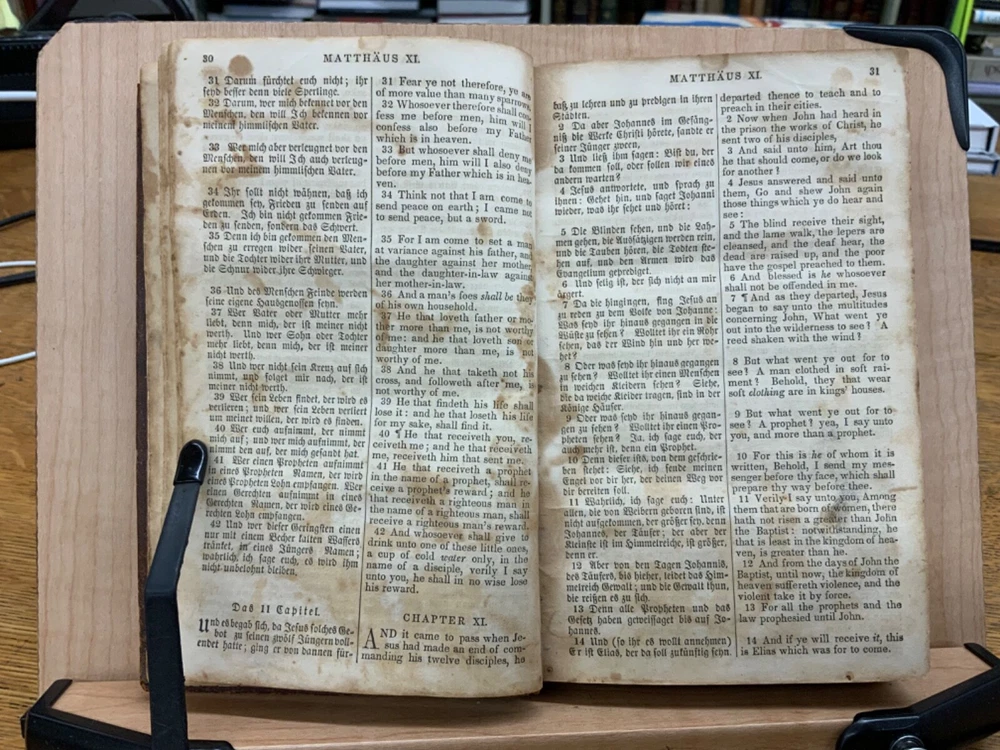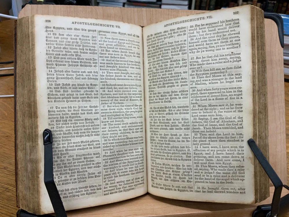 The New Testament of the Lord and Saviour Jesus Christ, Translated out of the Original Greek; and with former translations diligently compared and revised, New York: American Bible Society, 1860, stamped leather, 670 pp, 7 x 4.5”, 8vo. In fair condition. Typical wear to edges and corners of front and back boards. Stamped leather front and back boards. Gilt letter on spine slightly scuffed. Head of spine on beginning to split from boards. Cording exposed in front gutter. Writing on fore edge. Pencil signatures from past ownerships in preliminary text. Age staining throughout. Dampness staining throughout. Some chipping on pages. Slight foxing throughout textblock. Binding is intact. Please see photos. This edition of the New Testament includes bilingual parallel texts in German and English. Beautiful stamped leather. Complete text. COLR1860ABCB