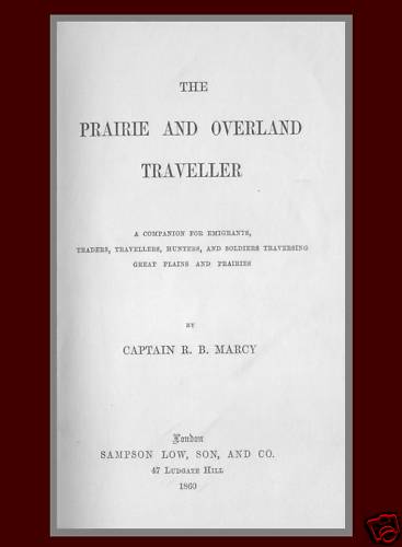 You are purchasing DIGITIZED VERSION delivered to you on CD rom of the 1st EDITION of this book. 232 pages in total. You can read it on the computer, save it or print it out for reference. The pages have not been modified, or retouched in any portion of the digitizing process. 1860 Prairie Overland Traveler by CAPTAIN R. B. MARCY A companion for emigrants, traders, travelers, hunters, and soldiers traversing Great Plains and Prairies Originally published in London, Sampson, Low, Son, and Co, 47 Ludgate Hill in 1860. A Vignette About the Author...... On April 9, 1812, Randolph Barnes Marcy was born in Greenwich, Massachussetts. Twenty years later, he graduated from the Military Academy and began a long and distinguished career in the U. S. Army. Much of this career was spent on the frontier. In 1846, he was promoted to Captain of Infantry and fought in the Mexican War at the battles of Palo Alto and Resaca de la Palma. He was then assigned to duty in the West escorting emigrants, locating military posts, exploring the wilderness and accompanying Albert S. Johnston on the expedition against Mormons in Utah. It was during this period that Capt. Marcy led his men safely from Utah to New Mexico on a forced march through the Rocky Mountains in the dead of winter, an extraordinary accomplishment made even more amazing by their shortage of provisions in the harsh weather. Shortly after his promotion to acting Inspector General of the Department of Utah, Capt. Marcy was recalled to Washington to prepare a guidebook on Western travel for the many emigrants heading west -- people poorly informed and ill-prepared for such a journey. His well-written military reports had attracted attention in Washington, and, at the direction of the Department of State, Capt. Marcy produced "The Prairie Traveler: A Hand-book for Overland Expeditions" in 1859. A bestseller in its day, the book was essential to the westward traveler, and no doubt saved many lives with its practical and experienced advice. "The Prairie Traveler" also provides a unique insight into the character and personality of the author. Capt. Marcy was extremely well-read and observant, and he was more than willing to adopt any idea that would work : "The Prairie Traveler" describes portable Indian lodges, advice from French and British medical journals, Norwegian saddling techniques, Mexican pack practices, African methods for carrying rifles while riding, and so on. He also wrote concisely and plainly, but in painstaking detail on matters most important to survival out West. His dry sense of humor, his commitment to the military and the men who served under him, and his independence and clarity in assessing people and situations all indicate the kind of military officer, and gentleman, he was. Capt. Marcy also wrote two other books describing his Western experiences, on his own initiative, but both are unfortunately long out of print. Until 1861, Capt. Marcy served as paymaster with the rank of major in the Pacific Northwest, but with the start of the Civil War, he returned East to serve as chief of staff to General George B. McClellan, who was married to Major Marcy's daughter, Mary Ellen. Before the War ended, he was appointed as one of the four Inspectors-General of the U. S. Army, and as brigadier general of volunteers. After the War, he continued to serve as inspector general, but the Senate had failed to confirm his wartime rank of general before it expired. Not until 1878, when he was appointed to brigadier general as the Inspector General of the U. S. Army, was he finally given the rank consistent with the duties he had continued to perform all that time. General Marcy returned to the West after the War (for example, he joined General Sherman on an inspection tour of Texas in the 1870s). He retired in 1881, and died six years later in West Orange, New Jersey. General Marcy left behind a legacy of extraordinary service, including the invaluable guide, "The Prairie Traveler," which provided the emigrant with essential information about westward journeys -- advice that is still sound today. His book also reminds us of the rigors and dangers faced by those early pioneers, and acquaints us with a truly remarkable man who served his country exceptionally well. And This is A Summary of the Table of Contents: CHAPTER I. The different Routes to California and Oregon. -- Their respective Advantages. -- Organization of Companies. -- Elections of Captains. -- Wagons and Teams. -- Relative Merits of Mules and Oxen. -- Stores and Provisions. -- How packed. -- Desiccated and canned Vegetables. -- Pemmican. -- Anti-scorbutics. -- Cold Flour. -- Substitutes in case of Necessity. -- Amount of Supplies. -- Clothing. -- Camp Equipage. CHAPTER II. Marching. -- Treatment of Animals. -- Water. -- Different methods of finding and purifying it. -- Journadas. -- Methods of crossing them. -- Advance and Rear Guards. -- Selection of Camp. -- Sanitary Considerations. -- Dr. Jackson's Report. -- Picket Guards. -- Stampedes. - - How to prevent them. -- Corraling Wagons. CHAPTER III. Repairing broken Wagons. -- Fording Rivers. -- Quicksand. -- Wagon Boats. -- Bull Boats. - - Crossing Packs. -- Swimming Animals. -- Marching with loose Horses. -- Herding Mules. - - Best Methods of Marching. -- Herding and guarding Animals. -- Descending Mountains. -- Storms. -- Northers. CHAPTER IV. Packing. -- Saddles. -- Mexican Method. -- Madrina, or Bellmare. -- Attachment of the Mule illustrated. -- Best Method of Packing. -- Hoppling Animals. -- Selecting Horses and Mules. -- Grama and bunch grass. -- European Saddles. -- California Saddle. -- Saddle Wounds. -- Alkali. -- Flies. -- Colic. -- Rattlesnake Bites. -- Cures for the Bite. CHAPTER V. Bivouacs. -- Tente d'Abri. -- Gutta-percha Knapsack Tent. -- Comanche Lodge. -- Sibley Tent. -- Camp Furniture. -- Litters. -- Rapid Traveling. -- Fuel. -- Making Fires. -- Fires on the Prairies. -- Jerking Meat. -- Making Lariats. -- Making 