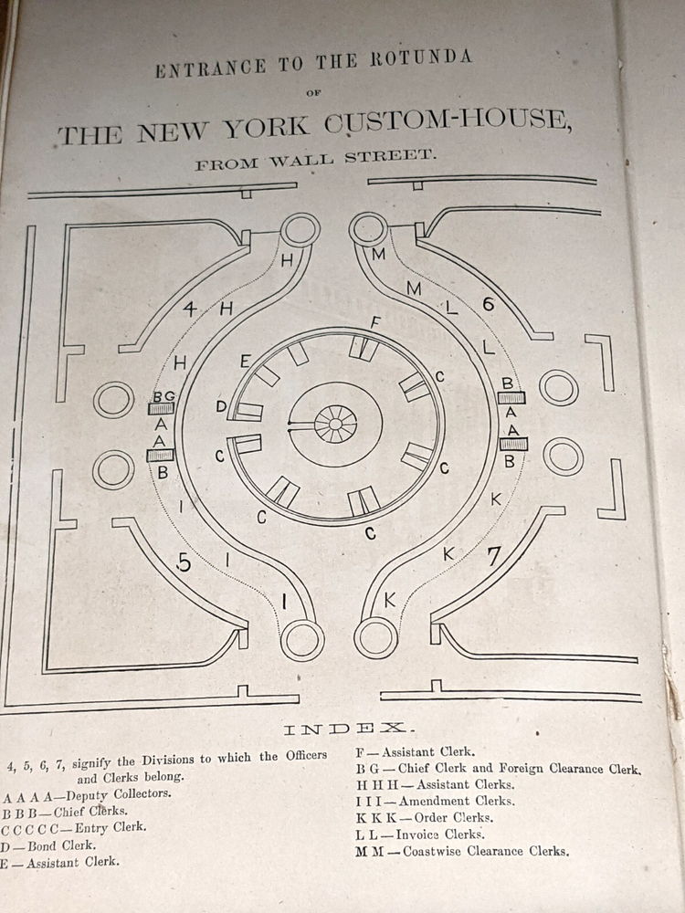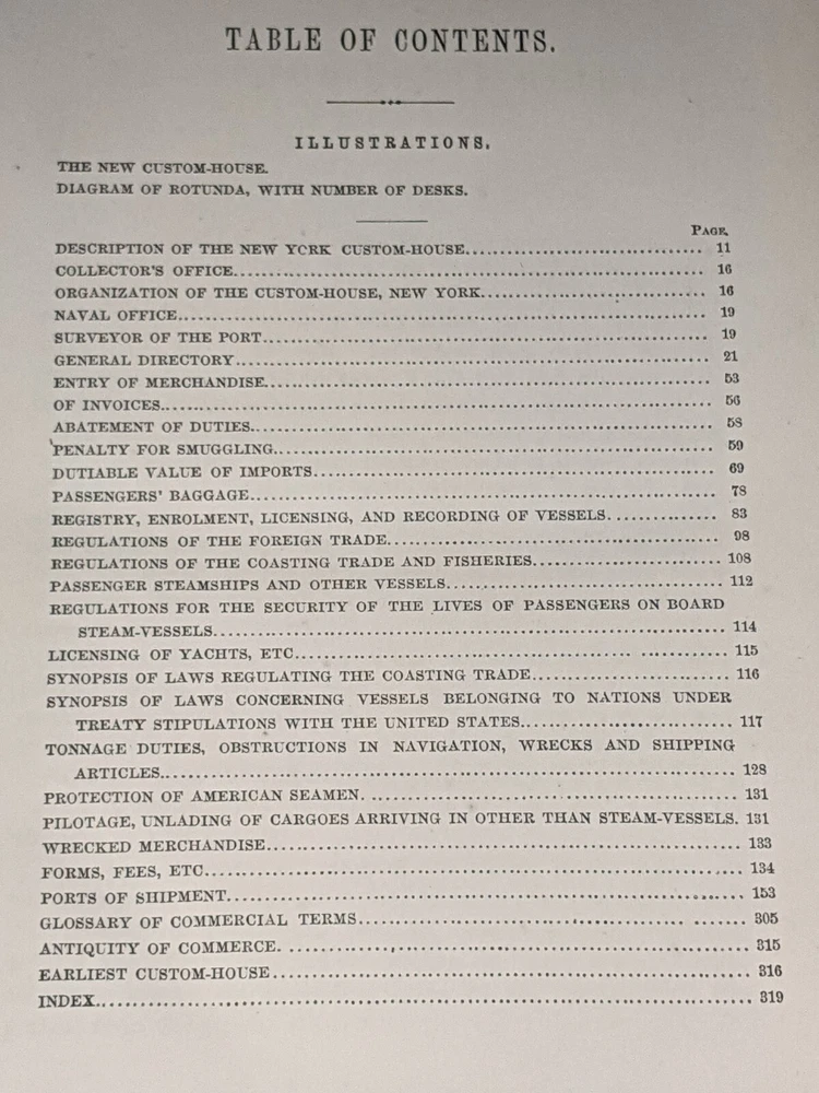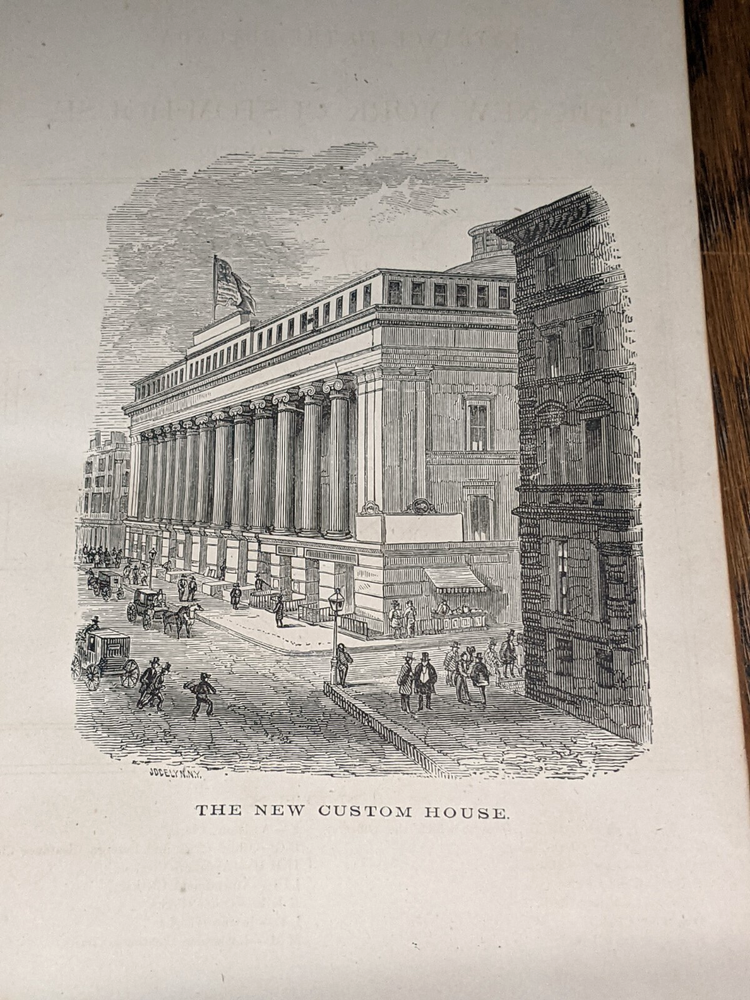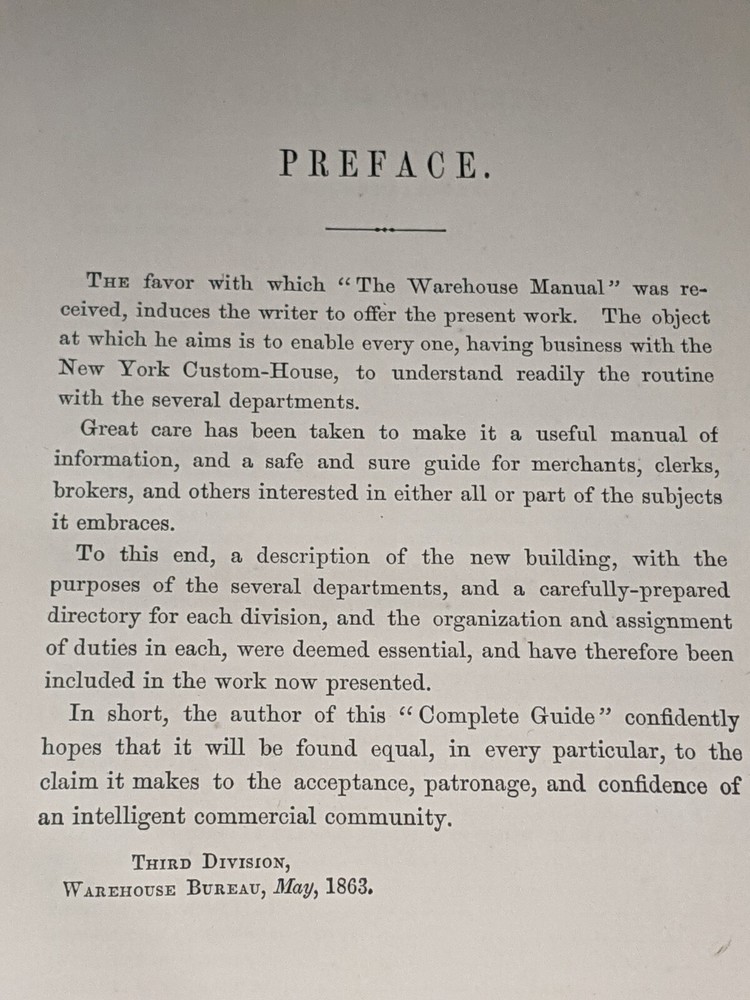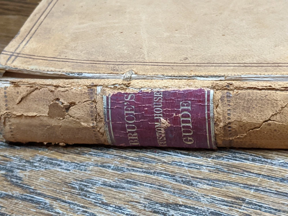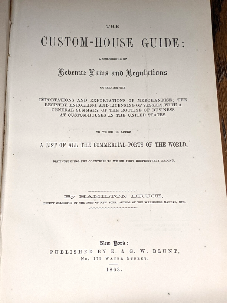 The Custom-House Guide: A Compendium Of Revenue Laws and Regulations Governing The Importations and Exportations of Merchandise; The Registry, Enrolling, and Licensing of Vessels, with a General Summary of the Routine of Business at Custom-Houses in the United States. To Which is Added A List Of All The Commercial Ports Of The World. By Hamilton Bruce. New York: Published by E. & G. W. Blunt, 1863. First Edition. Publisher's full leather covered boards. 322 pp. Illustrated with a frontispiece plan and a frontispiece engraving. Measures 9 1/4" x 6 1/4". Most rare. WorldCat lists only 1 copy in libraries worldwide. Book is in fair/good condition. Front board is detached from book. Front board displays a bend. Corners and spine tips are worn. Half of spine label is missing. Rear board loosely attached. Pages are clean & bright. No musty or loose pages. Chipping on edges of rear endpapers. Smoke-free home.