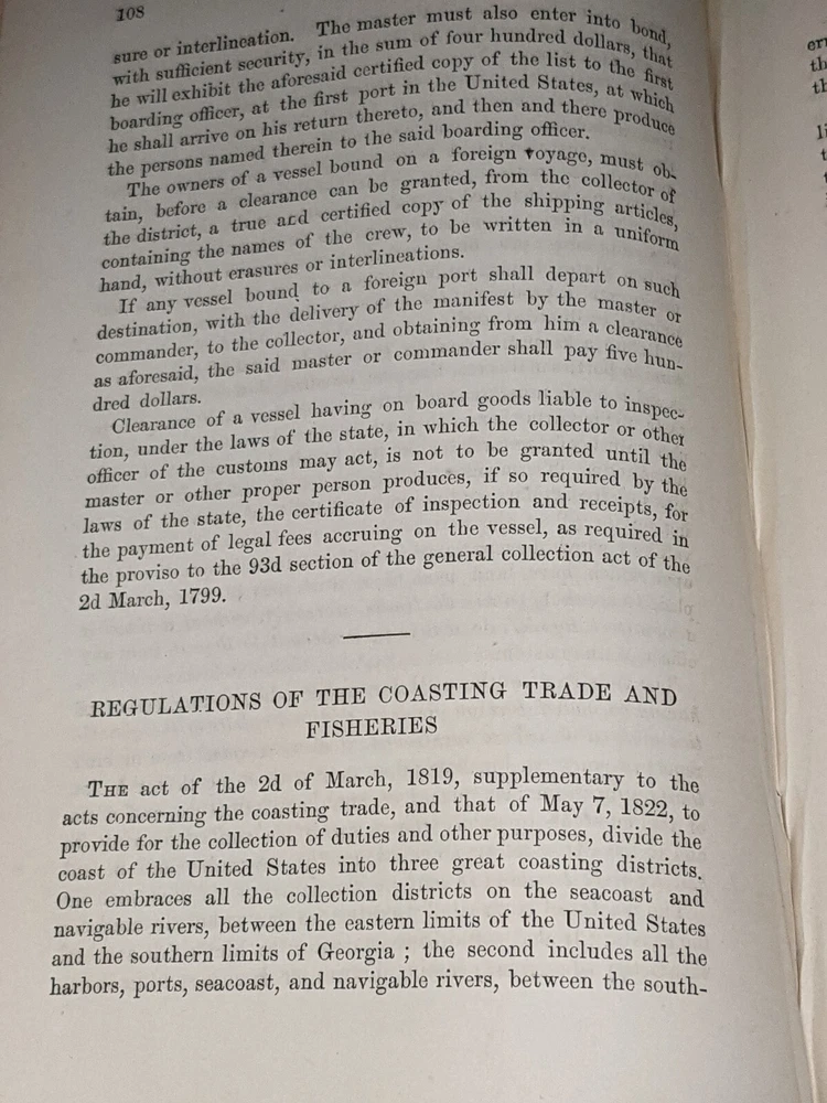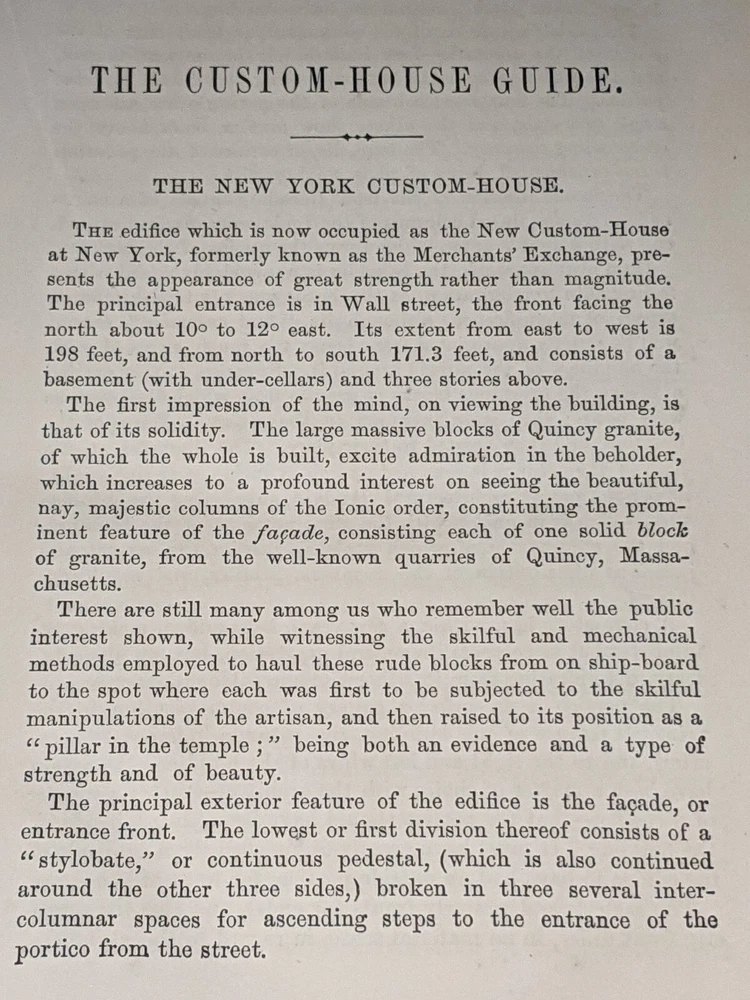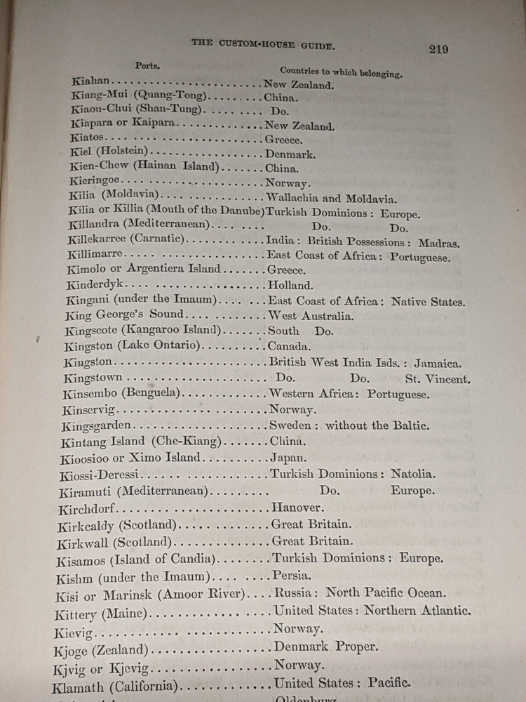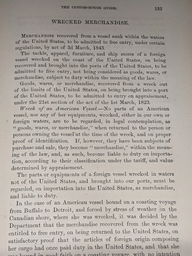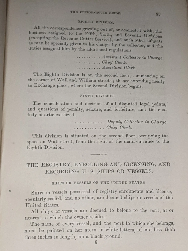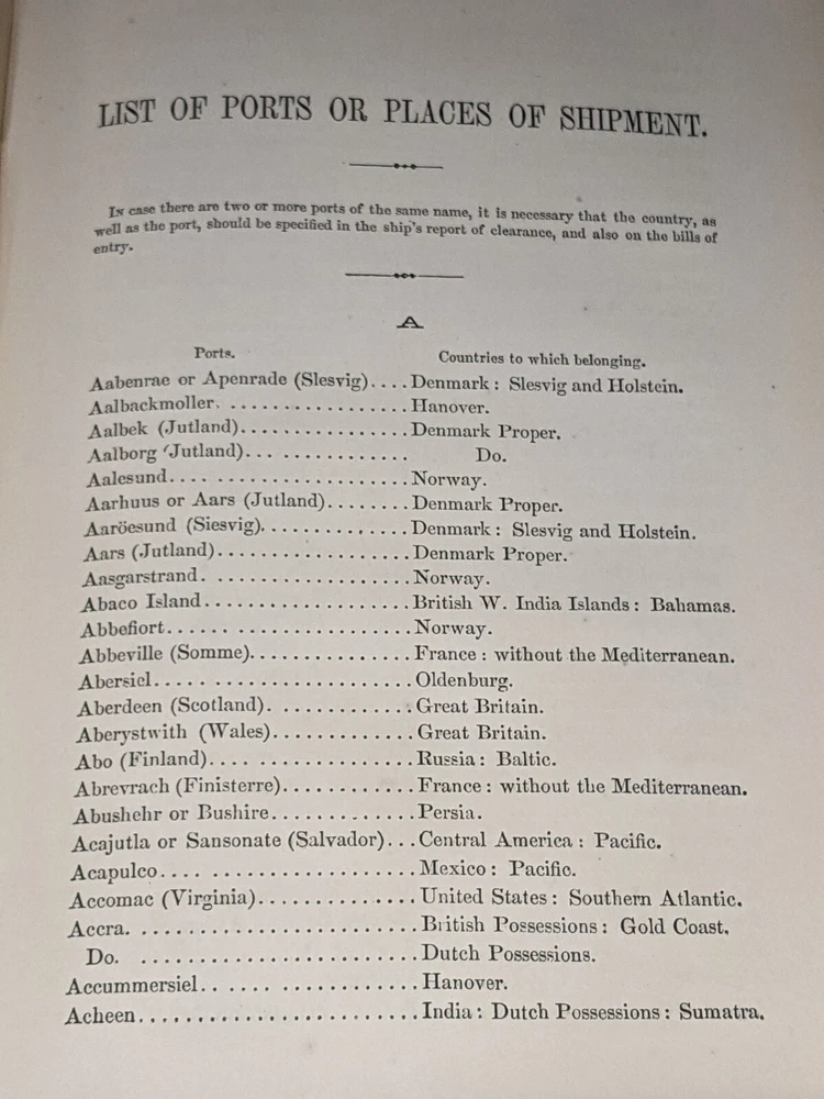 The Custom-House Guide: A Compendium Of Revenue Laws and Regulations Governing The Importations and Exportations of Merchandise; The Registry, Enrolling, and Licensing of Vessels, with a General Summary of the Routine of Business at Custom-Houses in the United States. To Which is Added A List Of All The Commercial Ports Of The World. By Hamilton Bruce. New York: Published by E. & G. W. Blunt, 1863. First Edition. Publisher's full leather covered boards. 322 pp. Illustrated with a frontispiece plan and a frontispiece engraving. Measures 9 1/4" x 6 1/4". Most rare. WorldCat lists only 1 copy in libraries worldwide. Book is in fair/good condition. Front board is detached from book. Front board displays a bend. Corners and spine tips are worn. Half of spine label is missing. Rear board loosely attached. Pages are clean & bright. No musty or loose pages. Chipping on edges of rear endpapers. Smoke-free home.