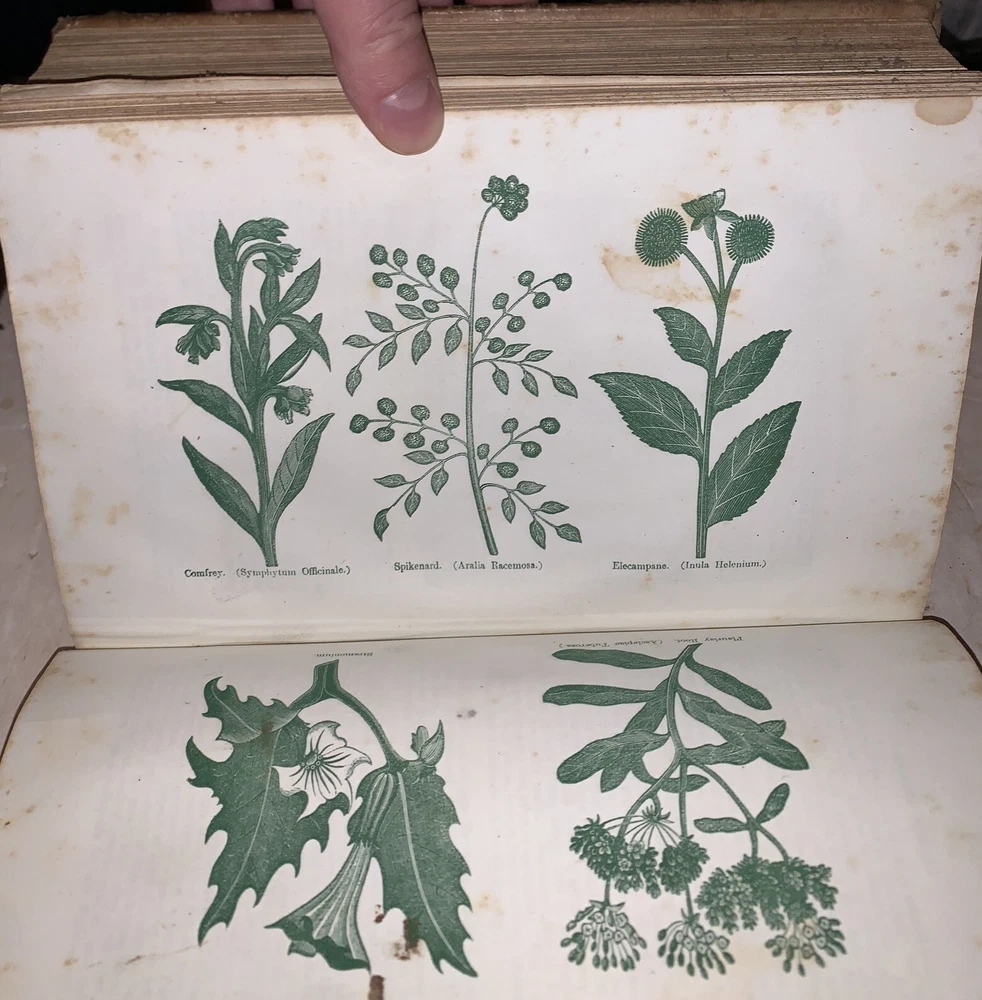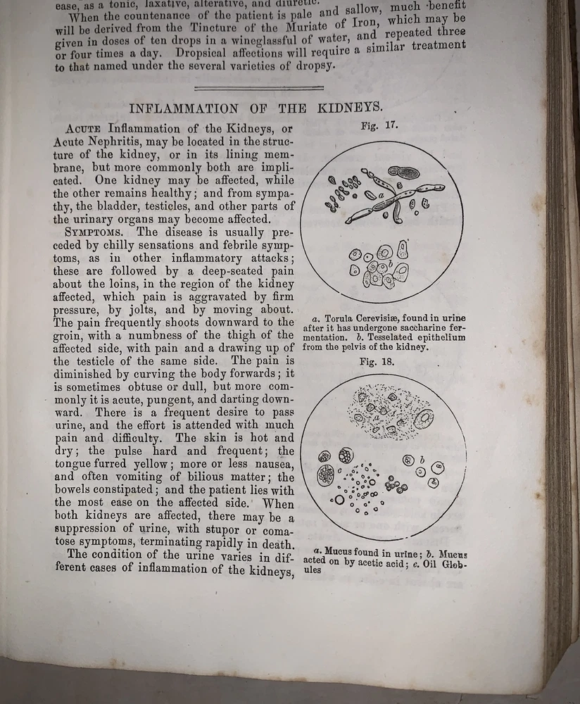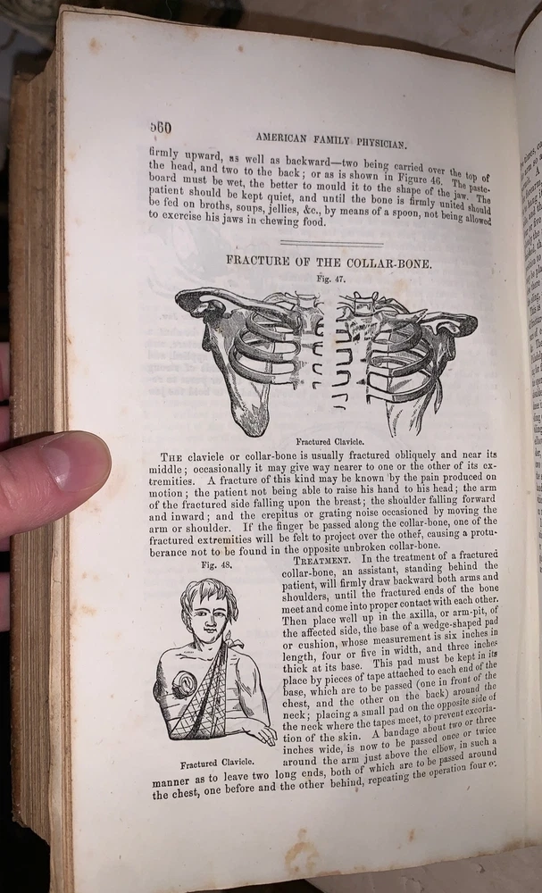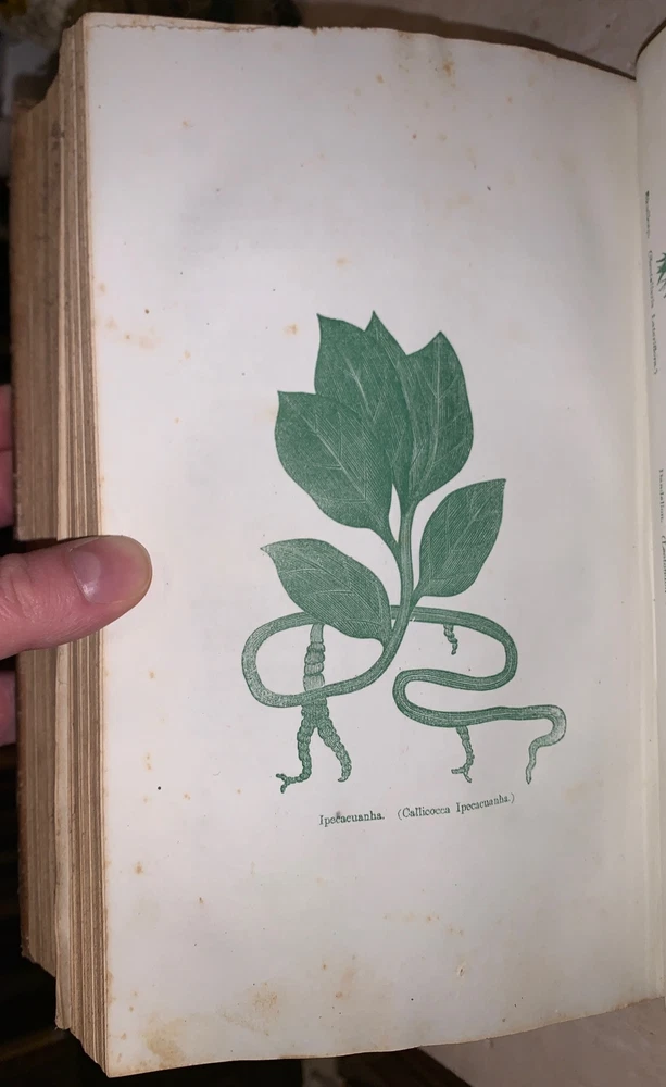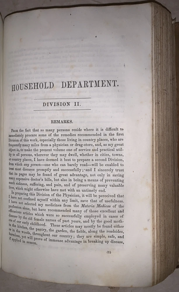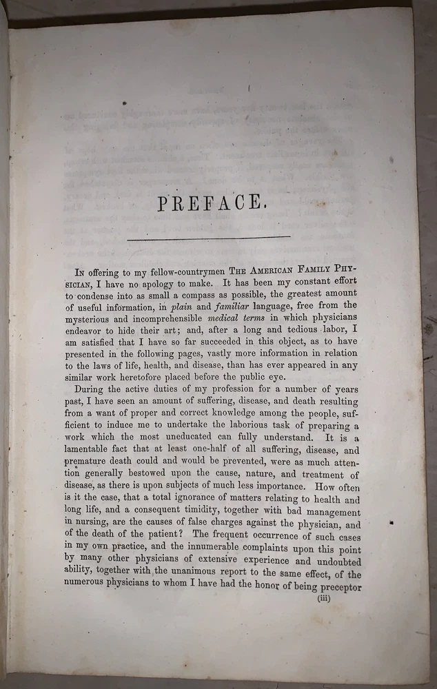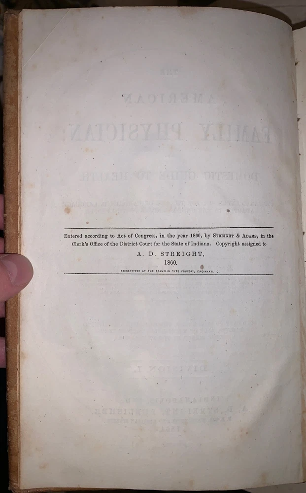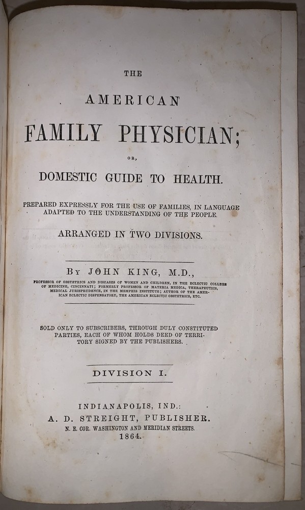 The American Family Physician; or Domestic Guide to Health - Prepared Expressly for the Use of Families, in Language Adapted to the Understanding of the People Arranged in Two Divisions (In One Volume) by John King, M.D. Sold Only to Subscribers, Through Duly Constituted Parties, Each of Whom Holds Deed of Territory Signed by the Publishers Indianapolis, Ind.: A. D. Steight 1864 Thick octavo, 794, 333, [2] pages, period full leather with gilt bands and gilt lettered labels to spine. Marbled endpapers. A few illustrations. Some rubbing and wear, damage to spine, front hinge cracked, foxing and discoloration, a couple of pages are a little loose, else in good condition. If you have any questions, feel free to ask and don't forget to check out my other listings.
