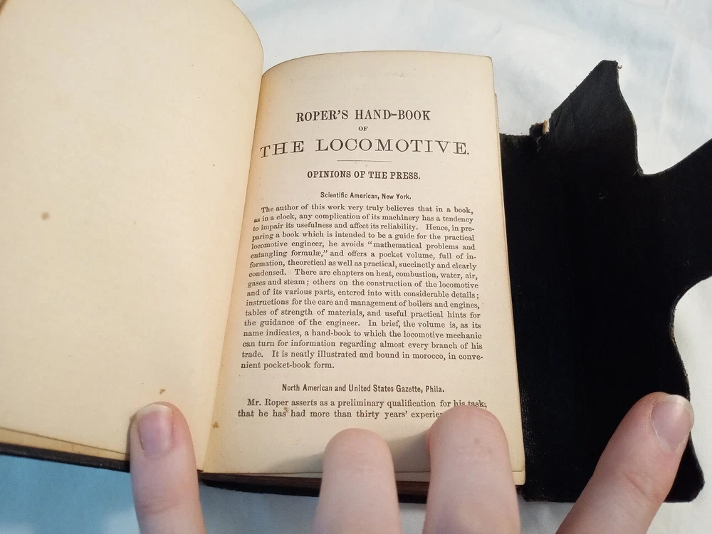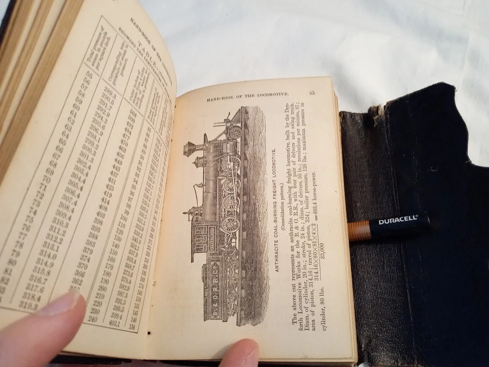 Handbook of the Locomotive by Stephen Roper . Printed Phila, 1883,11th ed. 324 pp., illustrated, indexed. 70 pp. ads in back. Gilt edged pages, bound in black leather with gilt stamped images of steam locomotives. The title page reads: Hand-Book of the Locomotive, Including the Construction, Running, and Management of Locomotive Engines and Boilers With Illustrations, by Stephen Roper, Engineer, etc. Please see photos, they serve as my description of the item. A worn but sturdy copy, most are, this has been well taken care of given it is 140+ years old. filled with detailed informative text, assorted illustrations, charts, tables, examples, etc. A very thorough guide to the world of locomotives. Terms: Payment via Paypal, due upon purchase. Free media rate shipping, but to US addresses only. NY addresses charged 7% sales tax. All items shipped within 1-2 days of payment (we strive for next day). All items returnable for any reason for 30 days, if returned in same condition as sent out. Buyer pays return shipping. Thanks for looking!