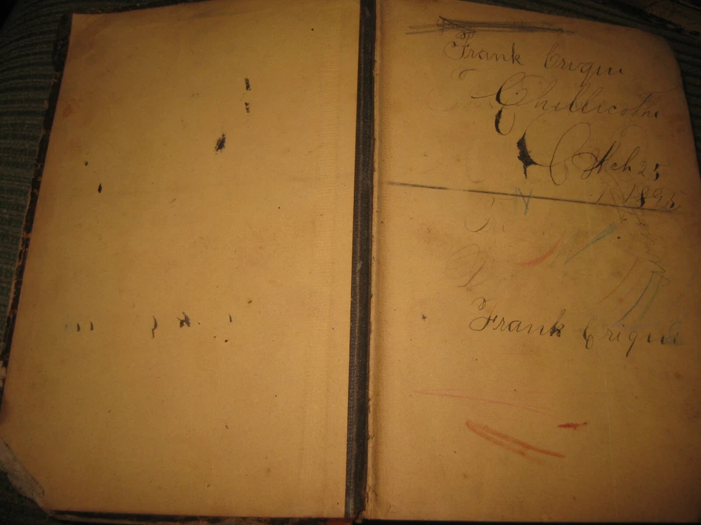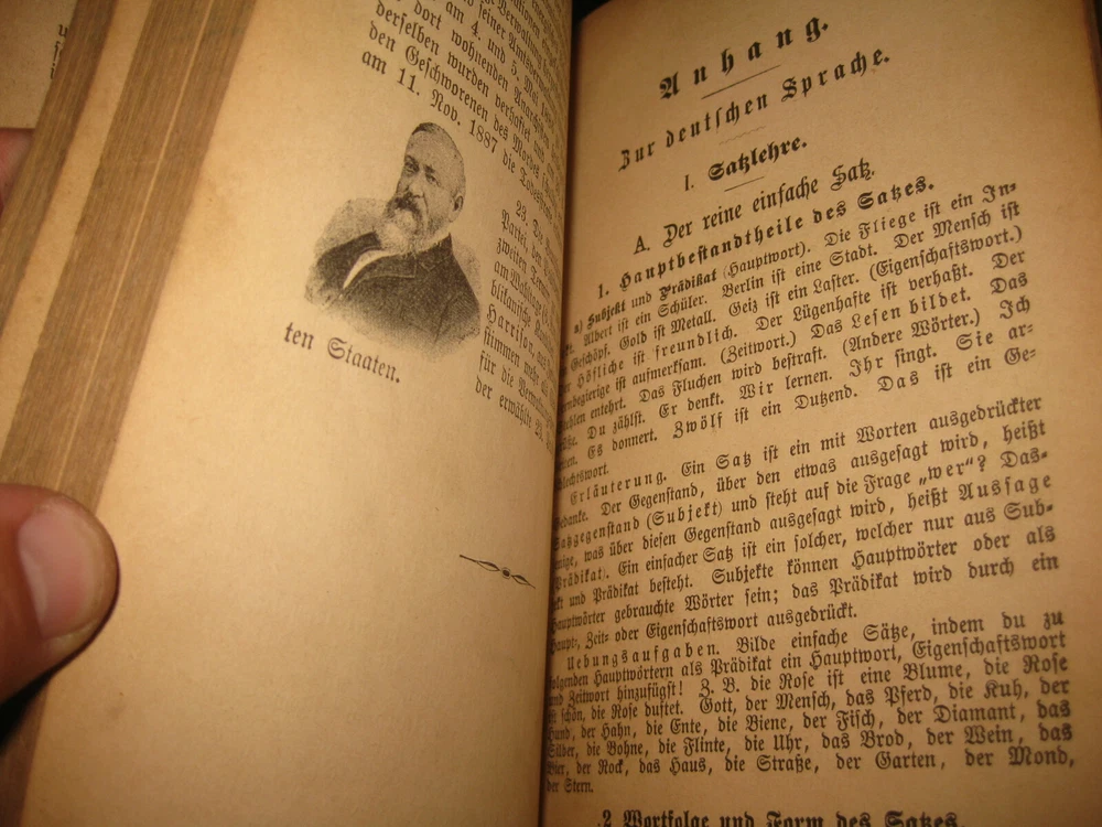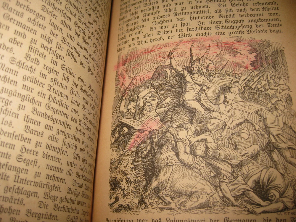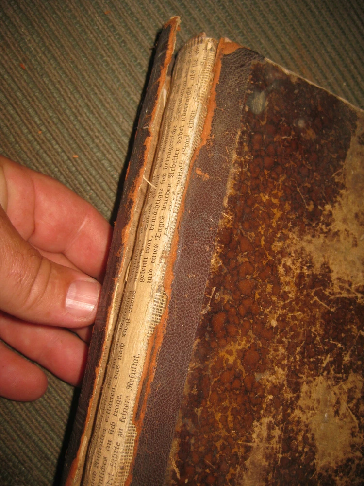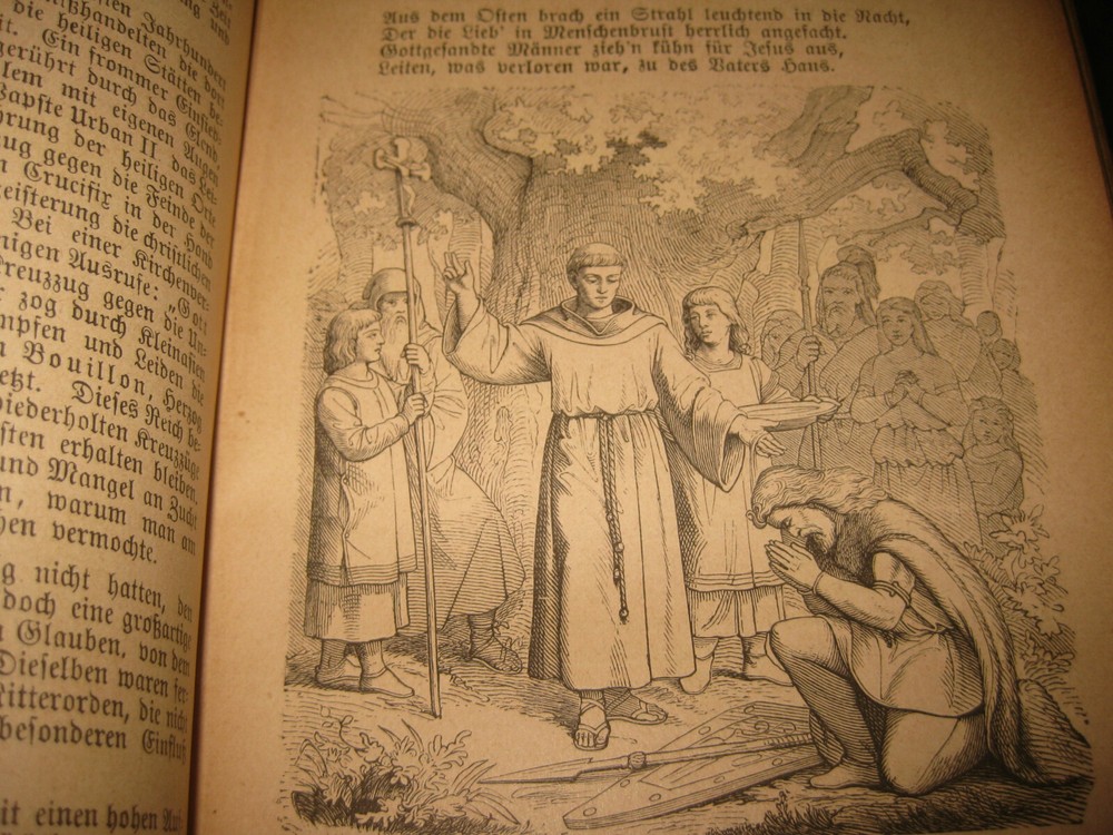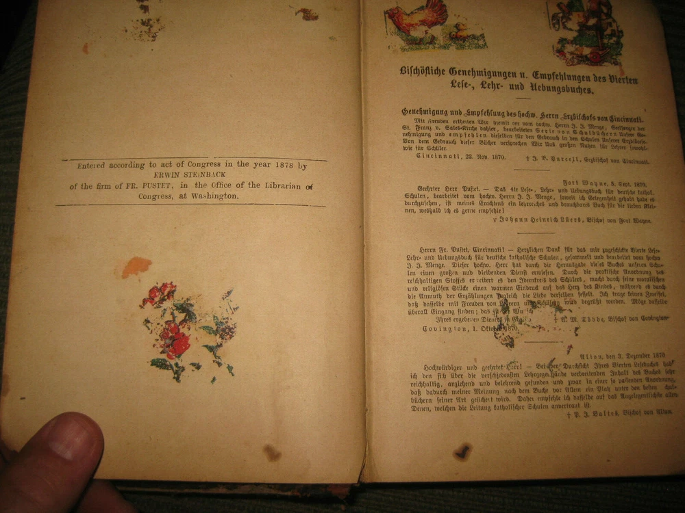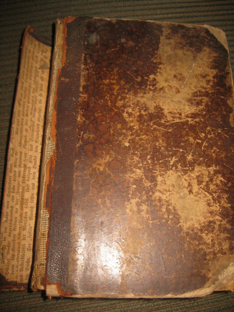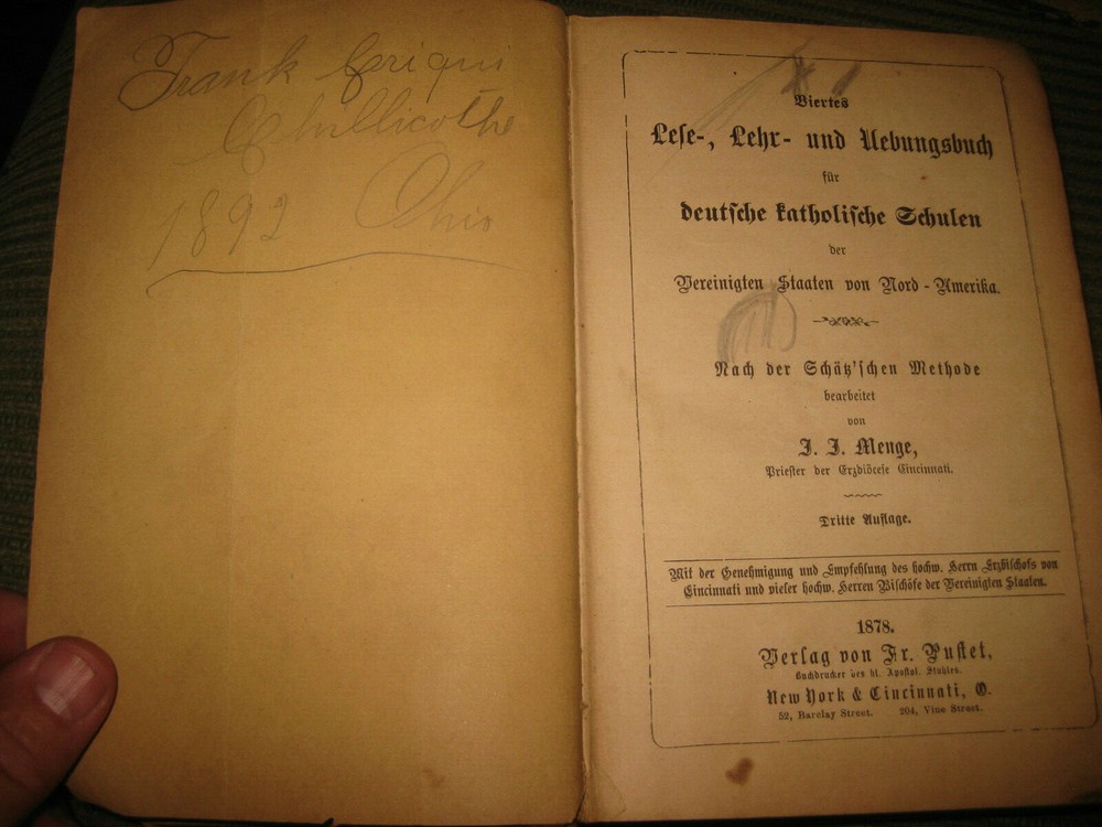 1878 Leather bound gothic German language Catholic school textbook exercise book for North America..illustrated..in fair shape for its age, has edge wear, discoloration, and cracked leather binding edge but all pages bound and a few scattered markings..German language..,in fair condition considering its age... ..