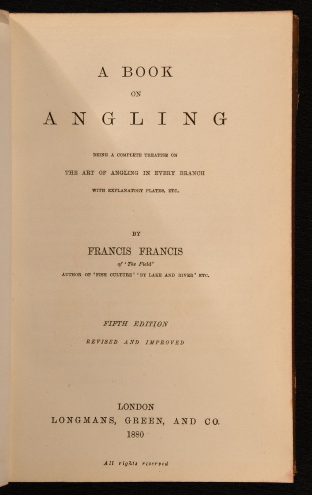 Click here to see our other books! A Book on Angling: Being a Complete Treatise on the Art of Angling in Every Branch Francis Francis 1880 Longmans, Green, and Co. : London 7.5" by 5" xiii, 516pp. SUMMARY A smart fifth edition of this illustrated guide to angling from English writer Francis Francis. Illustrated,Leather Binding Overall Condition: Very Good This book weighs 0.75 KG when packed UK Postage: £ 3.99 US Postage: £ 19.99 EU Postage : £ 15.99 European Postage: £ 16.99 Asia Postage: £ 21.99 Worldwide Postage: £ 25.99 DESCRIPTION Fifth edition. Illustrated with a frontispiece and sixteen plates. Collated complete. A treatise on the art of angling, with chapters on bottom-fishing, midwater-fishing, artificial fly-fishing, lake-fishing, spinning for trout, the salmon, tackle-making, and fly-dressing. Written by Francis Francis, an English writer on angling who was angling editor of The Field for more than a quarter of a century. CONDITION Bound in half calf with cloth covered boards. Externally, smart with rubbing to the extremities and light fading to the spine. The odd small mark to the boards. Internally, firmly bound. Pages are very bright and clean with minor age toning to the endpapers. Overall Condition: Very Good GLOSSARY OF TERMS Overall Condition (Dustwrapper condition rating is shown after that for the book itself, where a dustwrapper is present) Fine - Very well preserved copy showing very little wear Very Good Indeed - Only one or two minor faults, really a very attractive copy Very Good - Quite a wide term meaning no major faults but probably several smaller ones often expected given the age of the book, but still a respectable copy Good - Meaning not very good. Some more serious faults as will be described in the condition report under 'condition' Good Only - Meaning one or more faults that could really do with repair Fair - As with good only above but with other faults leaving a compromised copy even after repair Poor - Really bad and possibly seriously incomplete. We only sell books in this condition where their rarity or value makes them attractive none the less. Major defects will be described. GUARANTEE We offer a full money back guarantee on our descriptions. Please ask for details and conditions. We prefer PAYPAL. If you pay via PAYPAL we will post the item off the same or the next working day with the postage you have selected. Please note we cannot accept USD cheques