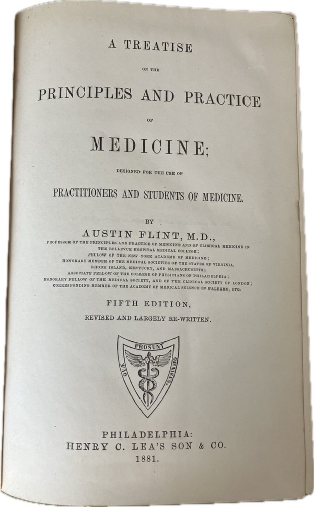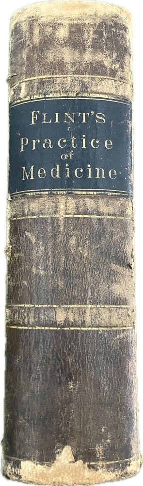 “A Treatise on the Principles and Practice of Medicine; Designed for the Use of Practitioners and Students of Medicine” by Austin Flint M.D. Philadelphia: Henry C. Lea, 1881. Fifth Edition. Covers exhibit wear but binding is tight. Pages are clean. Good condition.