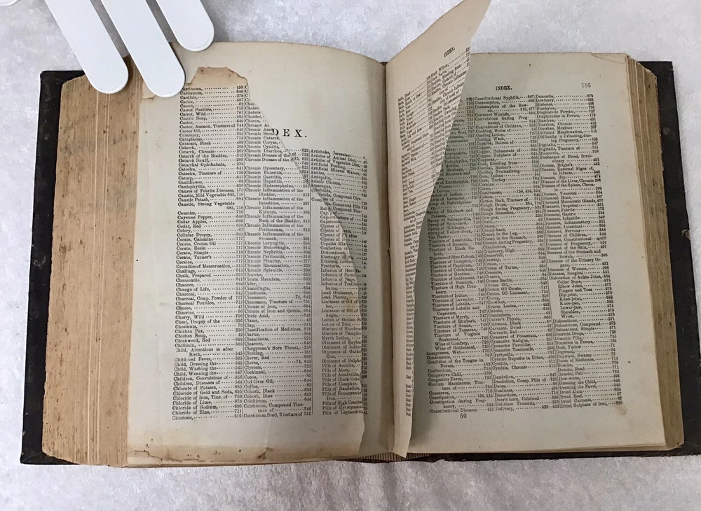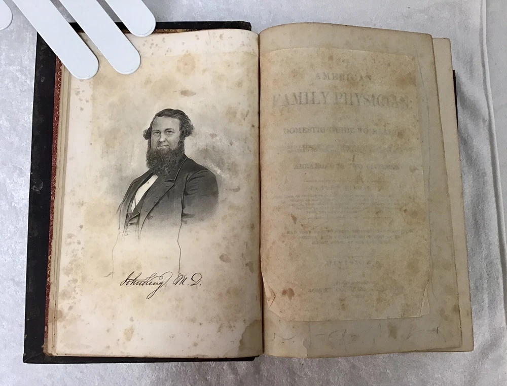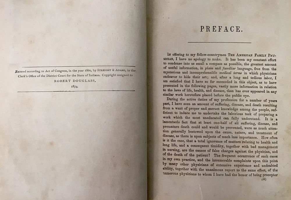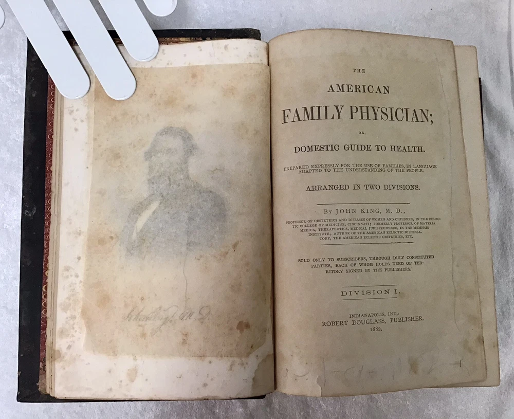 Donated to our Friends of the Library group by a patron, NOT Ex-library. TITLE, PUBLICATION, CONDITION: THE AMERICAN FAMILY PHYSICIAN; OR, DOMESTIC GUIDE TO HEALTH. PREPARED EXPRESSLY FOR THE USE OF FAMILIES, IN LANGUAGE ADAPTED TO THE UNDERSTANDING OF THE PEOPLE. ARRANGED IN TWO DIVISIONS, By JOHN KING, M. D., PROFESSOR OF OBSTETRICS AND DISEASES OF WOMEN AND CHILDREN, IN THE ECLECTIC COLLEGE OF MEDICINE, CINCINNATI; FORMERLY PROFESSOR OF MATERIA MEDICA, THERAPEUTICS, MEDICAL JURISPRUDENCE, IN THE MEMPHIS INSTITUTE; AUTHOR OF THE AMERICAN ECLECTIC DISPENSATORY, THE AMERICAN ECLECTIC OBSTETRICS, ETC, SOLD ONLY TO SUBSCRIBERS, THROUGH DULY CONSTITUTED PARTIES, EACH OF WHOM HOLDS DEED OF TERRITORY SIGNED BY THE PUBLISHERS, DIVISION I. INDIANAPOLIS, IND: ROBERT DOUGLASS, PUBLISHER. 1882, Entered according to Act of Congress, in the year 1860, by STREIGHT & ADAMS, in the Clerk's Office of the District Court for the State of Indiana. Copyright assigned to ROBERT DOUGLASS, 1874. Antique acceptable. Stained pages, rubbed covers, taped repair to head of outer spine, one page torn in half but present. Some other minor tears. Previous owner name in pencil on front free end paper. Back marbled ffe paper missing. Beautifully drawn illustrations. WAIT...There's More... Be sure to mark PikesPeakLibraryFriends as a favorite seller!! You'll be notified of more great items like this as soon as they become available. Please carefully examine our photos as they provide an integral part of our condition description. We are happy to provide more pictures upon request. Your purchase helps our nonprofit 501(c)3 organization support the programs, events and staff of our award-winning local public library district. Thank you! We ship on the same or next business day upon receipt of payment. ****Friends nameplate not included*** Shelf