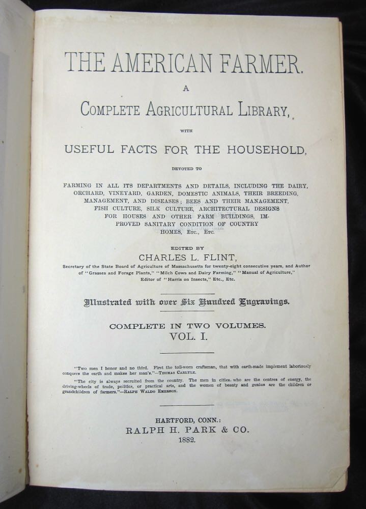 Astounding, richly illustrated and extraordinarily detailed 1882 ANTIQUE AMERICAN FARMING GUIDE, fully embodying Victorian Era Farming Technology, in fine leather bindings. This two volume treatise describes and illustrates a diversity of Agricultural subjects, methods and tools, including Victorian Era Cotton Farming, Bee Keeping, Farm Machinery, Horses, Barn Design and Building, and many other subjects. THE AMERICAN FARMER A COMPLETE AGRICULTURAL LIBRARY WITH USEFUL FACTS FOR THE HOUSEHOLD Original 1882 First Edition of “The American Farmer. A Complete Agricultural Library with Useful Facts for the Household” by Charles L Flint :: Published by Hartford: Ralph H. Park and Co. :: Measures 8 x 11" :: Complete with 851 pages vol. I / 1033 pages vol. II. Very Good CONDITION: firmly bound, firm hinges, generally clean with some foxing and a few closed tears. Complete with all pages. Overall a great, solid example of a scarce and uniquely American book set. G et ready, because you will immerse yourself in this original 1882 illustrated treatise for American Farmers, presented in a very attractive black leather bound complete set spanning 1050 pages of important information for homesteaders and commercial farmers. These books richly describe and illustrate a variety of topics including domestic animal handling, domestic economy, farm buildings, gardens, orchards, vineyards, crops, tools, fences, and much, much more. Both volumes are illustrated throughout with a total of more than 600 fine engravings. T his work was designed to embody the most practical information upon agriculture, the results of scientific investigation in the laboratory, and of experimental discoveries in the field, so fully as to make it unnecessary to purchase many books on special topics. This collection's editor,Charles L Flint, was cofounder and first Secretary of the Massachusetts Board of Agriculture, a lecturer in cattle and dairy farming, and the first secretary of the Massachusetts Agricultural College Board of Trustees. The systematic arrangement of this work into Parts and Departments, with Sub-headings, greatly adds to its utility by making it convenient for ready reference, and invaluable, if not indispensable, to all farmers, and those interested in general agriculture, as well as to fanciers of fine stock of whatever variety or breed. Notable contents include: Domestic Animals Small Animals and Insects The Farmery Domestic Economy Raising Horses The Garden and its Fruits The Orchard Gardening Cerealia The Grasses, Their Cultivation and Use Roads and Roads Making Bee Keeping and making honey Root Crops and Sugar Crops Forests and Fences Fertilization Irrigation—Draining—Plowing—Farming Tools Building Farms and Farm Buildings Recipes for Cooking T hese books are surviving relics of America's past, espousing the essential American virtues of farming, farm-building, crop management and animal husbandry. Many of the contents covered can be viewed as a time capsule illuminating a bygone era, while many other teachings within these books are of enduring relevance to modern farmers and historians alike. Shipping for these very heavy volumes (over one thousand pages, large format) is unfortunately costly, but with the starting bid price here, plus shipping, these are starting considerably less than I paid, and far less than the real market value.