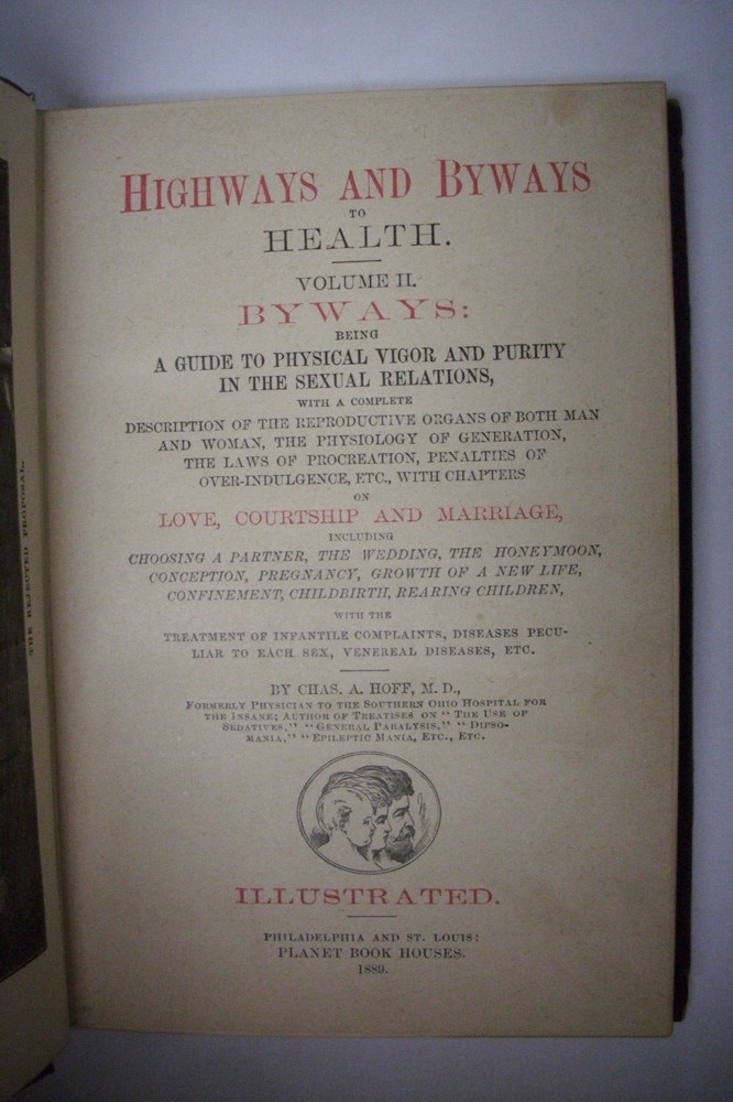 You are bidding on an amazing antique hardcover book! It covers so many topics that were considered taboo and secretive in the Victorian age! You are bidding on a hardcover book titled Highways and Byways To Health - Byways: Being a Guide To Physical Vigor and Purity in the Sexual Relations, With a Complete Description of the Reproductive Organs of Both Man and Woman, the Physiology of Generation, the Laws of Procreation, Penalties of Over-Indulgence, Etc., with chapters on Love, Courtship and Marriage, Choosing a Partner, the Wedding, the Honeymoon, Conception, Pregnancy, Growth of a New Life, Confinement, Childbirth, Rearing Children, with the Treatment of Infantile Complaints, Diseases Peculiar to Each Sex, Venereal Diseases, Etc. By Chas. A. Hoff. Book has many illustrations. Published by Planet Book Houses, 1889. This is the scarce and collectible First Edition. The book came from a series of books about health, but this title is complete in this one volume. This is an extremely rare book! This is a great opportunity to learn the thoughts and morals of the people regarding sexuality, marriage, etc. during the 1880's. Book is quarter-bound in red leather with leather tips. Spine has gold lettering. The covers are firmly attached with no cracking or splitting of hinges. The corners of covers are worn through. All pages clean and tightly bound. Has decorative endpages. No writing in book and no signs of previous ownership. The book is in near-very good condition. Very rare and collectible! Check your collection; you probably don't have this super rare book. Would make a super addition to a collection. Great gift idea! (Inventory: 58F) Track Page Views With Auctiva's FREE Counter