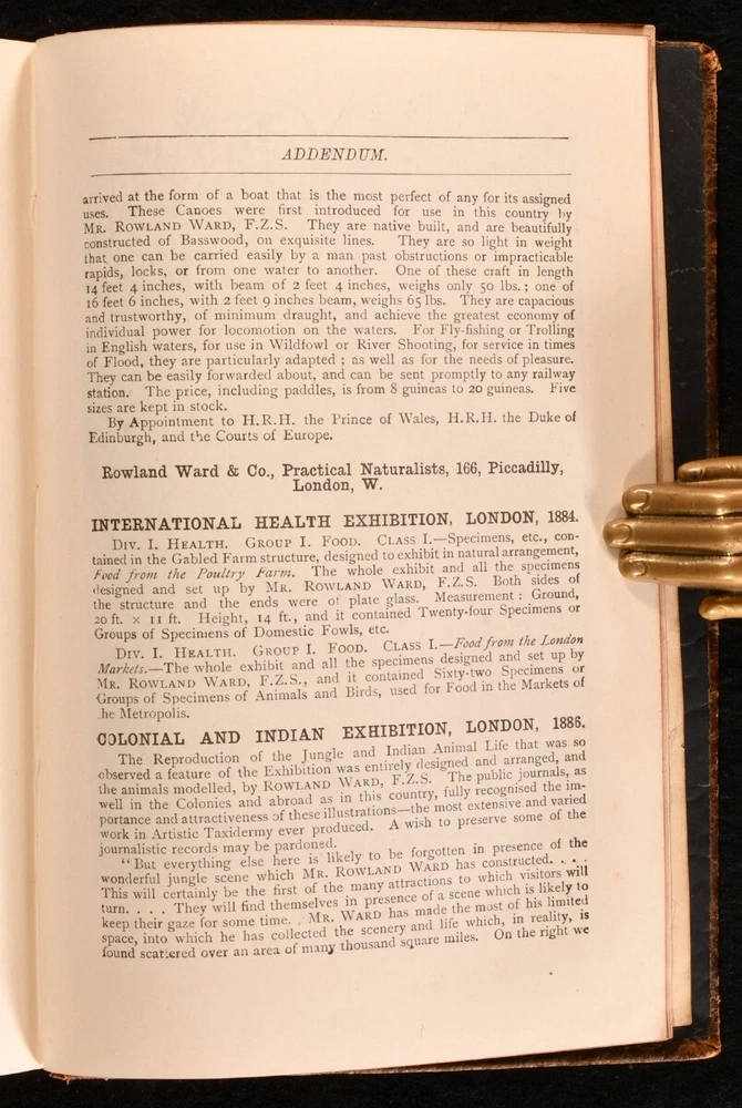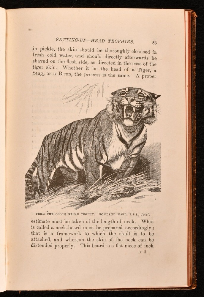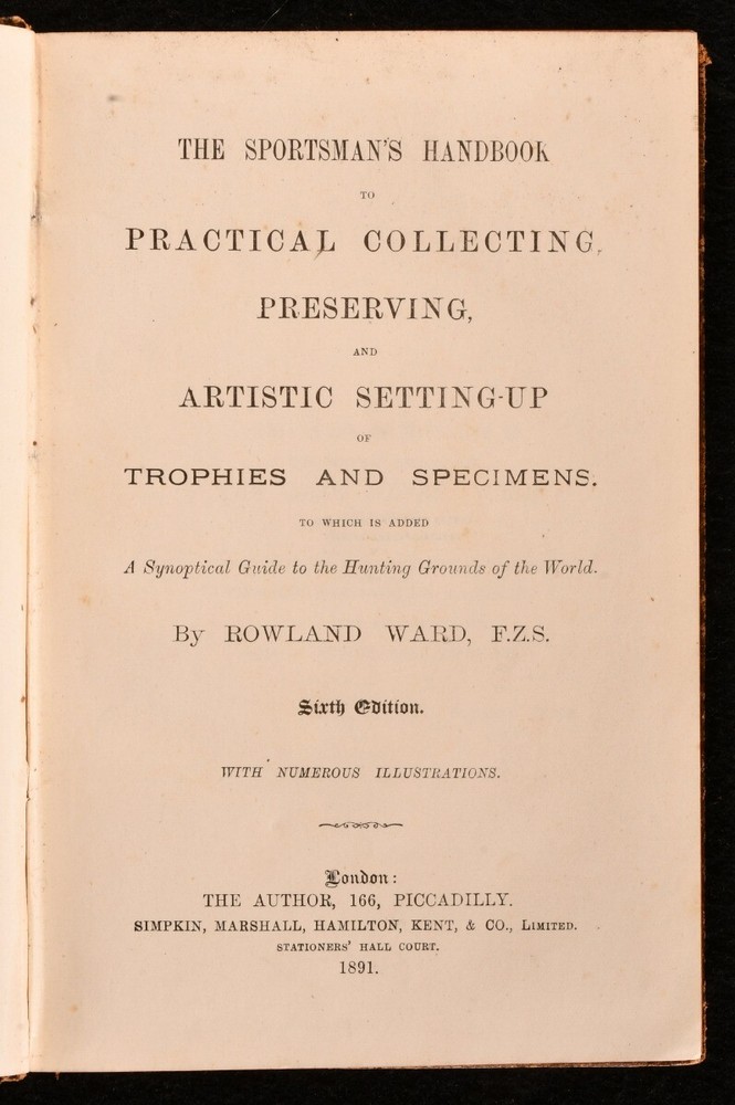 Click here to see our other books! The Sportsman's Handbook Rowland Ward 1891 Simpkin, Marshall, Hamilton, Kent, & Co. : London 7.5" by 5" [7], viii-xii, 145, [27]pp SUMMARY A leather bound guide to collecting and preserving big-game trophies, written by taxidermist Rowland Ward, with numerous in-text illustrations and one folding plate. Early Edition,Illustrated,Leather Binding Overall Condition: Good This book weighs 0.5 KG when packed UK Postage: £ 3.99 US Postage: £ 15.99 EU Postage : £ 13.99 European Postage: £ 14.99 Asia Postage: £ 18.99 Worldwide Postage: £ 19.99 DESCRIPTION Sixth Edition. Bound in a full textured leather binding, with a gilt illustration on board and spine. Illustrations include various in-text illustrations and one folding plate, which depicts a tiger skin. This is a 'sportsman's handbook' to preserving big-game trophies, with additional added information on 'the hunting grounds of the world'. Contents include 'General Observations for the Collector', 'Processes of Preservation', 'Skinning and Preparation', 'Artistic Setting-Up of Trophies', and 'Setting-Up Large Game'. This edition also includes a well illustrated addendum. Rowland Ward (1848-1912) was a British taxidermist and founder of Rowland War Limited of Piccadilly. His business specialised in taxidermy, particularly, the taxidermy of birds and big-game trophies. Four pages of publisher's adverts to the rear of text. With prior owner's sketches to rear endpaper, where they have drawn pictures of stag heads. Collated, complete. CONDITION Bound in a full-leather binding. Externally, generally smart. Wear to the extremities and the spine. Beginning of loss to the tail of spine, where the leather is cracking and breaking away from the binding. Internally, firmly bound, with binding loosening a bit more towards the middle of text. Pages are bright and clean, with light age-toning to pages and the odd spot. Overall Condition: Good GLOSSARY OF TERMS Overall Condition (Dustwrapper condition rating is shown after that for the book itself, where a dustwrapper is present) Fine - Very well preserved copy showing very little wear Very Good Indeed - Only one or two minor faults, really a very attractive copy Very Good - Quite a wide term meaning no major faults but probably several smaller ones often expected given the age of the book, but still a respectable copy Good - Meaning not very good. Some more serious faults as will be described in the condition report under 'condition' Good Only - Meaning one or more faults that could really do with repair Fair - As with good only above but with other faults leaving a compromised copy even after repair Poor - Really bad and possibly seriously incomplete. We only sell books in this condition where their rarity or value makes them attractive none the less. Major defects will be described. GUARANTEE We offer a full money back guarantee on our descriptions. Please ask for details and conditions. We prefer PAYPAL. If you pay via PAYPAL we will post the item off the same or the next working day with the postage you have selected. Please note we cannot accept USD cheques