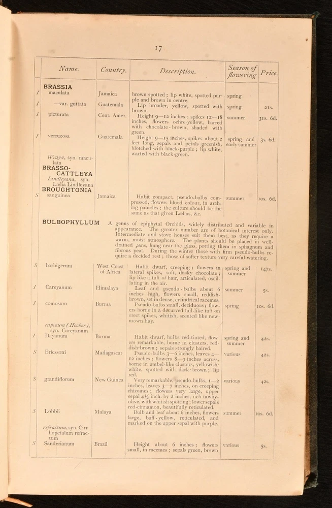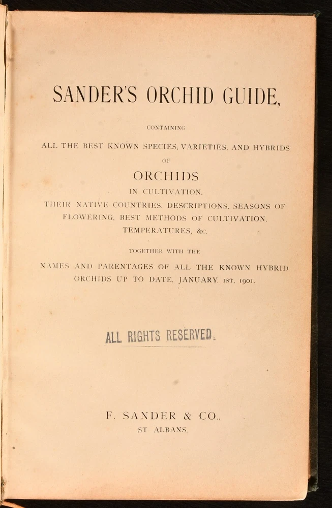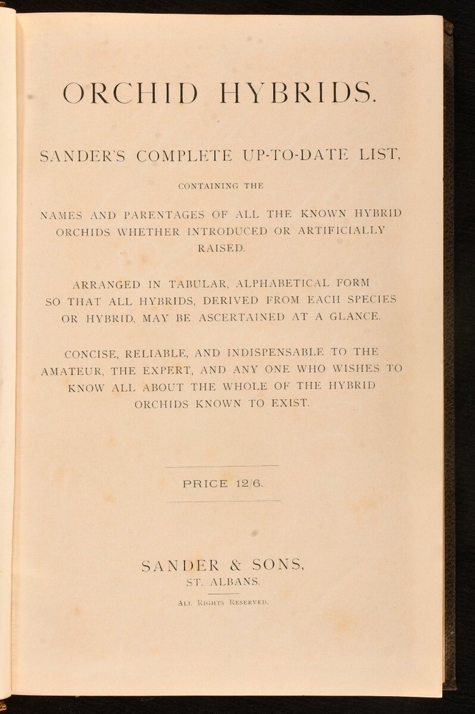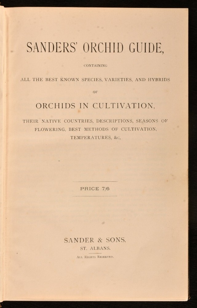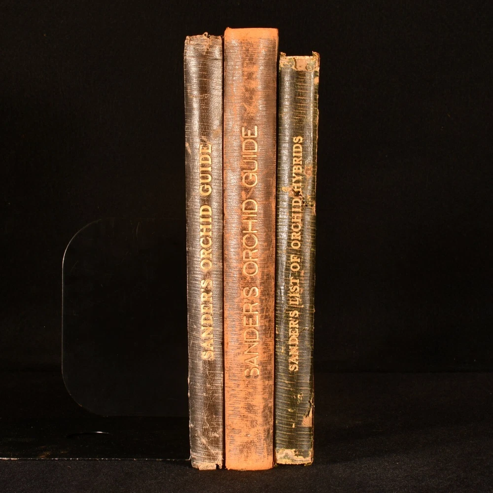 Click here to see our other books! Sanders' Orchid Guide, and, Orchid Hybrids Henry Frederick Conrad Sander 1901-06 Sander & Son : St. Albans 10" by 6.5" 256; [1]; 330, [1]; [4], 123, [2pp] SUMMARY A set of three important orchidologist reference works, compiled by the eminent botanical figure Henry Frederick Conrad Sander. Leather Binding Overall Condition: Good This book weighs 3 KG when packed UK Postage: £ 3.99 US Postage: £ 36.99 EU Postage : £ 25.99 European Postage: £ 27.99 Asia Postage: £ 47.99 Worldwide Postage: £ 69.99 DESCRIPTION Three detailed reference works on orchids, containing detailed lists on orchids and their hybrids. Detailing the many different species of orchids found around the world, including one volume focusing solely on orchid hybrids. This is an important guide to orchids which was re-edited and amended for decades after its first publication, an essential reference for orchidologists. This set includes two copies of 'Sanders' Orchid Guide', one volume bringing the text up to date to the 1st January 1901. The differences in the text show the expansion of the orchid growing industry and how many new hybrids had been cultivated. Compiled by Henry Frederick Conrad Sander, an orchidologist and nurseryman. He also published a monthly magazine on orchids named 'Reichenbachia'. 'Orchid Hybrids' dated 1906 from Jisc, from a copy held at Kew Gardens. Interleaved with blank lined pages for notes. CONDITION In a quarter calf binding with cloth to the boards. Externally, a little worn. Cracks and loss to the spine of 'Orchid Hybrids'. Marks to the boards, heavier to the 1901 volume, with some damp stains. Light bumping to the head and tail of the spines and to the extremities. Leather is rubbed, light fading to the spines. A little loss of cloth to the extremities of the 1901 volume. Front hinge of the 1901 volume is starting but firm. Prior owner's ink inscription to the recto of the front endpaper of 'Orchid Hybrids'. Spots to the endpapers. Internally, firmly bound. Pages are bright and clean with the occasional scattered spot. Overall Condition: Good GLOSSARY OF TERMS Overall Condition (Dustwrapper condition rating is shown after that for the book itself, where a dustwrapper is present) Fine - Very well preserved copy showing very little wear Very Good Indeed - Only one or two minor faults, really a very attractive copy Very Good - Quite a wide term meaning no major faults but probably several smaller ones often expected given the age of the book, but still a respectable copy Good - Meaning not very good. Some more serious faults as will be described in the condition report under 'condition' Good Only - Meaning one or more faults that could really do with repair Fair - As with good only above but with other faults leaving a compromised copy even after repair Poor - Really bad and possibly seriously incomplete. We only sell books in this condition where their rarity or value makes them attractive none the less. Major defects will be described. GUARANTEE We offer a full money back guarantee on our descriptions. Please ask for details and conditions. We prefer PAYPAL. If you pay via PAYPAL we will post the item off the same or the next working day with the postage you have selected. Please note we cannot accept USD cheques