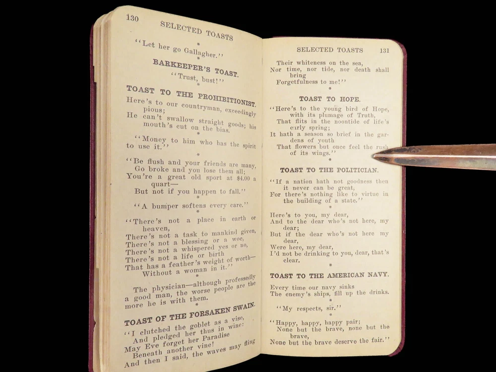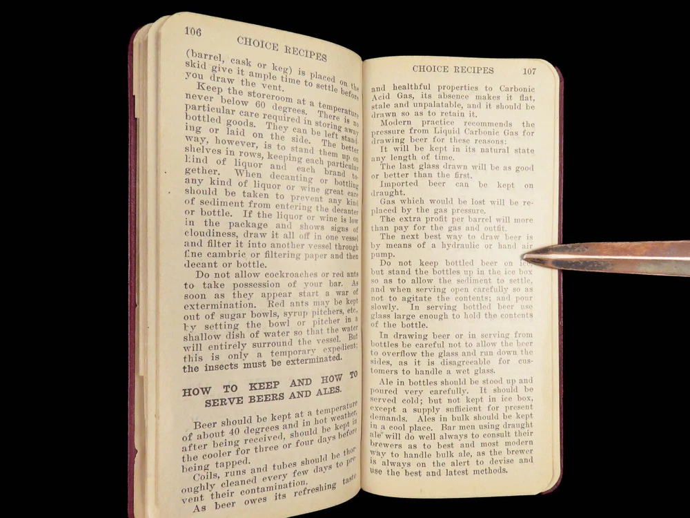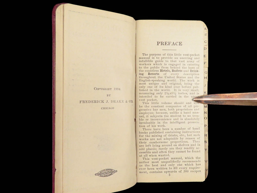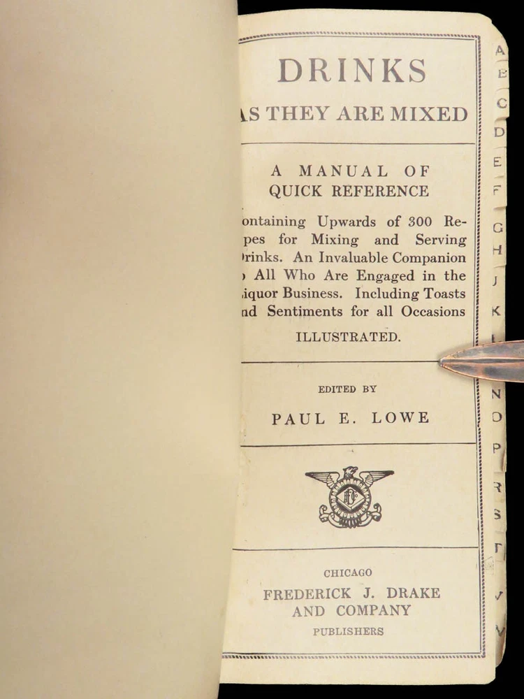 1904 Drinks as They Are Mixed by Paul Lowe | Pre- Prohibition Bartender Manual An incredibly rare and highly desirable pre-Prohibition bartenders guide! Published in 1904, this small, pocket-sized drink recipe book includes countless drink recipes in alphabetical order. Interestingly, this version includes a list of common and appropriate toasts! Item number: #28571 Price: $599 LOWE, Paul Drinks as they are mixed : a manual of quick reference : containing upwards of 300 recipes for mixing and serving drinks Chicago: F.J. Drake, 1904. Details : · Collation: Complete with all pages o 135, [1] · Language: English · Binding: Leather; tight and secure · Size: ~5.75in X 2.75in (14.5cm x 6.5cm) Our Guarantee: Very Fast. Very Safe. Free Shipping Worldwide. Customer satisfaction is our priority! Notify us with 7 days of receiving, and we will offer a full refund without reservation!