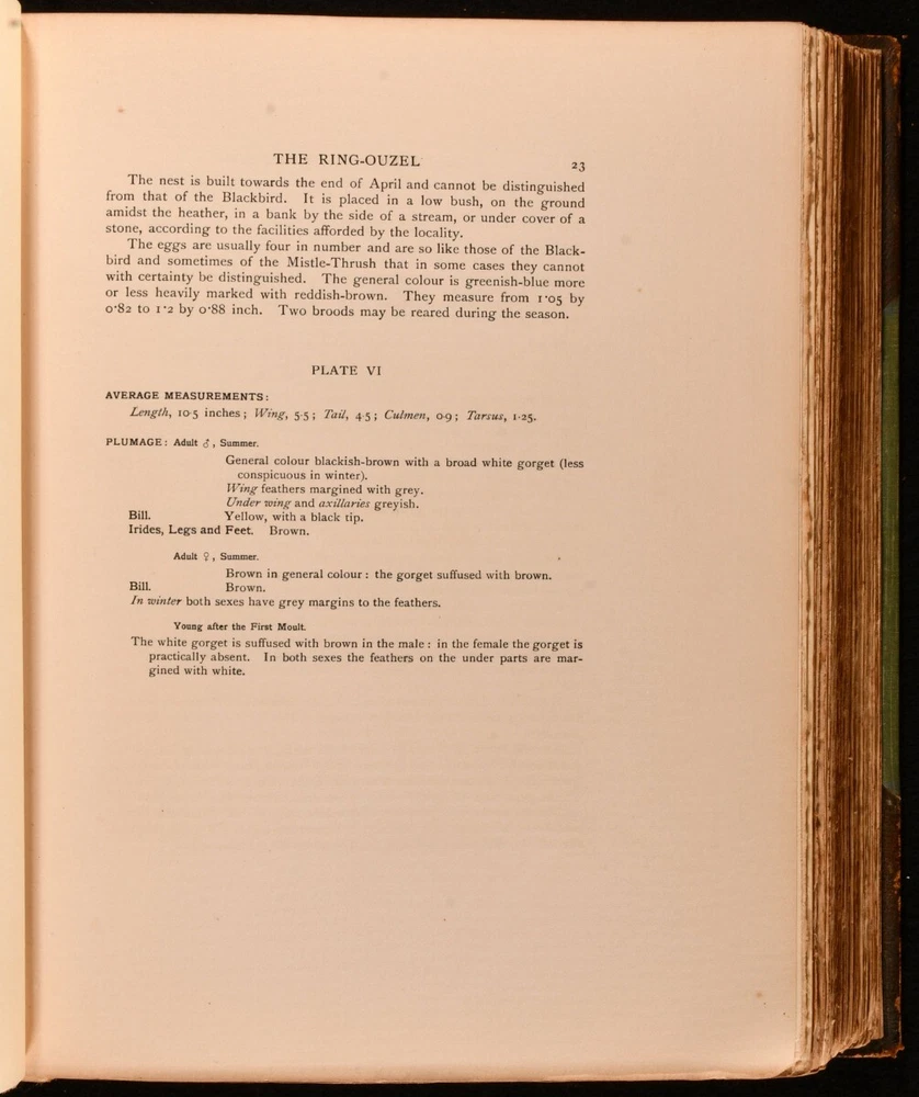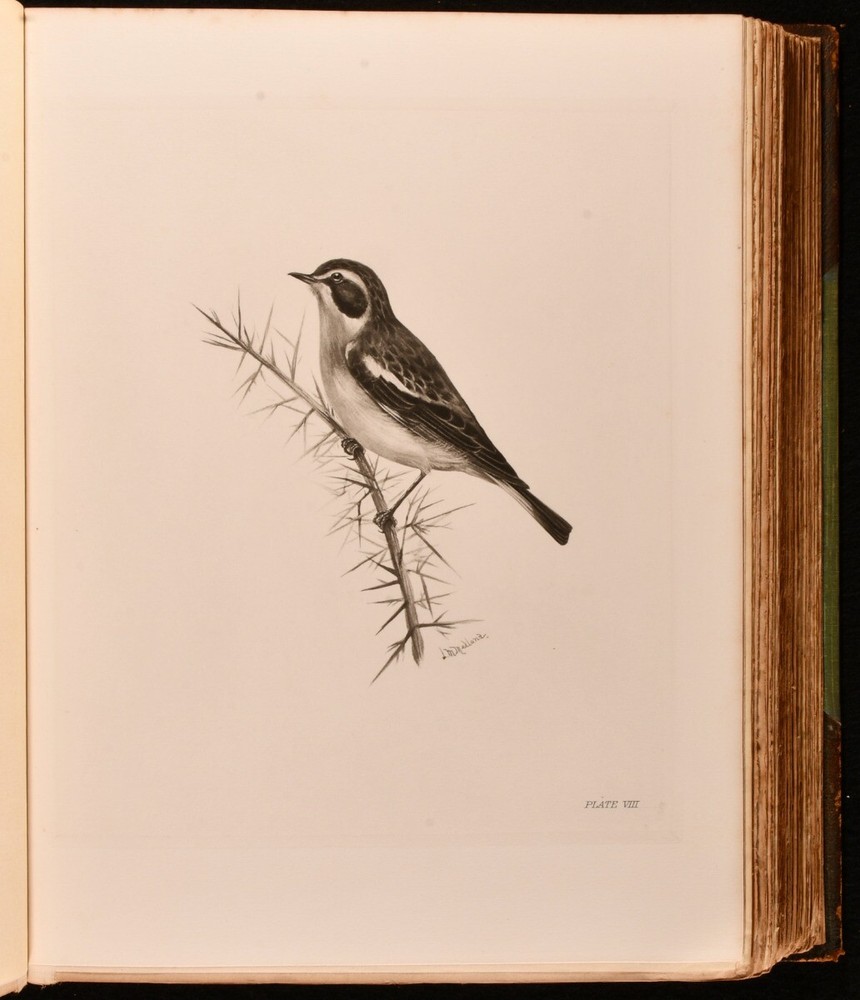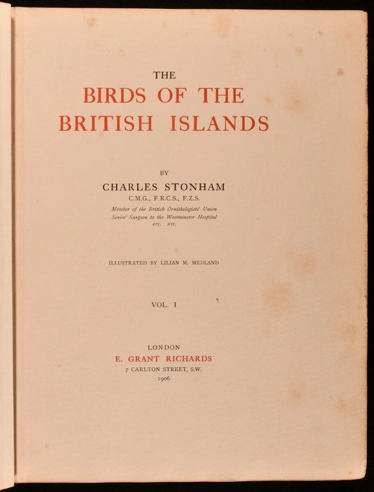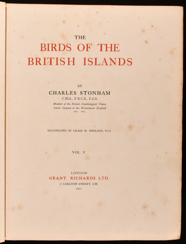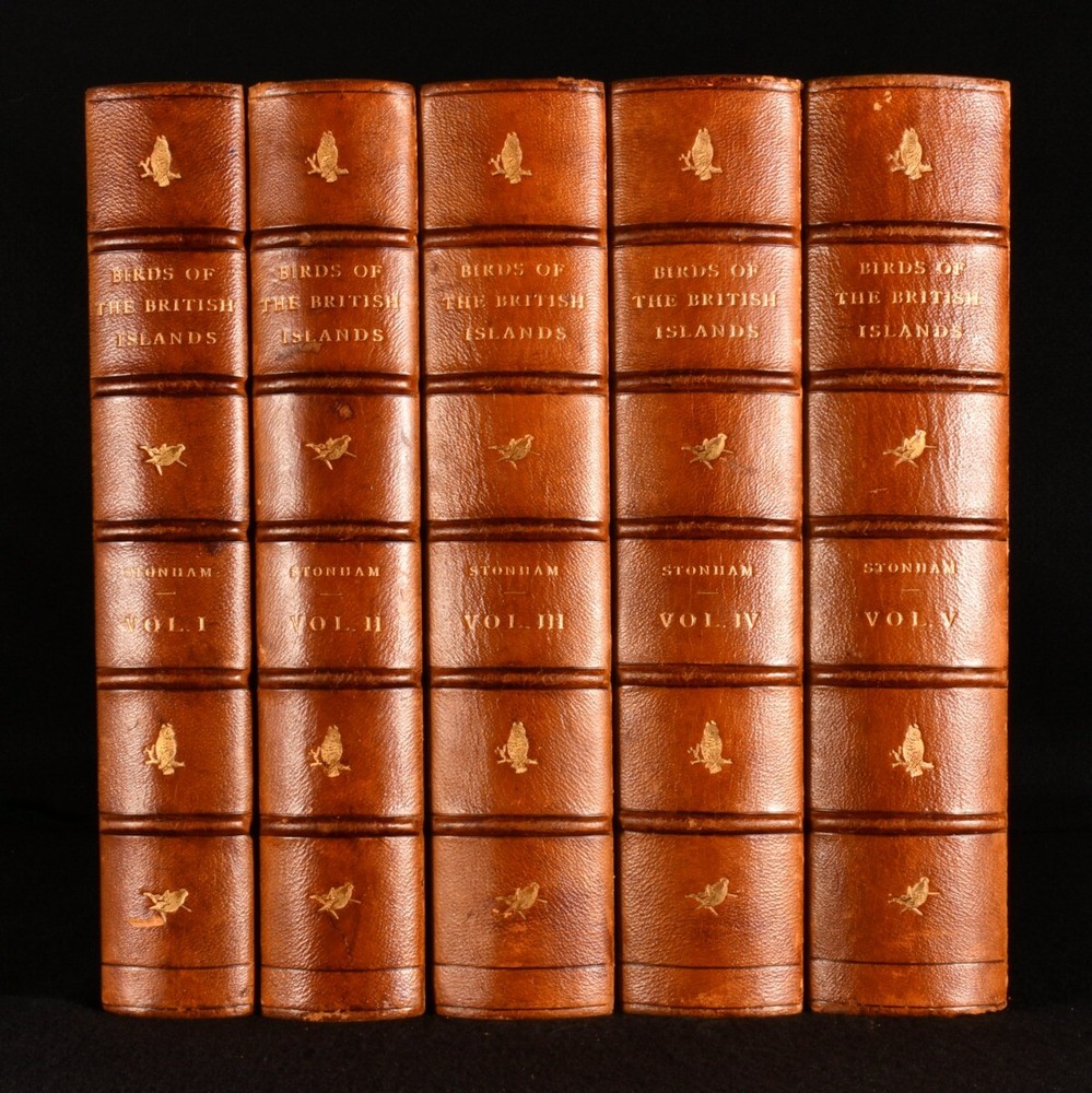 Click here to see our other books! The Birds of the British Islands Charles Stonham 1906-1911 E. Grant Richards : London 13.5" by 11" 10-151; 323; 514; 704; 976pp SUMMARY The complete five volume first edition of Charles Stonham's guide to the native birds of Great Britain, illustrated throughout by Lilian M. Medland, and in smart half morocco bindings. First Edition,Folding Maps,Illustrated,Leather Binding Overall Condition: Very Good This book weighs 20 KG when packed UK Postage: £ 4.49 US Postage: £ 89.99 EU Postage : £ 45.99 European Postage: £ 85.99 Asia Postage: £ 169.99 Worldwide Postage: £ 259.99 DESCRIPTION Illustrated with 318 plates - complete with captioned tissue guard - across all five volumes, alongside two colour folding maps and one double page plate to volume I. Collated, complete. These illustrations are the work of Lilian M. Medland, a nurse and illustrator who drew pictures predominantly for works on birds, including those by Gregory Mathews and her husband Tom Iredale. Originally published in twenty monthly parts, this is the first edition in book form. This is a lovely set, containing information on a range of birds found within the 'British Islands', including the Marsh-Harrier, Common Buzzard, Golden Eagle, Merlin, Mute Swan, and Wigeon. A wonderful ornithological guide to the British Isles. CONDITION In half morocco bindings, with cloth covered boards. Fading to back strips, with rubbing to back strip heads and tails, joints and board perimeters. Front joints of each volume starting, with boards holding firm. Internally, firmly bound. Scattered light spotting throughout each volume. Plates retaining captioned tissue guards. Overall Condition: Very Good GLOSSARY OF TERMS Overall Condition (Dustwrapper condition rating is shown after that for the book itself, where a dustwrapper is present) Fine - Very well preserved copy showing very little wear Very Good Indeed - Only one or two minor faults, really a very attractive copy Very Good - Quite a wide term meaning no major faults but probably several smaller ones often expected given the age of the book, but still a respectable copy Good - Meaning not very good. Some more serious faults as will be described in the condition report under 'condition' Good Only - Meaning one or more faults that could really do with repair Fair - As with good only above but with other faults leaving a compromised copy even after repair Poor - Really bad and possibly seriously incomplete. We only sell books in this condition where their rarity or value makes them attractive none the less. Major defects will be described. GUARANTEE We offer a full money back guarantee on our descriptions. Please ask for details and conditions. We prefer PAYPAL. If you pay via PAYPAL we will post the item off the same or the next working day with the postage you have selected. Please note we cannot accept USD cheques