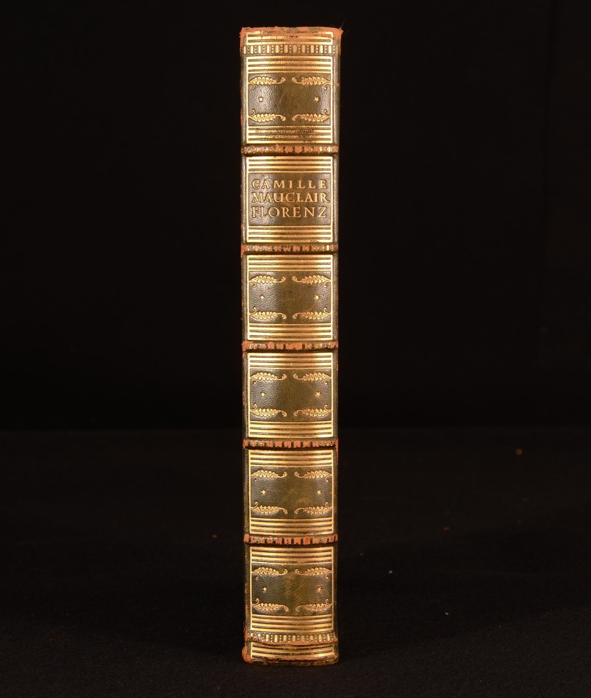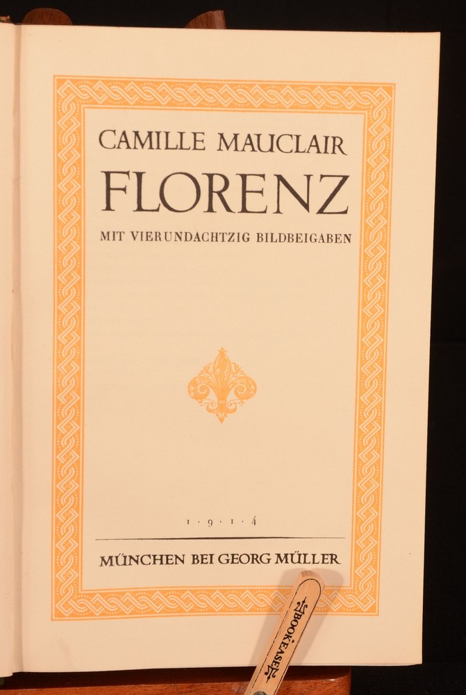 Click here to see our other books! Florenz Maucalir 1914 Georg Muller : Munich 102 by 6.5" 267pp SUMMARY An illustrated travel guide for Florence, written in German. First Edition,Leather Binding Overall Condition: Very Good Indeed This book weighs 1.5 KG when packed UK Postage: £ 3.99 US Postage: £ 23.99 EU Postage : £ 18.99 European Postage: £ 19.99 Asia Postage: £ 31.99 Worldwide Postage: £ 32.99 DESCRIPTION The first German edit Camille Mauclair was a French poet, novelist, biographer and travel writer. He is best known for his novel fictionalising the lives of leading avant-garde writers and artists of the 1890s, however he predominantly wrote non fiction biographies and travel guides in his later life. This work is a comprehensive and illustrated guide to the sights of Florence, including illustrations of its many artistic attractions. CONDITION In a half calf binding. Externally, smart with rubbing to the spine and extremities, heavier to the head and tail of the spine. Internally, firmly bound aside from some slight straining to the rear. Pages bright and clean. Overall Condition: Very Good Indeed GLOSSARY OF TERMS Overall Condition (Dustwrapper condition rating is shown after that for the book itself, where a dustwrapper is present) Fine - Very well preserved copy showing very little wear Very Good Indeed - Only one or two minor faults, really a very attractive copy Very Good - Quite a wide term meaning no major faults but probably several smaller ones often expected given the age of the book, but still a respectable copy Good - Meaning not very good. Some more serious faults as will be described in the condition report under 'condition' Good Only - Meaning one or more faults that could really do with repair Fair - As with good only above but with other faults leaving a compromised copy even after repair Poor - Really bad and possibly seriously incomplete. We only sell books in this condition where their rarity or value makes them attractive none the less. Major defects will be described. GUARANTEE We offer a full money back guarantee on our descriptions. Please ask for details and conditions. We prefer PAYPAL. If you pay via PAYPAL we will post the item off the same or the next working day with the postage you have selected. Please note we cannot accept USD cheques