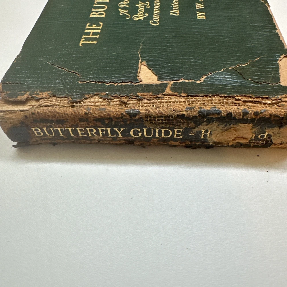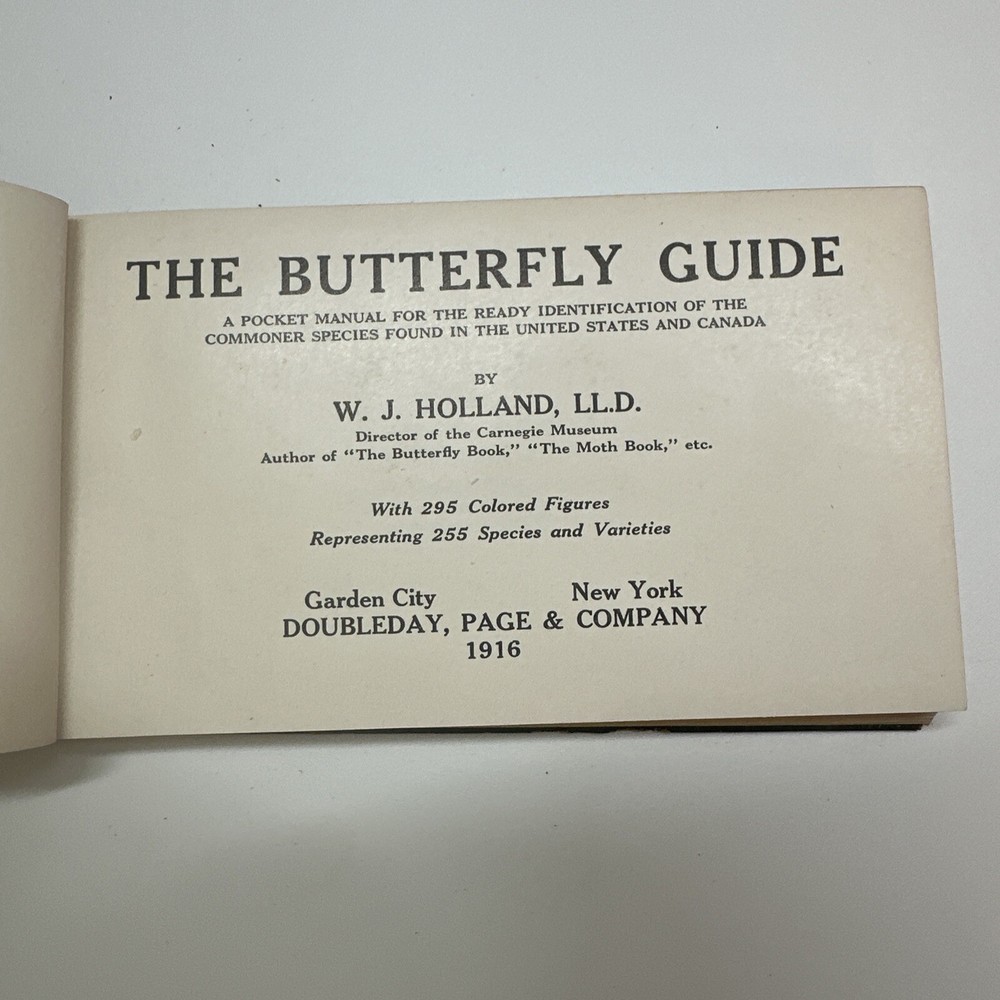 This is The BUTTERFLY GUIDE - A pocket manual for the ready identification of the commonest species found in the United States and Canada by W.J. Holland (Director of the Carnegie Museum, etc.) published by Doubleday, Page & Co. With 295 colored figures representing 255 species and varieties; leather binding. Book dimensions are around 6" x 3.5". Please see photos for more on contents and condition. Front cover with chipped and cracked edges. Pages are all clean and intact, starting to tone. Gilt cover lettering and designs are bright. Thanks for looking ! r171