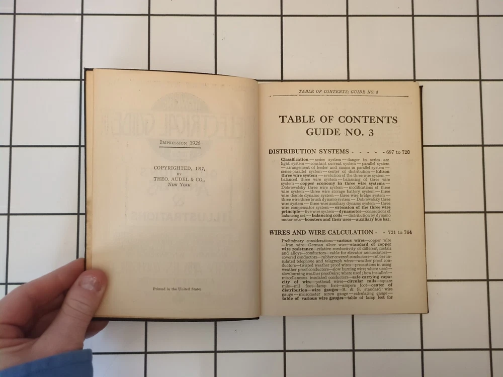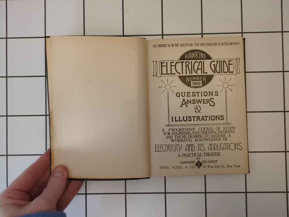 Hawkins Electrical Guide Number 3 Published by Theo. Audel & Co Leather soft cover, Gold edges 1926 Condition: This book is in good vintage condition. There is minor wear notable on the Leather softcover/edges/spine. The text is clean and there are no notable markings/highlighting within the text. Please see all photos of wear/condition before purchasing. Please ask any and all questions before purchasing! Your purchase from our small eBay store helps support our ability to homeschool and provide needed services for our disabled children. Thank you in advance for your purchase!