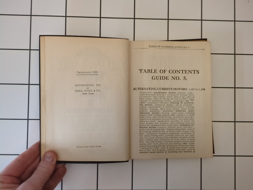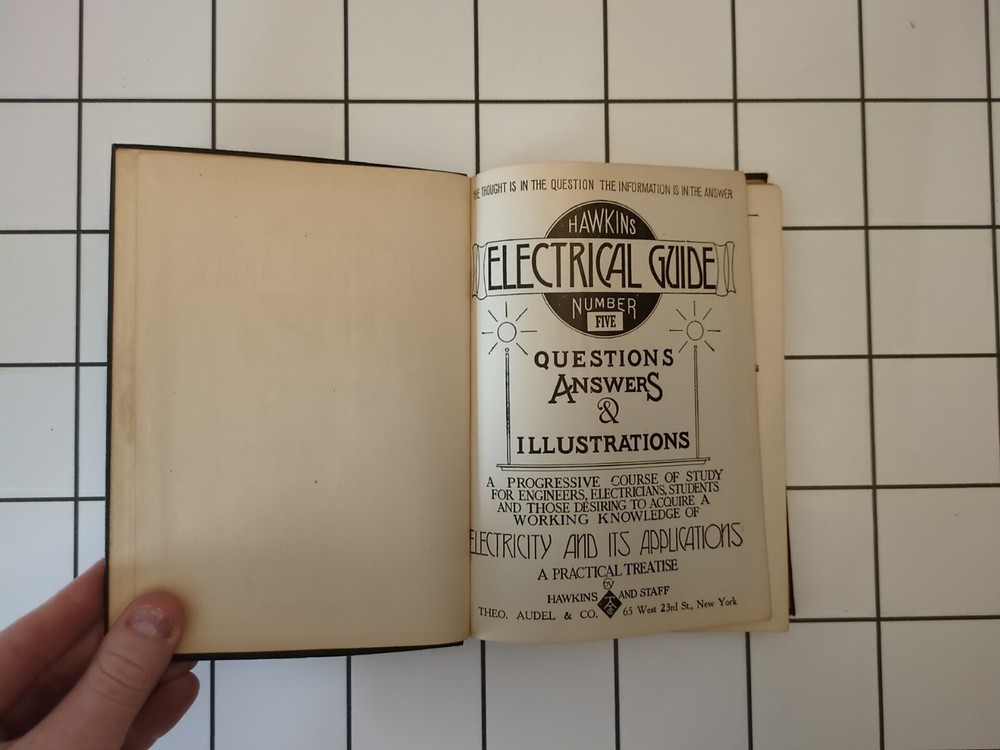Hawkins Electrical Guide Number 5 Published by Theo. Audel & Co Leather soft cover, Gold edges 1926 Condition: This book is in good vintage condition. There is minor wear notable on the Leather softcover/edges/spine. The text is clean and there are no notable markings/highlighting within the text. Please see all photos of wear/condition before purchasing. Please ask any and all questions before purchasing! Your purchase from our small eBay store helps support our ability to homeschool and provide needed services for our disabled children. Thank you in advance for your purchase!