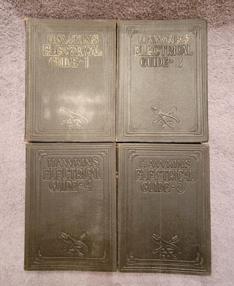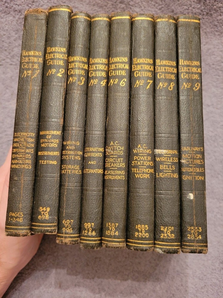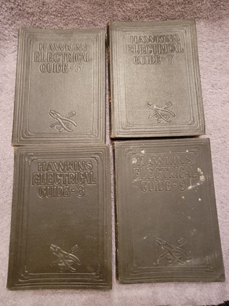 1927 AUDELS Hawkins Electrical Guide vol 1, 2, 3, 4, 6, 7, 8 and 9. Missing vol 5. Each book has same name and date written in it. Example is in one of the pictures. More pics available on request.