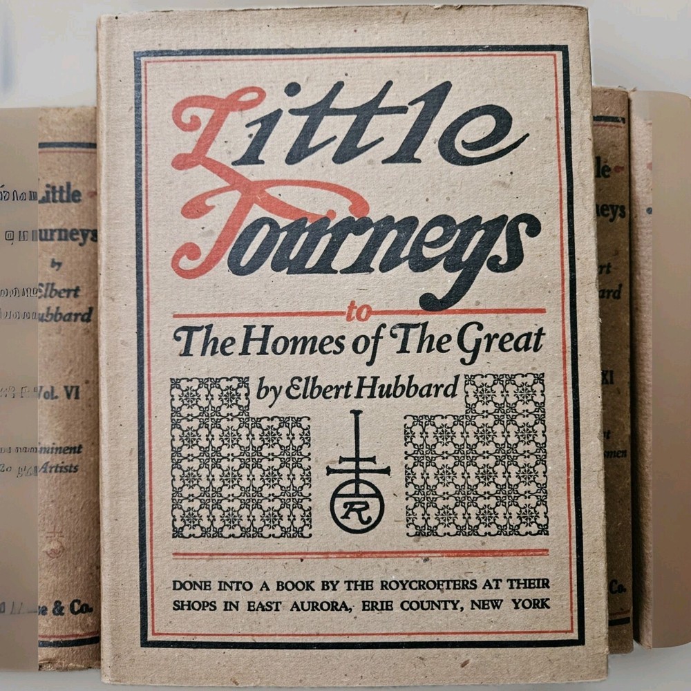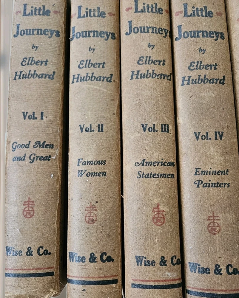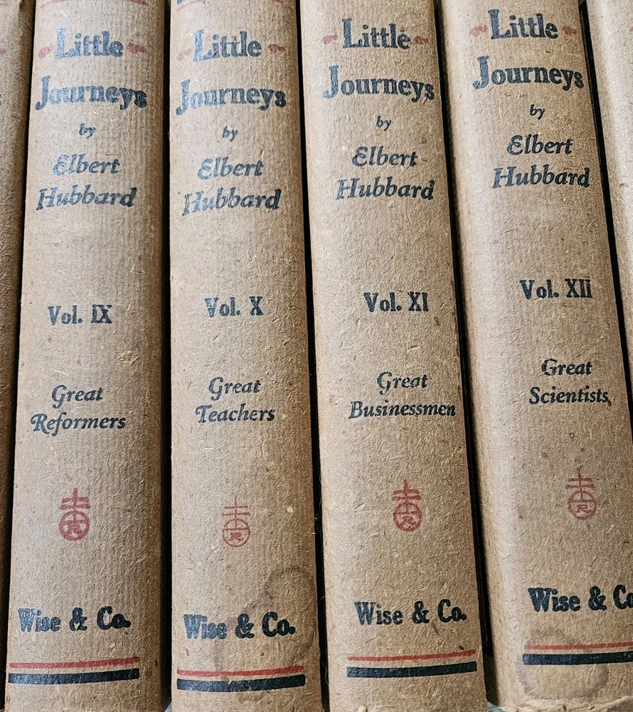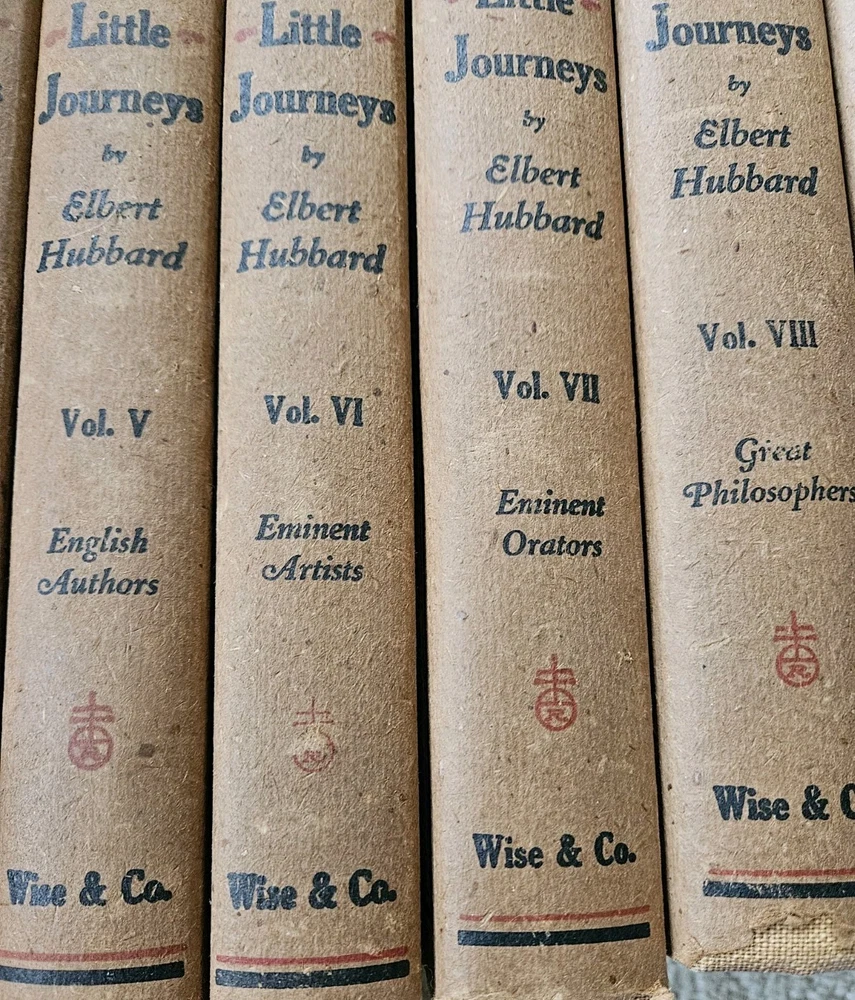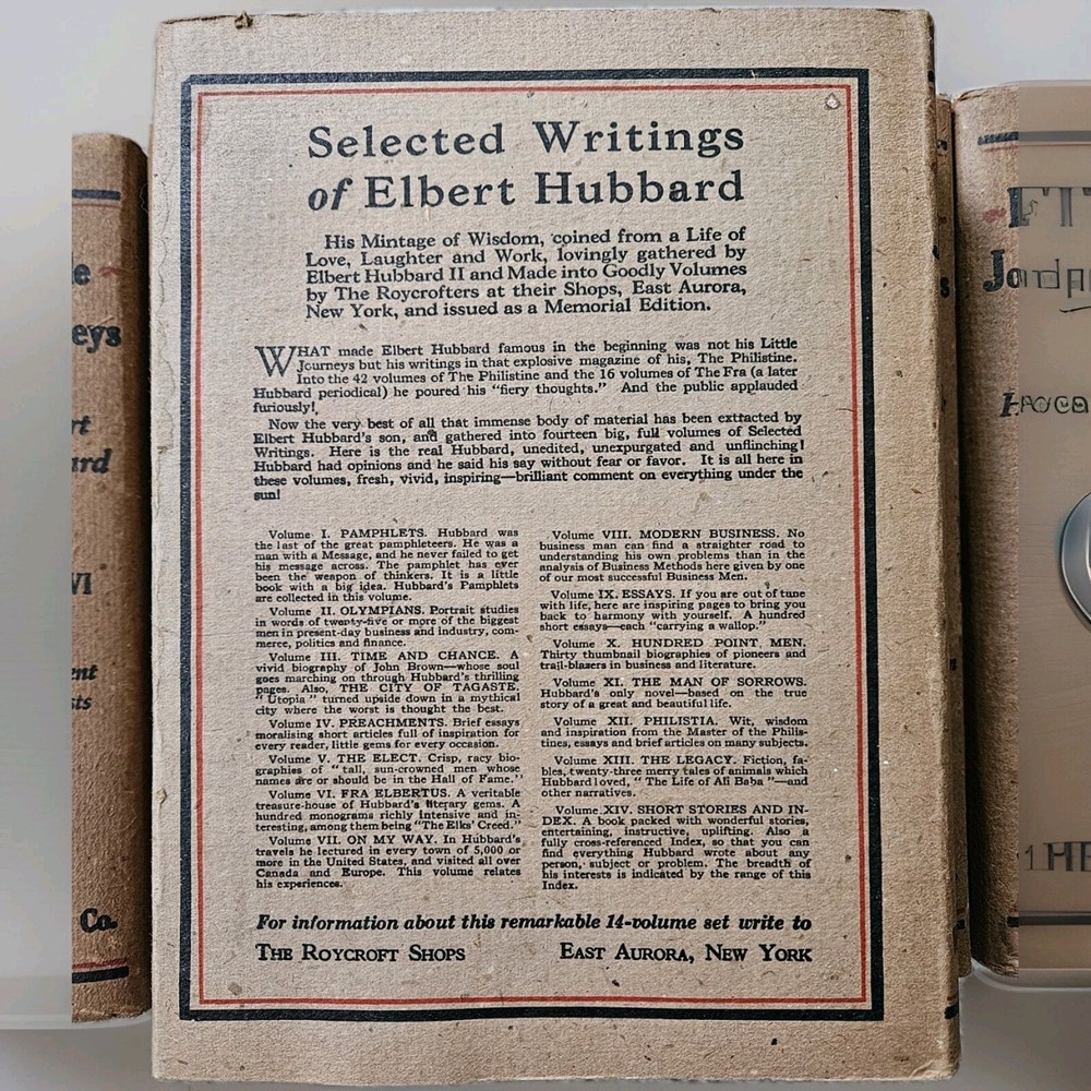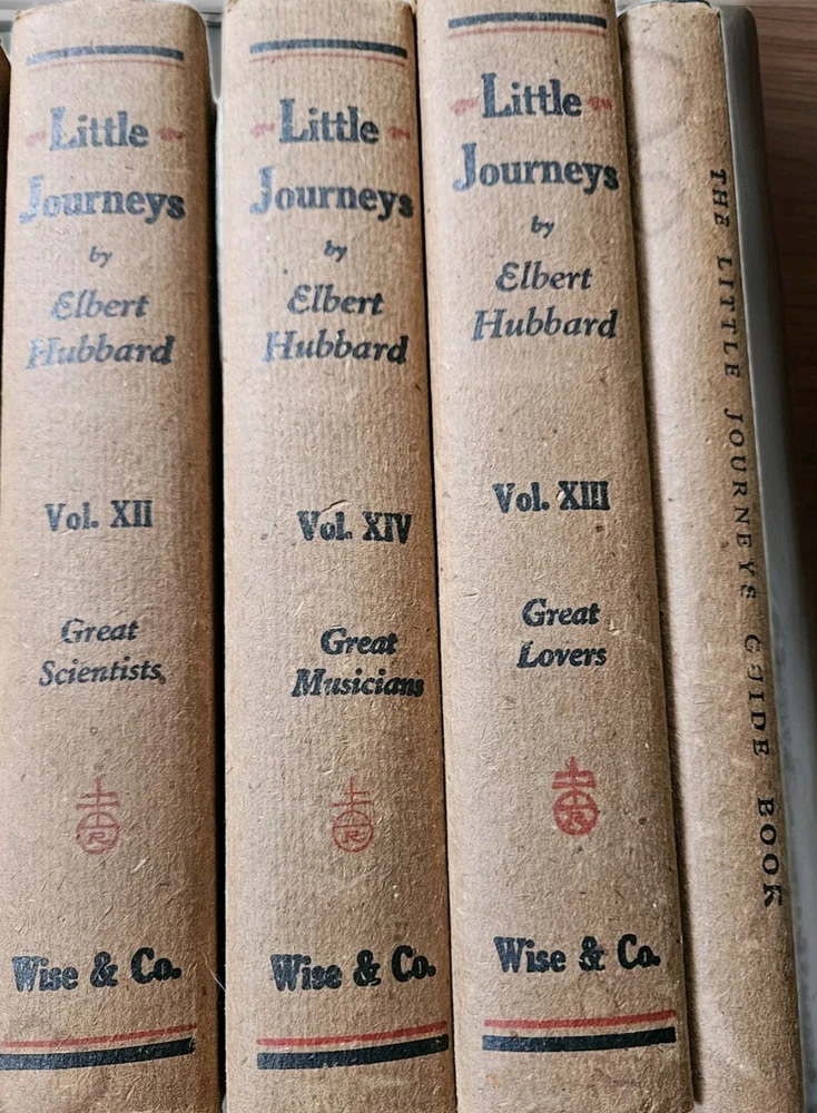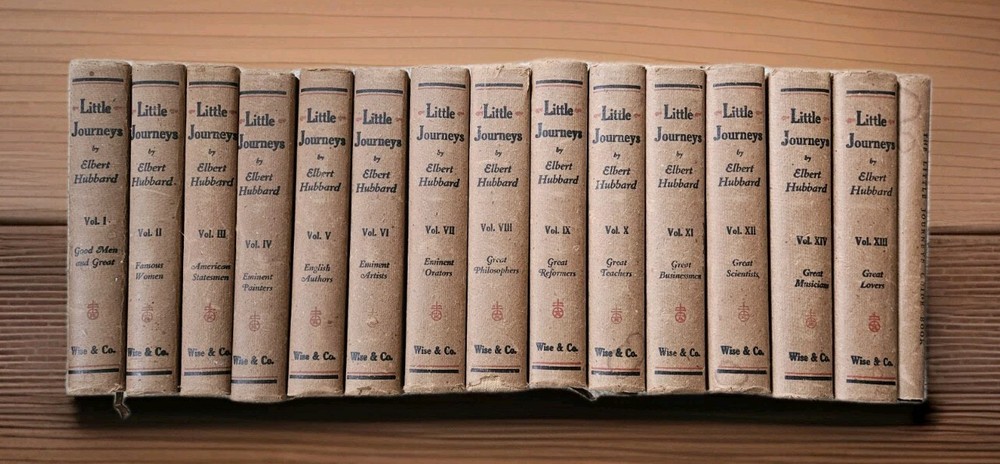 1928. Complete Little Journeys 14 volume set By Hubbard , plus the Guide Book. Roycrofters set in very good + condition. All have very good dustjackets. These have edgewear, and crisp and clean pages. See photos for specific details and wear.
