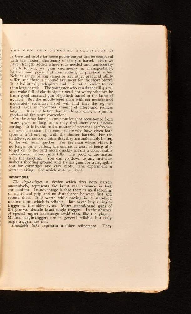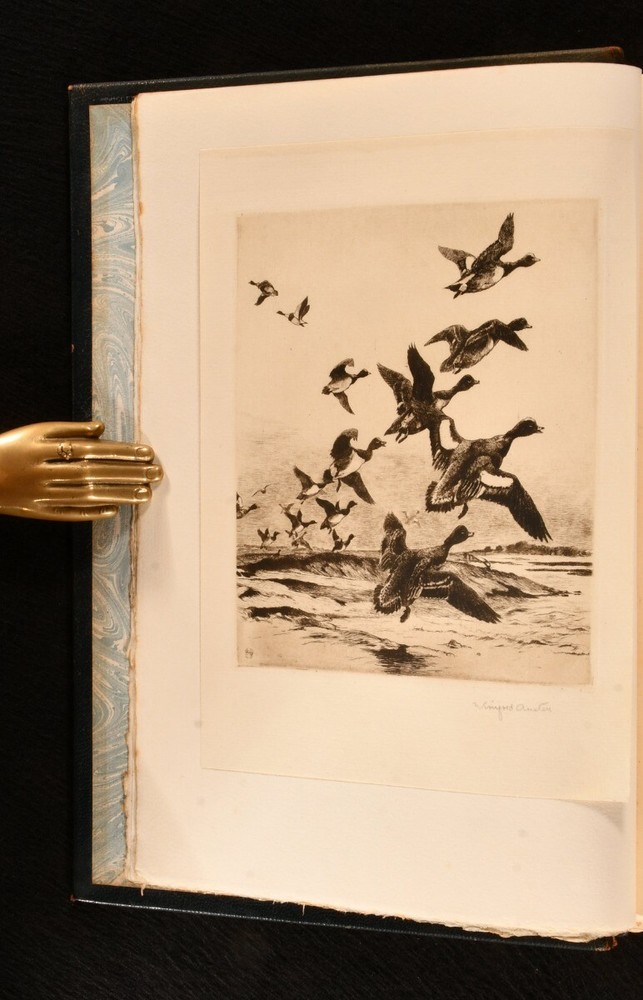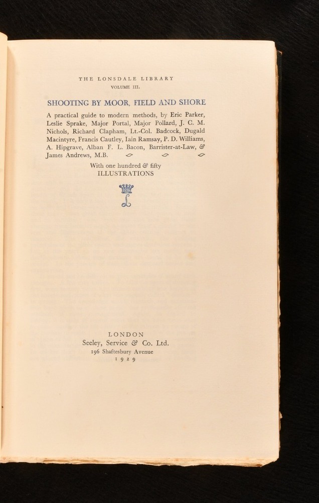 Click here to see our other books! Shooting by Moor, Field and Shore: A Practical Guide to Modern Methods The Right Hon. The Earl of Lonsdale [ed.]; Eric Parker [ed.]; Leslie Sprake; et al. 1929 Seeley, Service & Co. Ltd. : London 10.5" by 7" 380pp. SUMMARY A signed limited edition of Volume III of The Lonsdale Library on shooting in different terrain. First Edition,Illustrated,Leather Binding,Limited Edition,Signed Overall Condition: Very Good Indeed This book weighs 1.5 KG when packed UK Postage: £ 3.99 US Postage: £ 29.99 EU Postage : £ 21.99 European Postage: £ 23.99 Asia Postage: £ 37.99 Worldwide Postage: £ 38.99 DESCRIPTION No. 188 of 360 numbered copies printed on handmade paper, signed by Eric Parker to the limitations page, with the etched frontispiece signed by Winifred Austen, in a full morocco binding with gilt detailing to the boards and spine including the gilt crest of Lonsdale Library to the front board. Illustrated with 75 plates. Collated, complete. The third volume of The Lonsdale Library of Sports, Games & Pastimes, edited by The Right Hon. The Earl of Lonsdale and Eric Parker. This illustrated work includes advice on equipment, the training of dogs, and how to shoot different kinds of game, from a variety of authors. CONDITION In a full morocco binding. Externally smart, with fading to the spine and rubbing to the joints and extremities. Hinges have been reinforced. Internally, firmly bound. Pages are bright and clean, with spotting to the fore edge, affecting the occasional page. Overall Condition: Very Good Indeed GLOSSARY OF TERMS Overall Condition (Dustwrapper condition rating is shown after that for the book itself, where a dustwrapper is present) Fine - Very well preserved copy showing very little wear Very Good Indeed - Only one or two minor faults, really a very attractive copy Very Good - Quite a wide term meaning no major faults but probably several smaller ones often expected given the age of the book, but still a respectable copy Good - Meaning not very good. Some more serious faults as will be described in the condition report under 'condition' Good Only - Meaning one or more faults that could really do with repair Fair - As with good only above but with other faults leaving a compromised copy even after repair Poor - Really bad and possibly seriously incomplete. We only sell books in this condition where their rarity or value makes them attractive none the less. Major defects will be described. GUARANTEE We offer a full money back guarantee on our descriptions. Please ask for details and conditions. We prefer PAYPAL. If you pay via PAYPAL we will post the item off the same or the next working day with the postage you have selected. Please note we cannot accept USD cheques