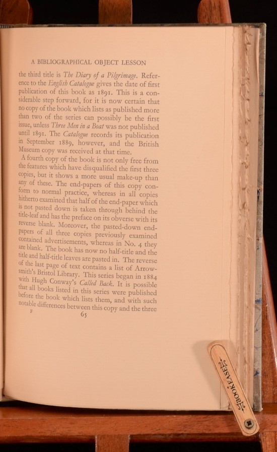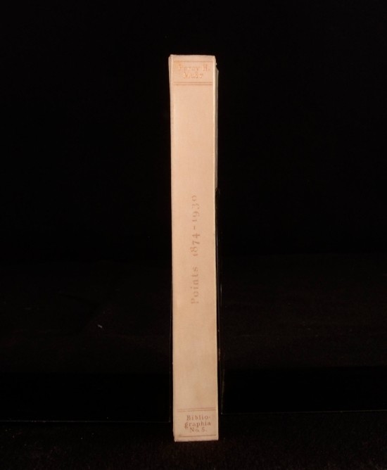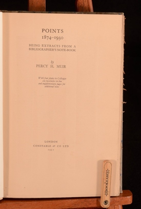 Click here to see our other books! Points 1874-1930 Percy H. Muir 1931 Constable and Company : London 9" by 6" (xvii) 167pp. SUMMARY A limited first edition of this volume on issue points. First Edition,Leather Binding,Limited Edition,Publishers' Original Binding Overall Condition: Near Fine This book weighs 0.75 KG when packed UK Postage: £ 3.99 US Postage: £ 19.99 EU Postage : £ 15.99 European Postage: £ 16.99 Asia Postage: £ 21.99 Worldwide Postage: £ 25.99 DESCRIPTION Dealing with books from 1874-1930, the work provides a valuable reference into book collecting, with particular emphasis on first editions. The work contains ten plates and facsimiles throughout and is part of a limited printing of 500 copies. Direct from the library of the late Hugh Selbourne MD (1906-1973), a noted book collector and diarist. CONDITION In paper-vellum binding with gilt detailing and paper-covered boards. Externally very smart, there is some minor wear to the extremities only. Internally, the pages are firmly bound and are bright and clean throughout, with some remnants of adhesive labels to the pastedown. Overall Condition: Near Fine GLOSSARY OF TERMS Overall Condition (Dustwrapper condition rating is shown after that for the book itself, where a dustwrapper is present) Fine - Very well preserved copy showing very little wear Very Good Indeed - Only one or two minor faults, really a very attractive copy Very Good - Quite a wide term meaning no major faults but probably several smaller ones often expected given the age of the book, but still a respectable copy Good - Meaning not very good. Some more serious faults as will be described in the condition report under 'condition' Good Only - Meaning one or more faults that could really do with repair Fair - As with good only above but with other faults leaving a compromised copy even after repair Poor - Really bad and possibly seriously incomplete. We only sell books in this condition where their rarity or value makes them attractive none the less. Major defects will be described. GUARANTEE We offer a full money back guarantee on our descriptions. Please ask for details and conditions. We prefer PAYPAL. If you pay via PAYPAL we will post the item off the same or the next working day with the postage you have selected. Please note we cannot accept USD cheques