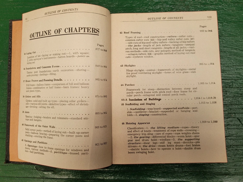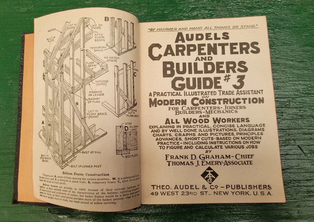 1945 Audels Carpenters And Builders Guide # 3 For Joiners Builders and Mechanics. This book is in good shape there are no holes, tears or bent pages. On page 853 there are two green crayon lines which you can see in the last photo. On the front of the book there is a brown and white mark and an indentation. Overall in good shape. There are no other markings besides what is noted. Measures 6 5/8" X 4 7/8" with 1088 pages . Any questions please contact me. Always a smoke free shop. Thank you for looking.