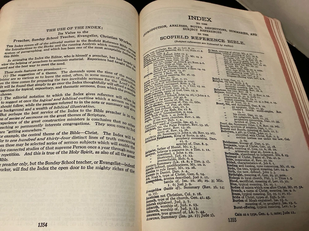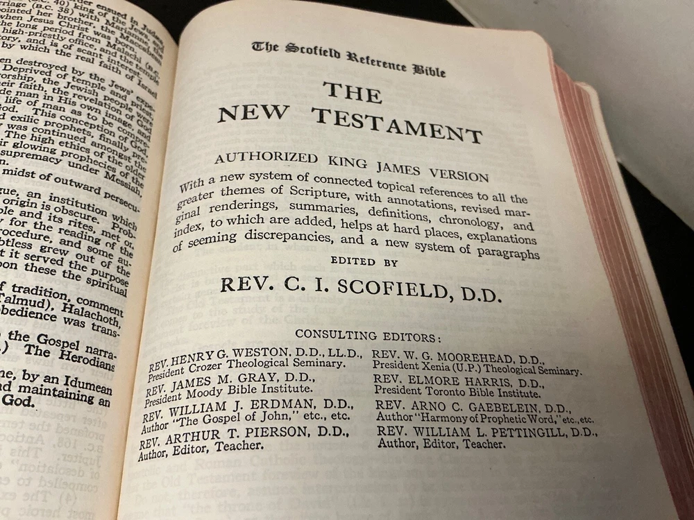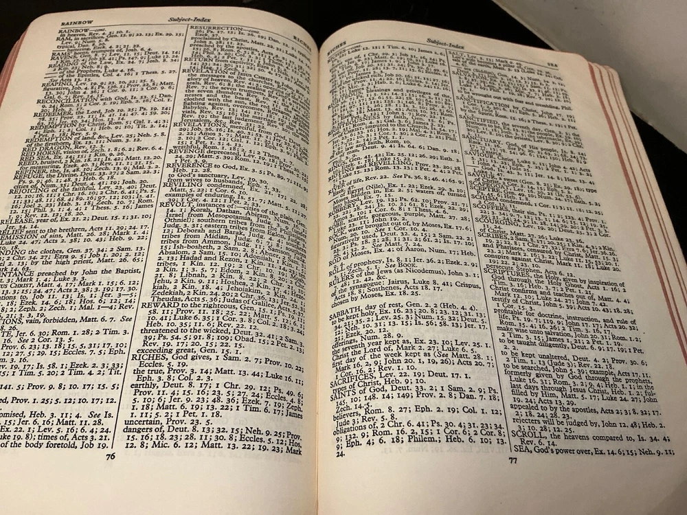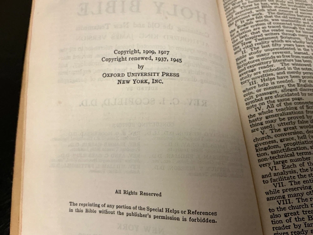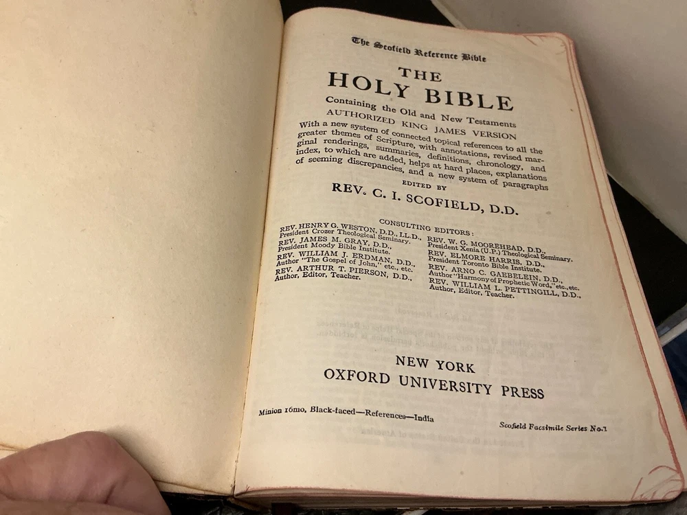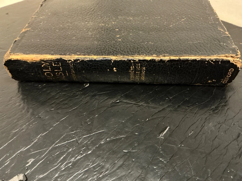 This is a rare 1945 Oxford Scofield HOLY BIBLE Concordance Reference Edition. The book is a hardcover format and features a leather-bound cover. It is a nonfiction narrative type and is intended for young adults and adults. The book is written in English and is a part of the Historical book series.The Bible Scofield is a valuable addition to any library, with its extensive concordance and reference materials. It is perfect for those interested in spirituality, religious and spiritual history. This book is a must-have for anyone who wants to delve into the Bible and understand its teachings. Contains analyses, notes, definitions, summaries, and subject references. Dictionary of proper names, Indexed as to the HOLY BIBLE. Color Maps. This Bible does show wear and use. There is underlining, notes, throughout the Bible. A great study, or reference Bible.