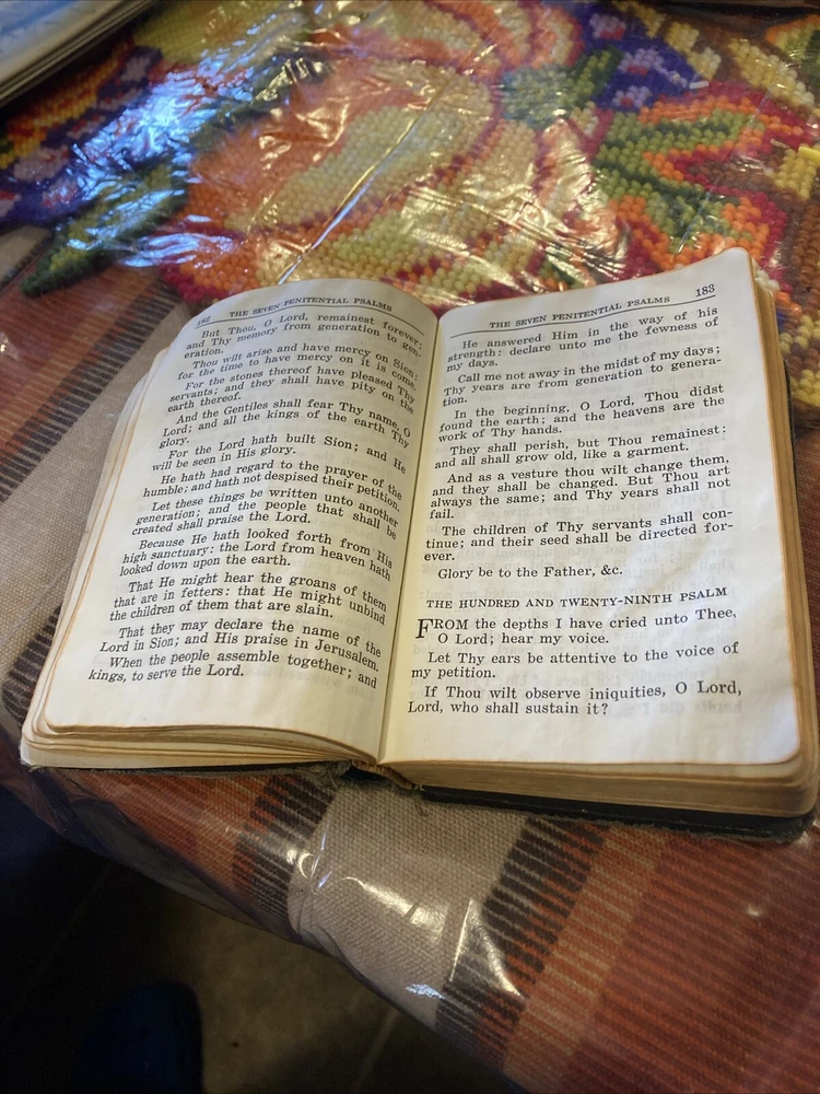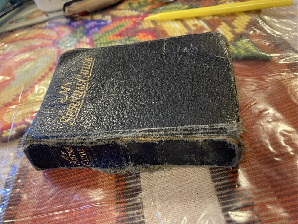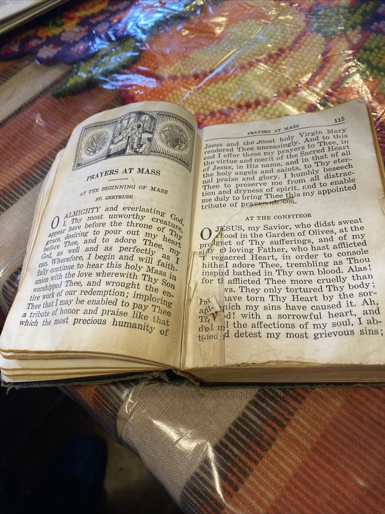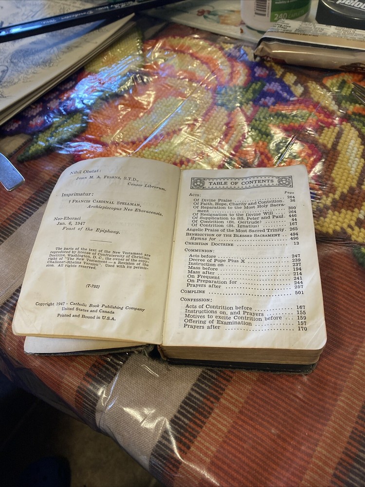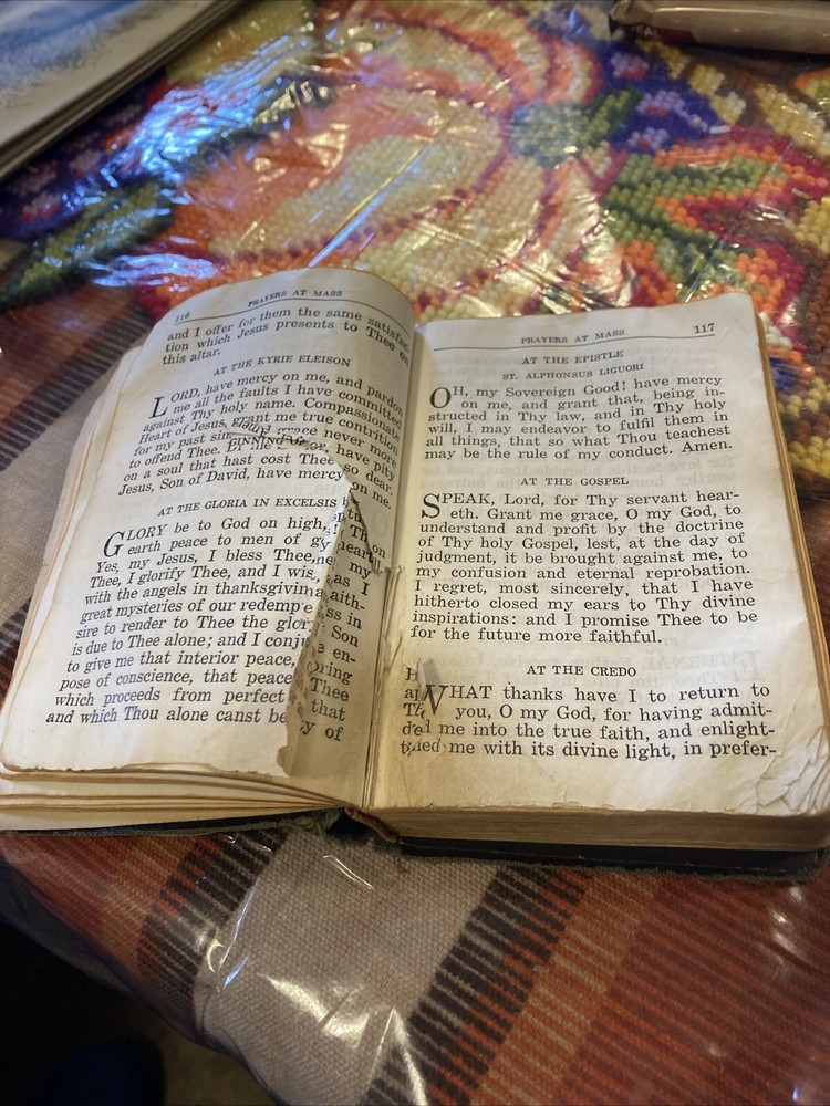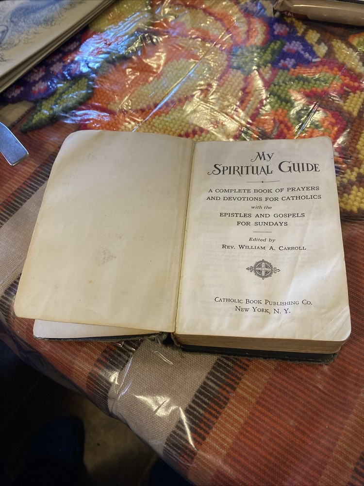 My spiritual guide The name Florence is written on one of the inside pages are complete book of prayers and devotions for Catholics with the epistles and gospels for Sundays edited by Reverend William Carol Catholic book publishing company, New York New York it has a T780 copyright is 1947. It’s printed and bound in the USA While this pocket book is well worn I believe there’s still a lot of life left to it. I have taken the picture of page 115 and 116 to show where it has been torn. I believe that could be repaired. It is a nice book and I think it would make a nice gift to somebody who maybe has wanted this one for many years or lost theirs.