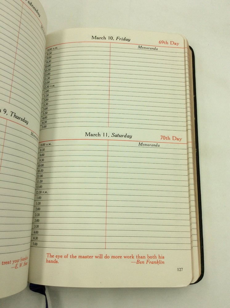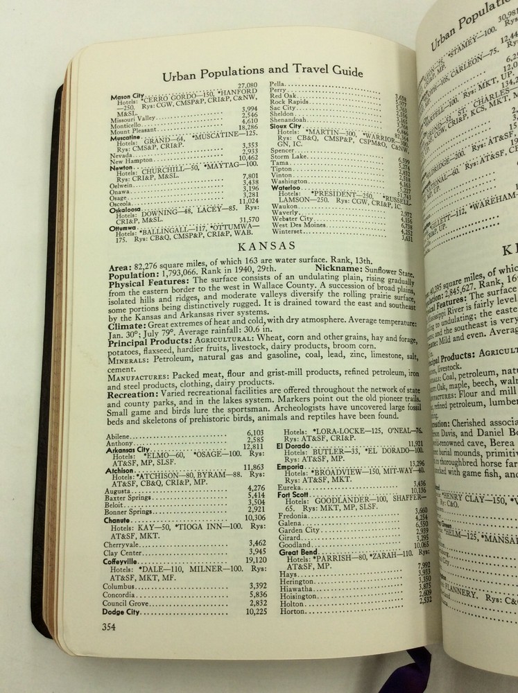 1950 EXECUTIVE RECORD AND TRAVEL GUIDE St. Paul, MN: Brown & Bigelow, 1950. Leather. 399p. A flexible hardcover book bound in dark brown leather. Very good condition. Owner's name gilt-stamped on front cover. Edges lightly rubbed and endpapers faintly spotted. Stamps inside, but main pages clean and binding tight. Item #173878 A travel guide and appointment calendar for business trips. Includes maps, daily schedules (none of which have been filled out by previous owners), hotel information, and more.