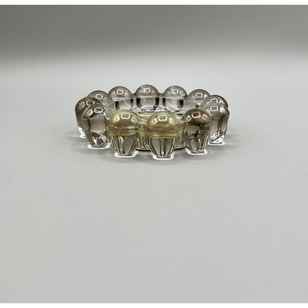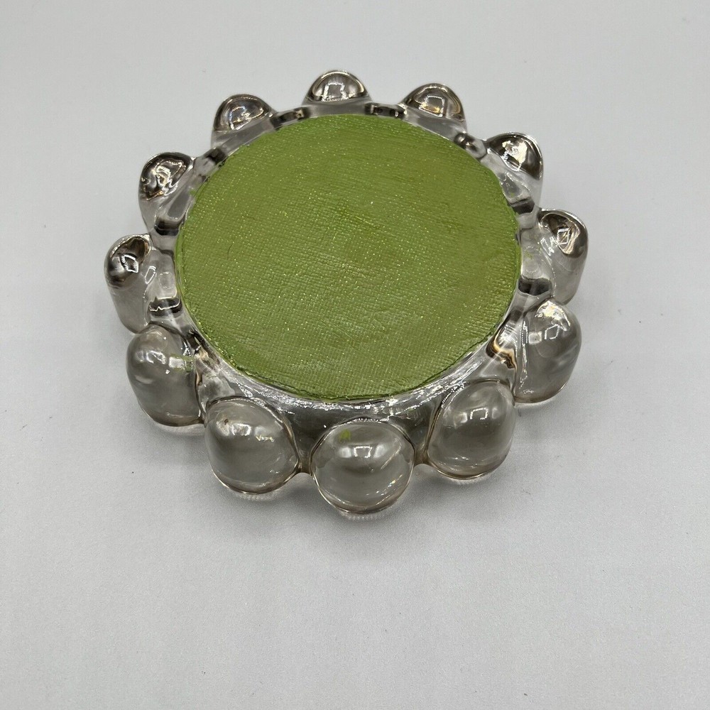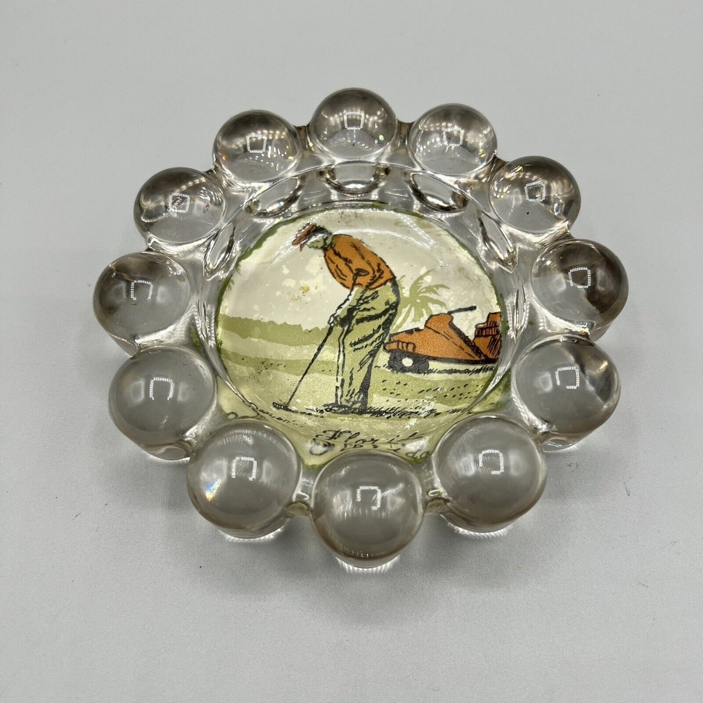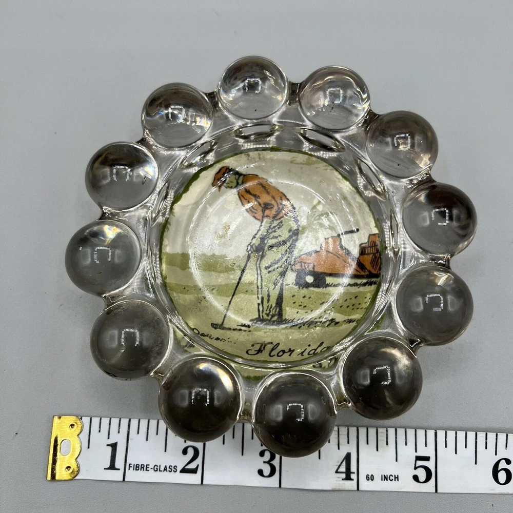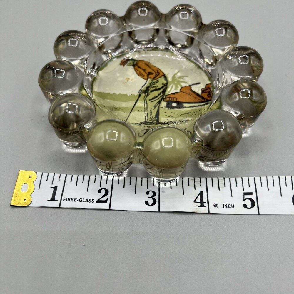 Add a touch of vintage elegance to your home with this stunning 5"d crystal ball ring ashtray. The ashtray features a beautifully crafted clear crystal glass with a printed backstamp and a golf theme. The ring is hand made with a cylinder shape and is suitable for cigar smoking. The vintage original ashtray is from the 1959-1969 time period and was manufactured by Westmoreland in the USA. It is part of the Crystal Ball Ring With Barred Owl Decal series and is perfect for any collector or lover of studio-crafted glassware. The ashtray is decorated with a golfer putting decal and is a must-have for any golf enthusiast.