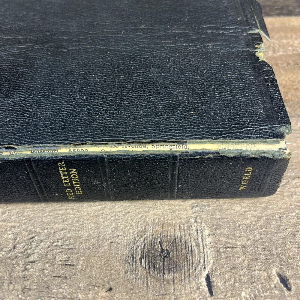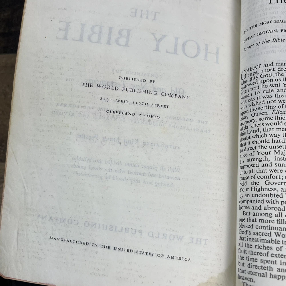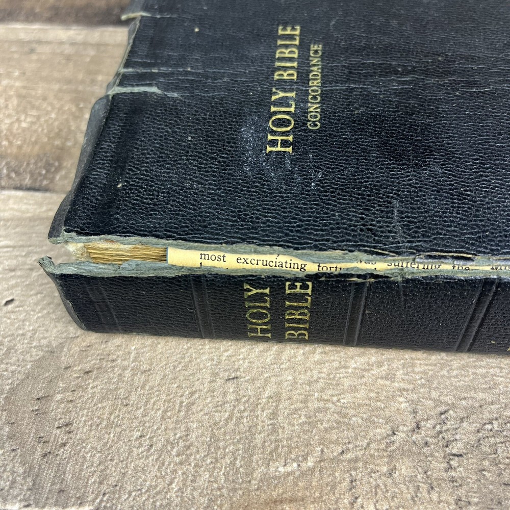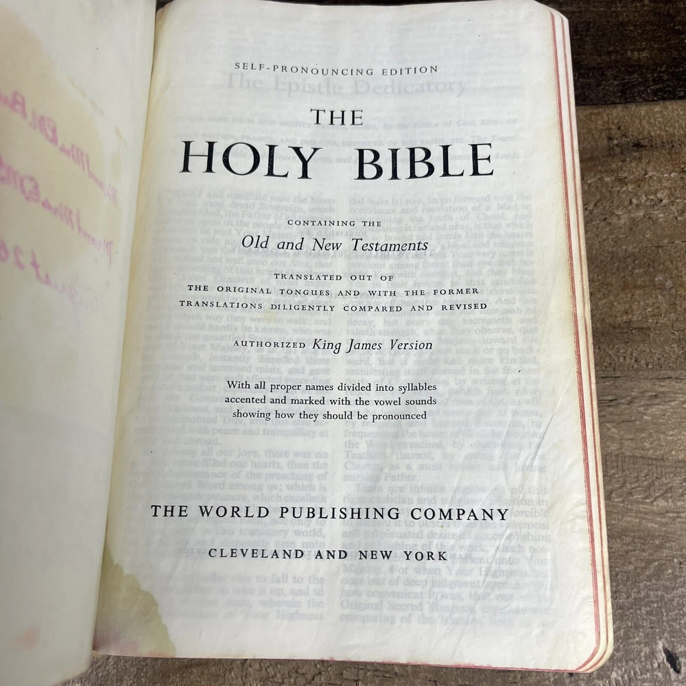 There is writing and damage to the Bible as shown above. One of the pages is torn off and folded in the front as well as the cover being completely detached. It comes with the original box. This item is used and may have minor imperfections. I will do my best to show any imperfections in the pictures above. All purchases will be packaged properly to arrive to you as expected. Please feel free to message me with any questions you may have. Thank you for taking a look!