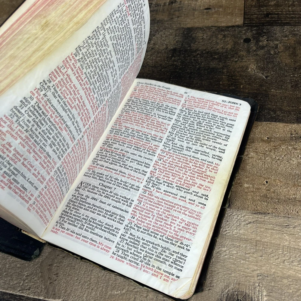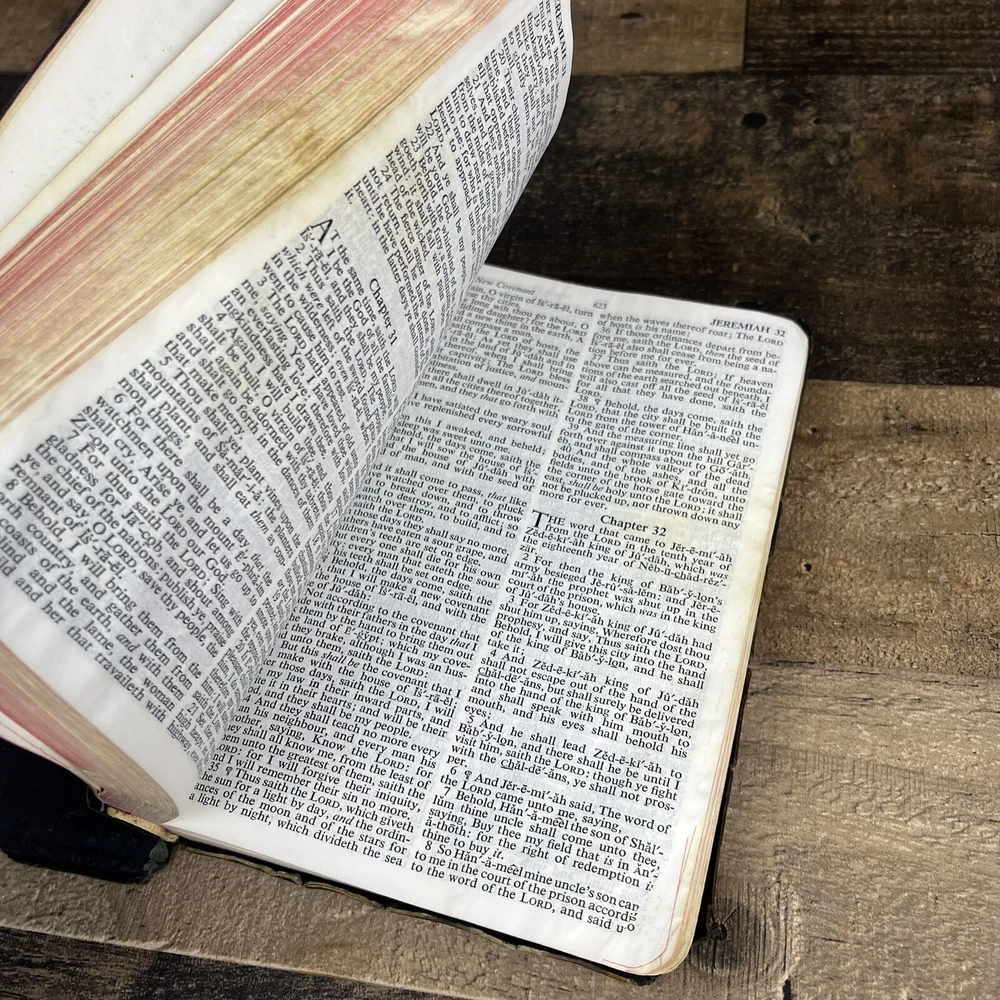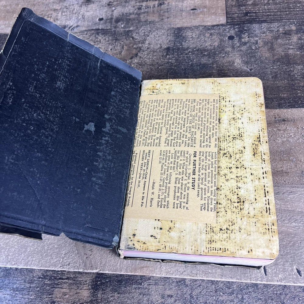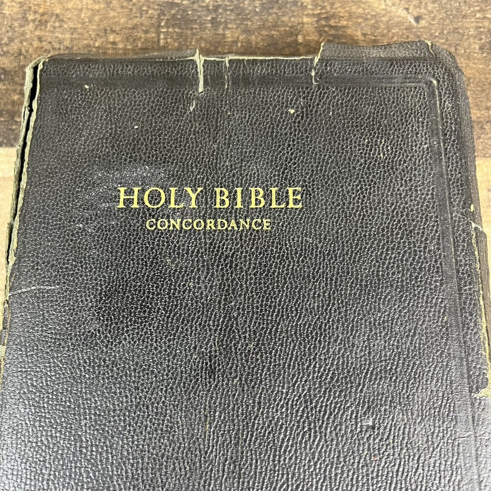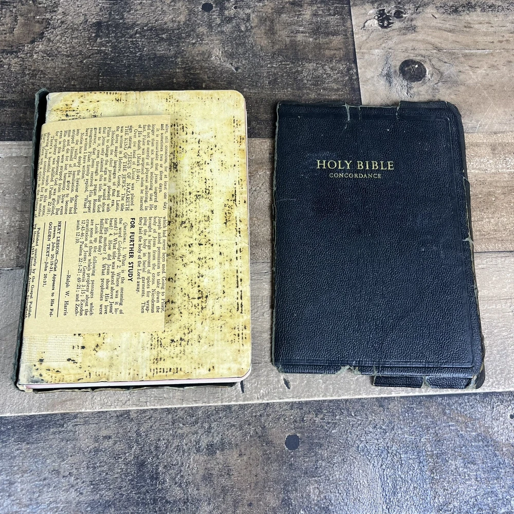 There is writing and damage to the Bible as shown above. One of the pages is torn off and folded in the front as well as the cover being completely detached. It comes with the original box. This item is used and may have minor imperfections. I will do my best to show any imperfections in the pictures above. All purchases will be packaged properly to arrive to you as expected. Please feel free to message me with any questions you may have. Thank you for taking a look!