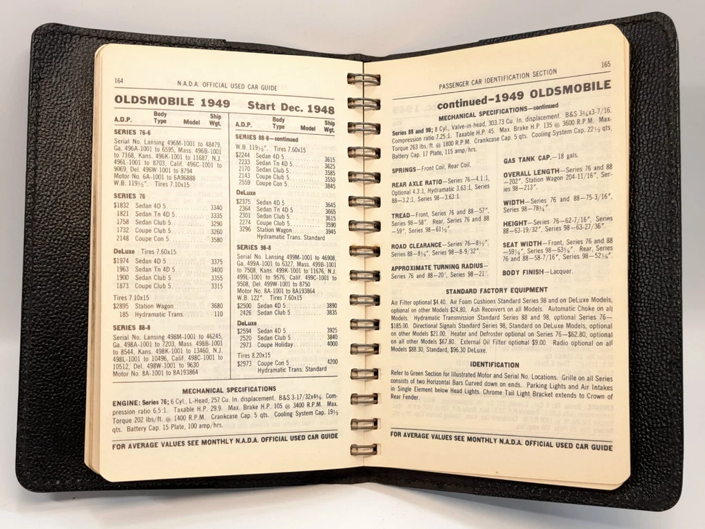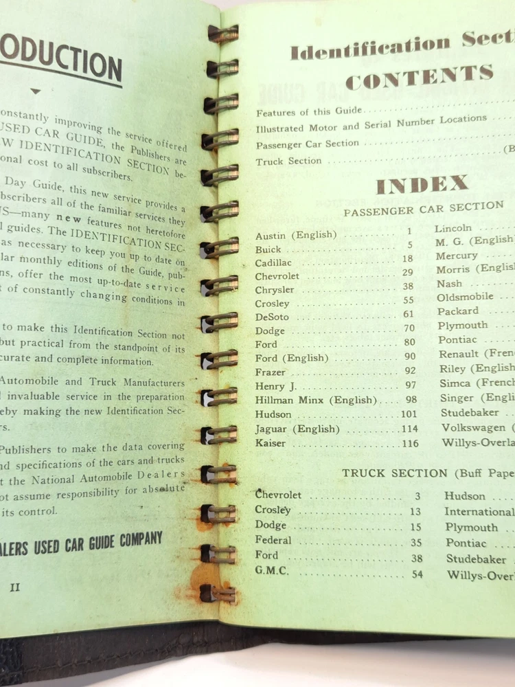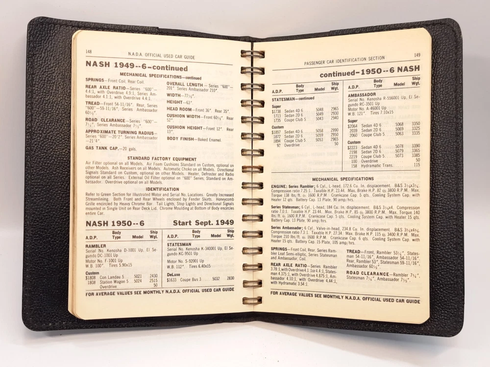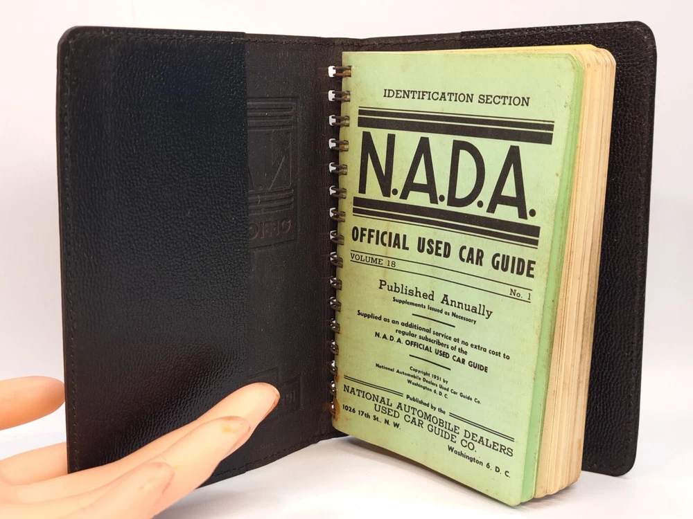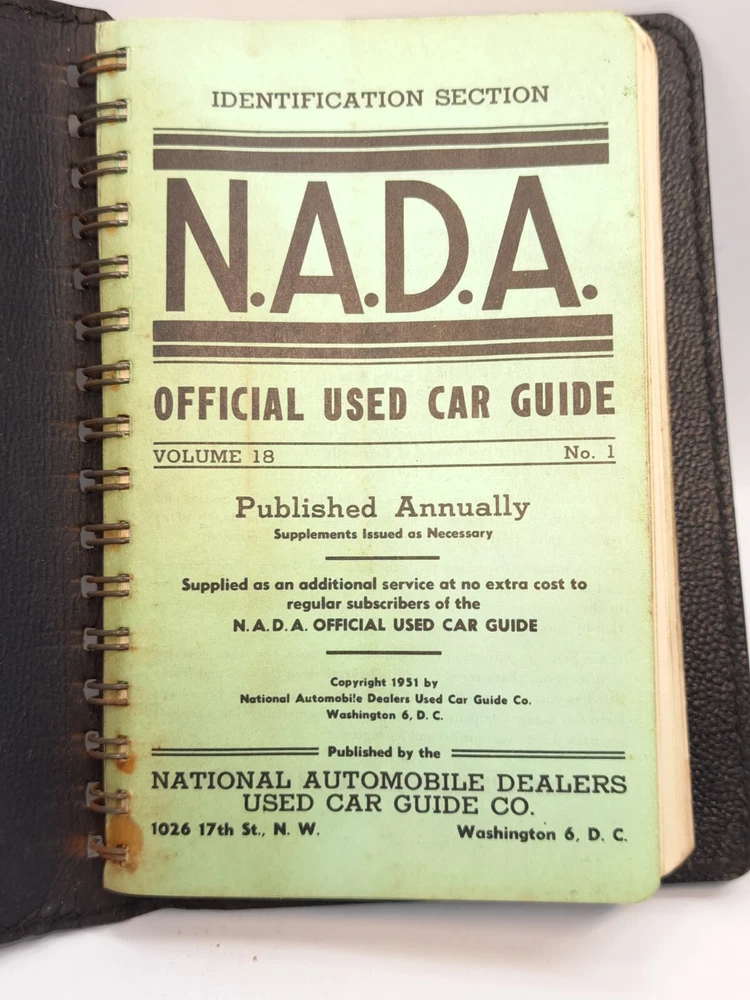 N.A.D.A. OFFICIAL PASSENGER CAR GUIDE Volume 18 No. 1 Copyright 1931 by National Automobile Dealers Used Car Guide Co. Washington, D.C. Leather - Spiral Bound - Car Section 232 Pages - Truck Section 84 Pages Contents Include: Features of Guide, Illustrated Motor and Serial Number Locations, Passenger Car Section and Truck Section. Measures approximately 6" x 4" x 5/8" GOOD USED CONDITION WITH WEAR FROM AGE AND USE Some light stains. Some curving of covers. Some of the metal rings have rusted and broken away. PLEASE VIEW ALL PHOTOS AND ASK ANY QUESTIONS BEFORE PURCHASING! - Visit Our Store For More Great Items! - https://www.ebay.com/str/vintagerevivalvt