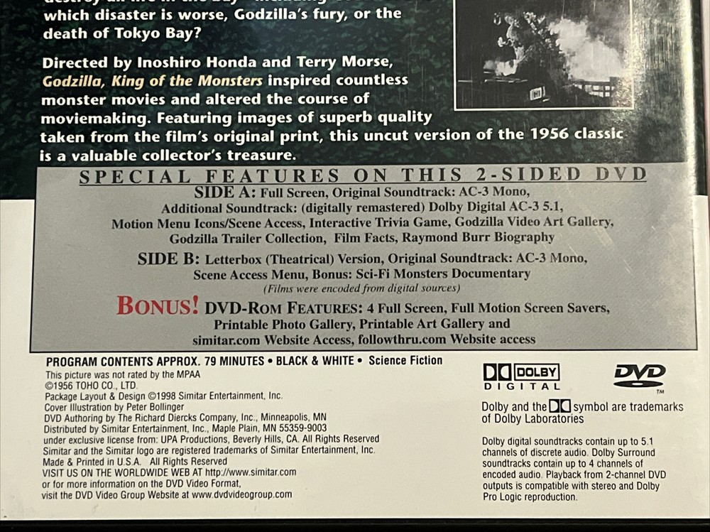 . PLEASE READ description/condition before buying. I am not an expert in dvd/vhs, therefore please don't hesitate to ask questions if needed. thank you kindly 1956 Godzilla (the original movie) King of the monsters (NTSC 1 dvd) USA condition: some minor wear on case/ inlay surfaces, edges and corners. disc has very minor scuffs. plays perfect. please see pictures as well --------------- thank you for your interest in this item. ONLY SHIPPING WITH TRACKING is offered. EBAY calculates cost charged by the postal services and it will vary based on your location. I can’t do anything about the shipping companies cost, however I am happy to combine shipping if you are interested in other items. Please add to cart and request total before making a payment and I will send you a revised invoice with the new cost. Happy to combine shipping for extra savings Buy with confidence! Client satisfaction is important to me, therefore please don’t hesitate to contact if all is not to your complete satisfaction. Thank you kindly " International buyers ? please note : Import duties, taxes, and charges aren't included in the item price or postage cost. These charges are the buyer's responsibility." "Please check with your country's customs office to determine what these additional costs will be prior to bidding or buying." IMPORTANT NOTE: tracking is provided on all purchases and some services have insurance. BUYER assumes all issues about delivery, loss, damage and non receipt. When insurance is included, buyer is responsible for contacting the shipping company and make a claim when appropriate.