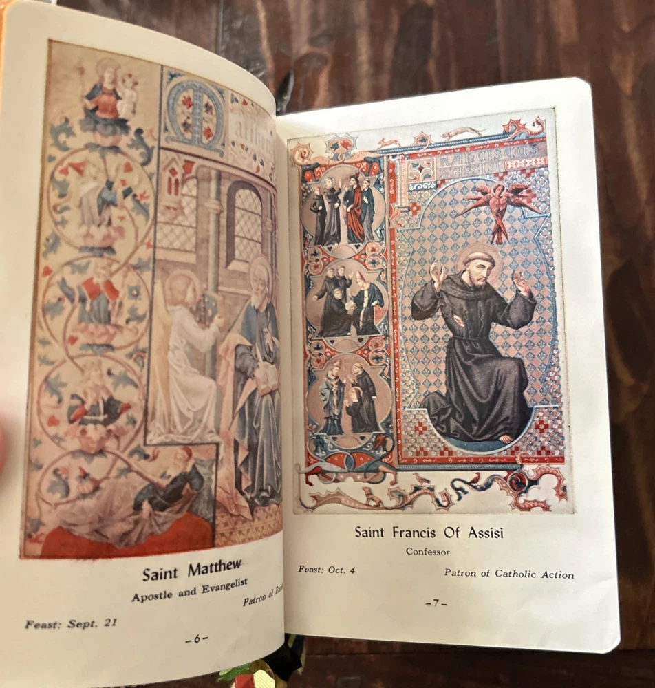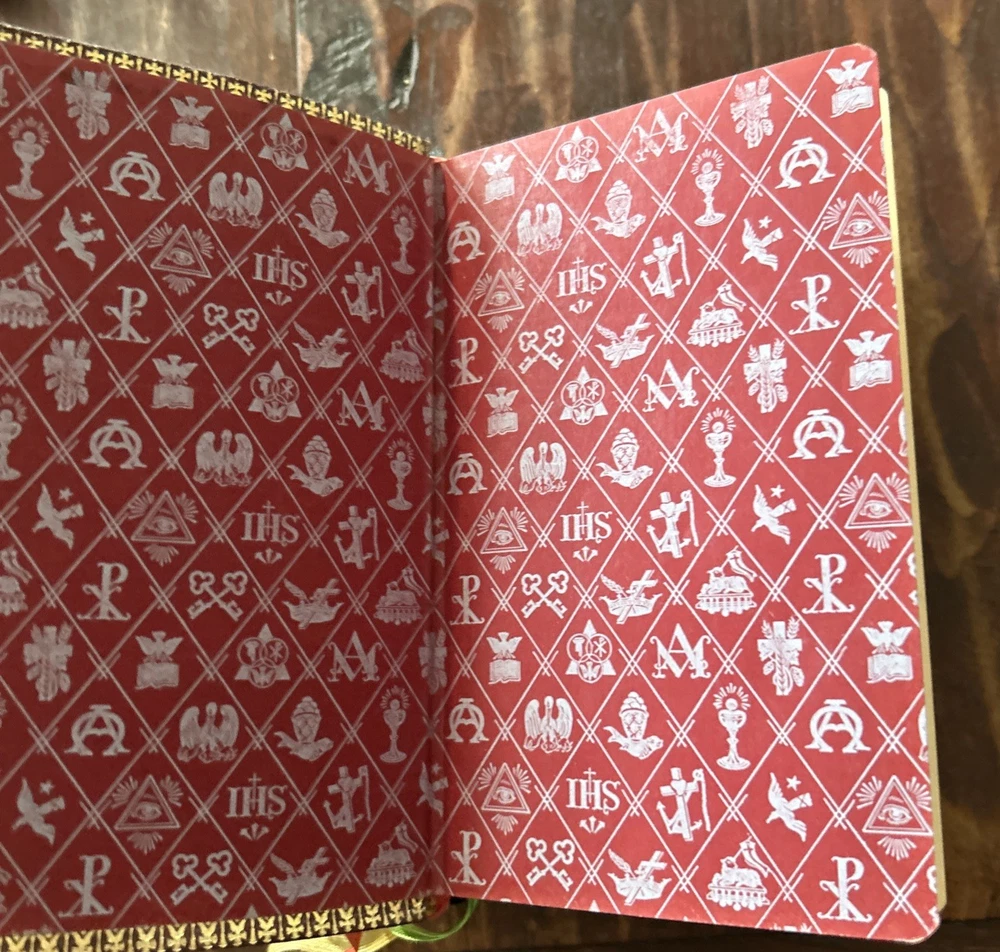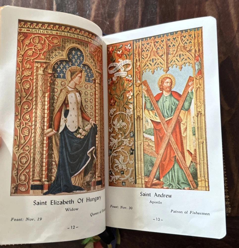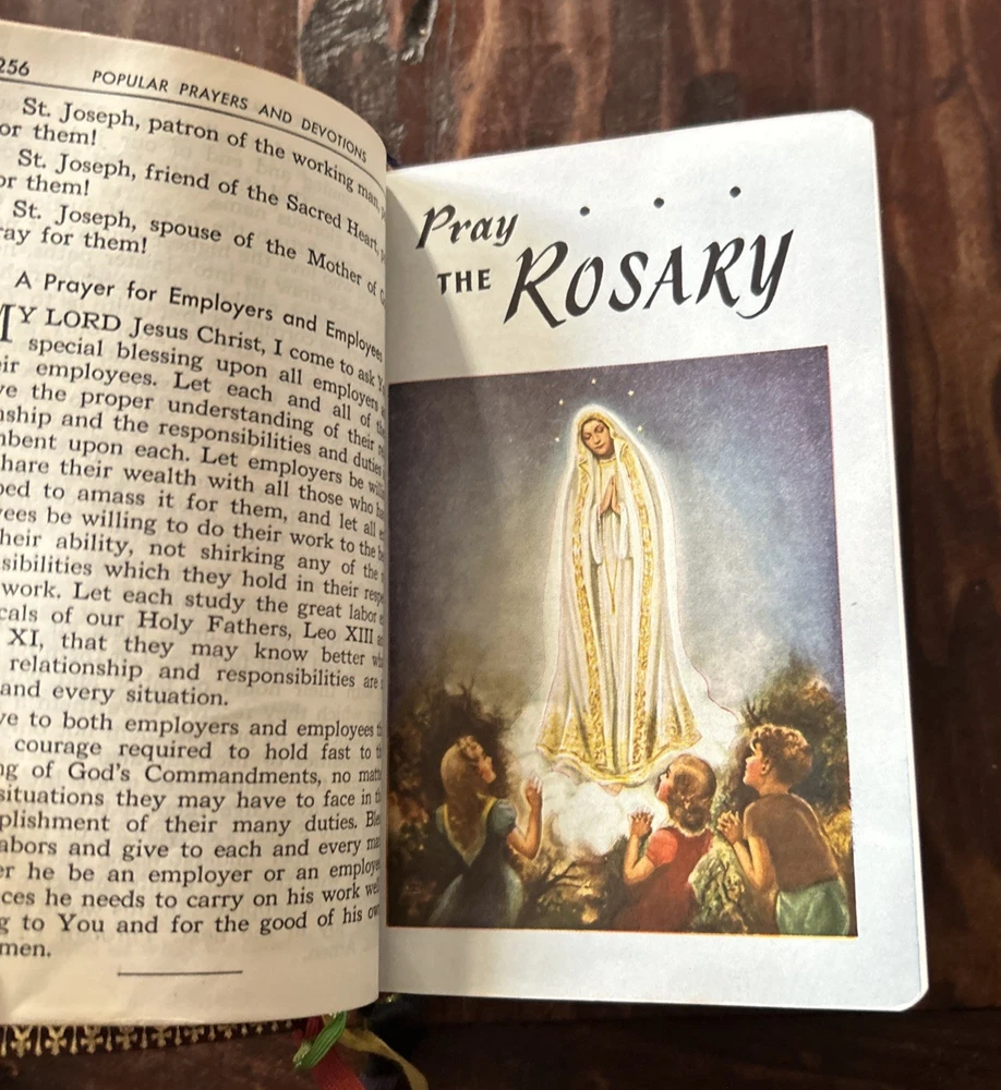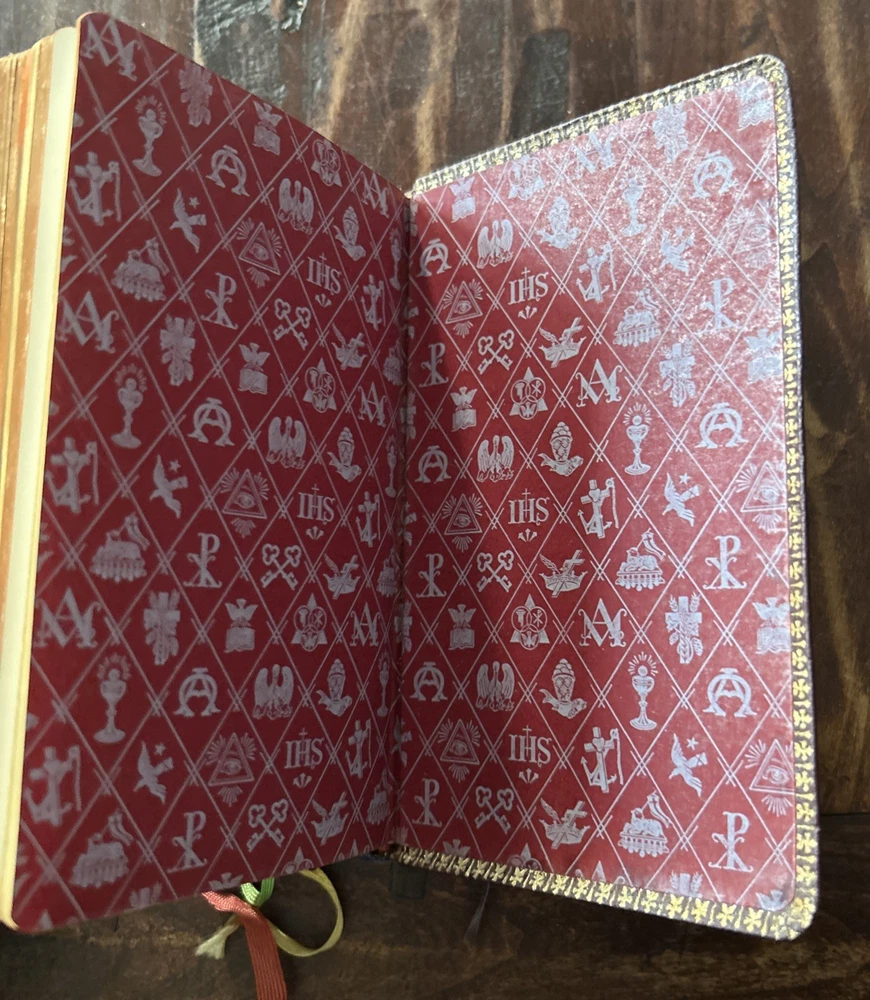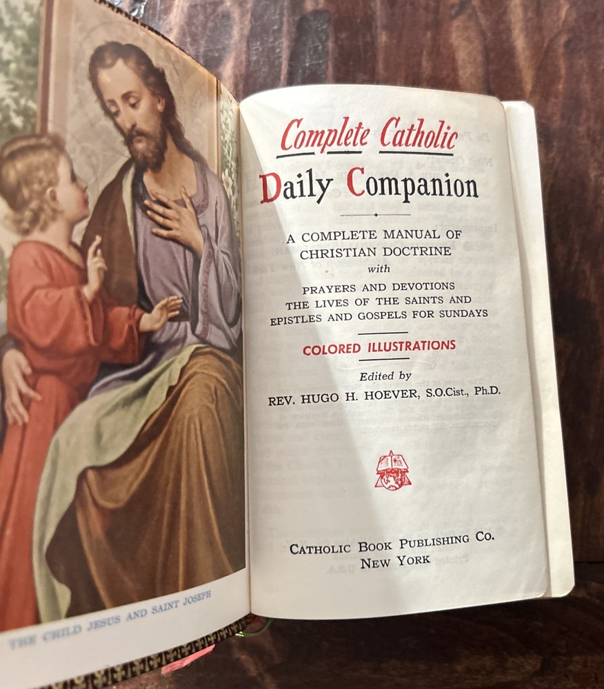 Beautiful vintage 1956 Pebbled Leather Bound Edition: Complete Catholic Daily Companion; Confraternity Version. Beautifully illustrated Pre-Vatican II Catholic Devotional. Tridentine Latin Mass Guide; Rosary Guide; Stations of the Cross; Lives and Feast Days of Saints included. Very good vintage condition with very light cover wear. Intact ribbon page markers and gold gilt page edges. A rare find in this condition.