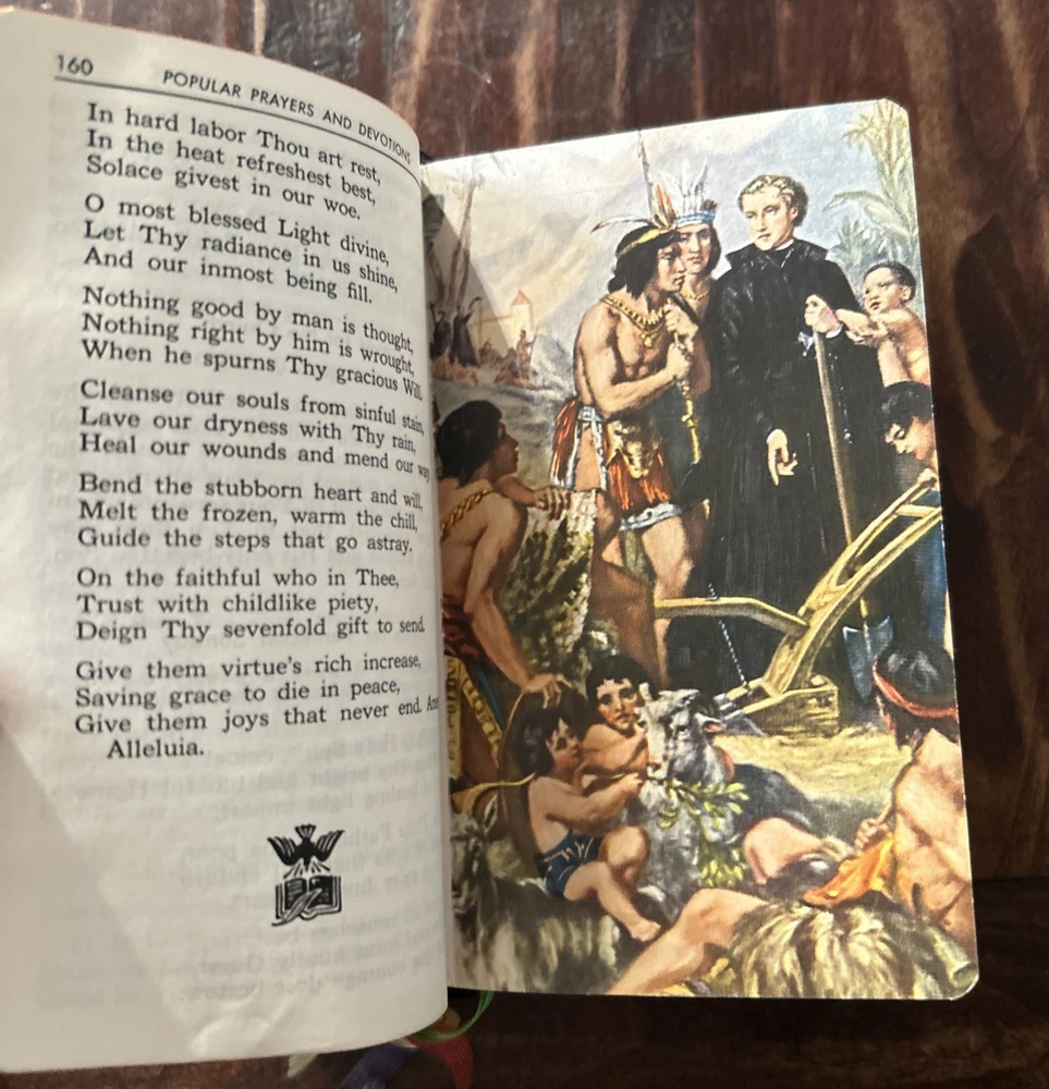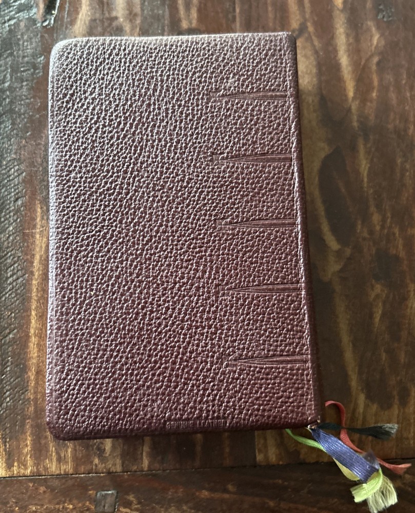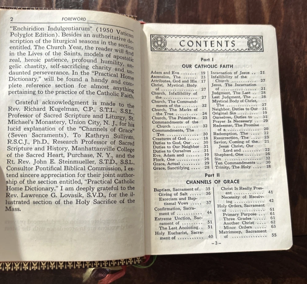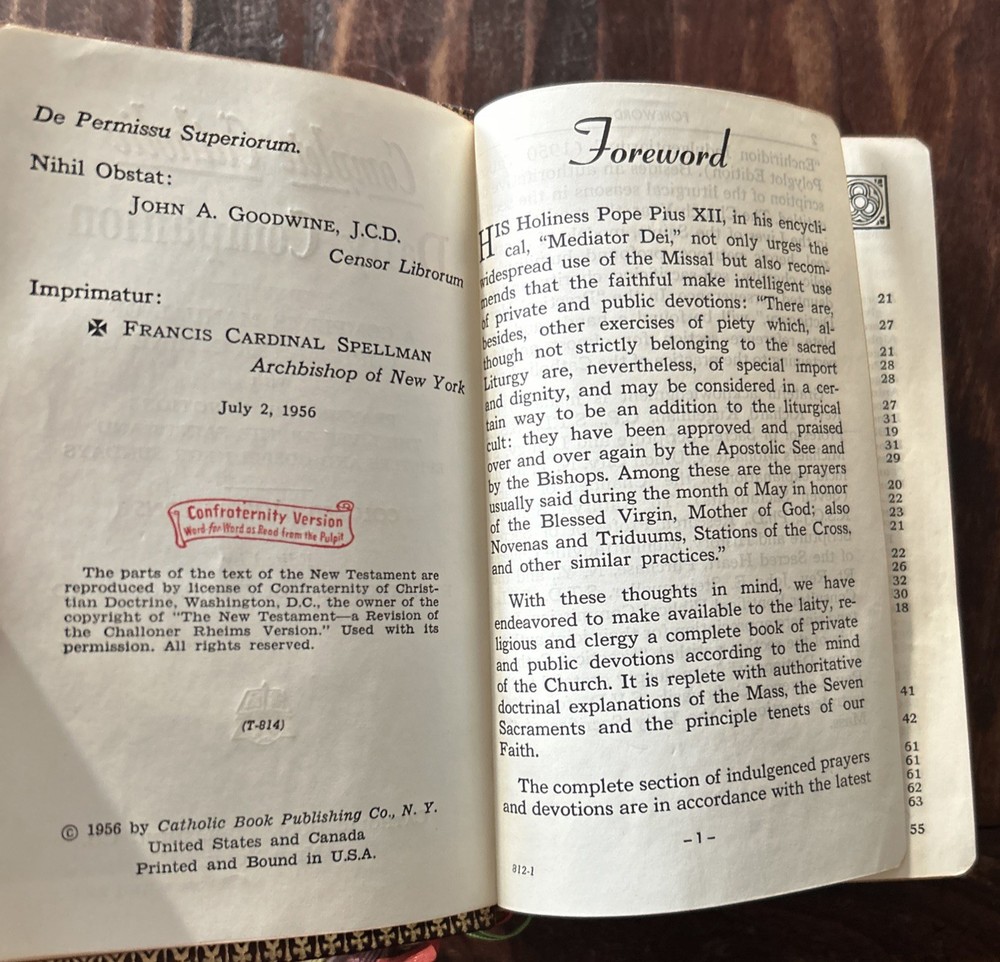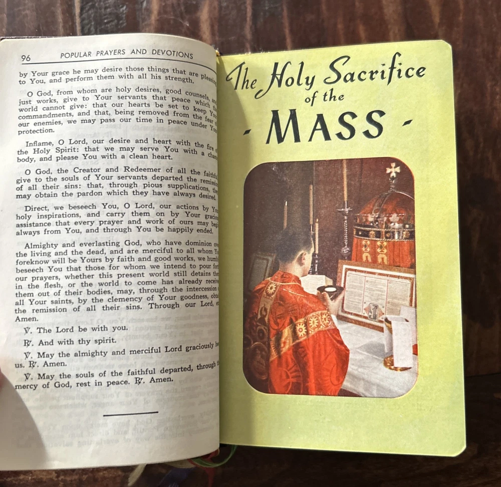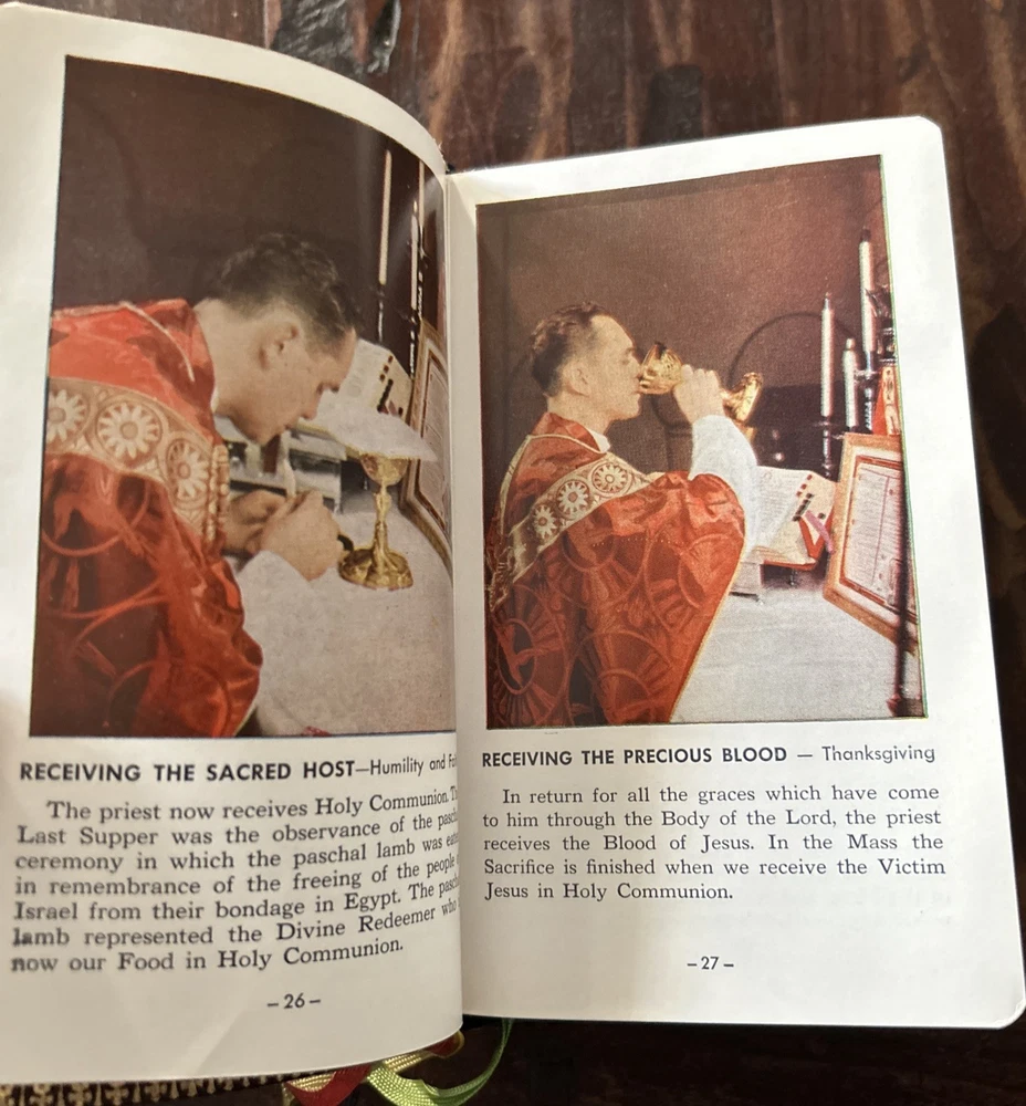 Beautiful vintage 1956 Pebbled Leather Bound Edition: Complete Catholic Daily Companion; Confraternity Version. Beautifully illustrated Pre-Vatican II Catholic Devotional. Tridentine Latin Mass Guide; Rosary Guide; Stations of the Cross; Lives and Feast Days of Saints included. Very good vintage condition with very light cover wear. Intact ribbon page markers and gold gilt page edges. A rare find in this condition.