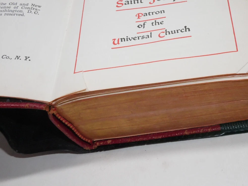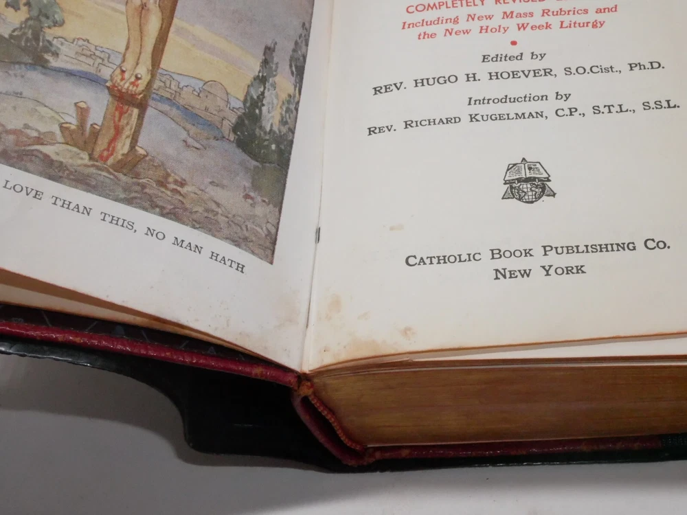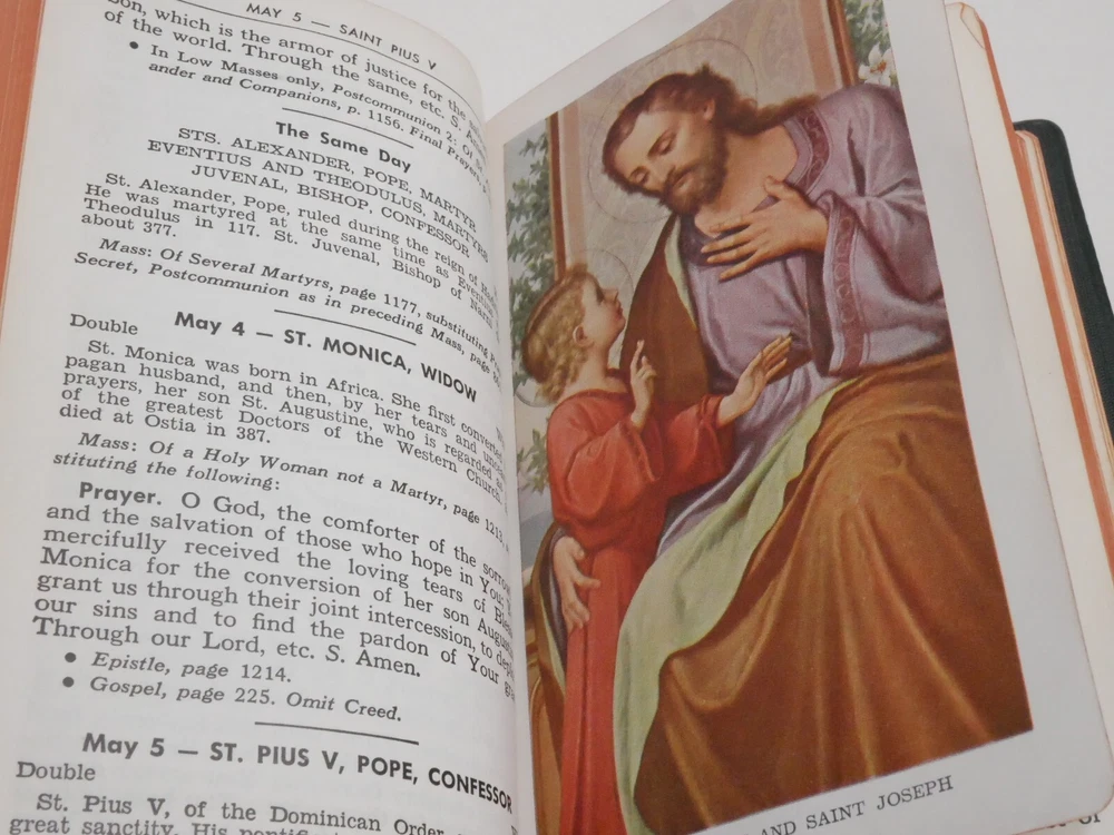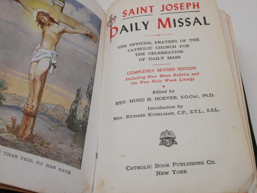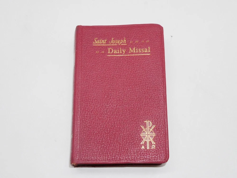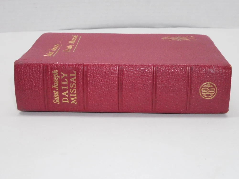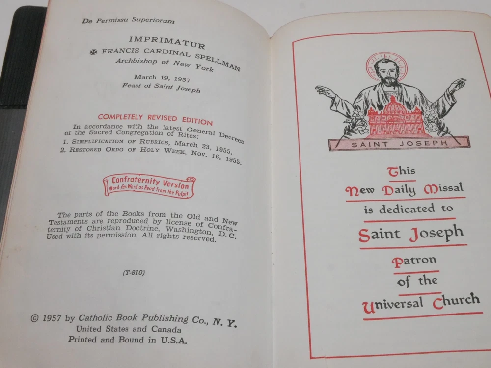 1957 Catholic Saint Joseph Daily Missal Confraternity Version Leather with Cover See photos for details. There is wear to the book including corner wear and some rips to pages. Examples of wear can be seen in the pictures and do not impact use.