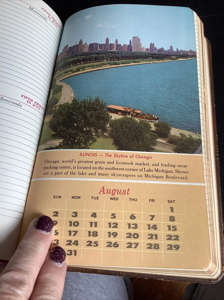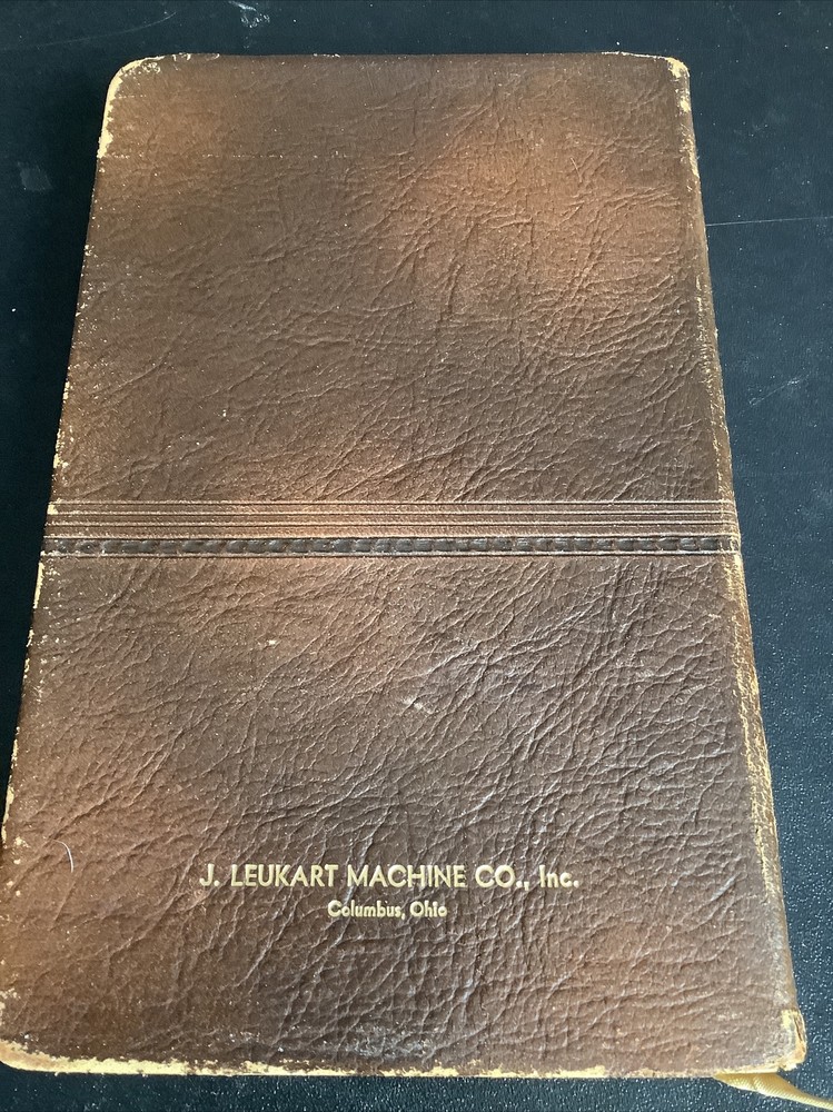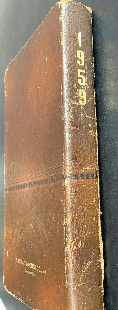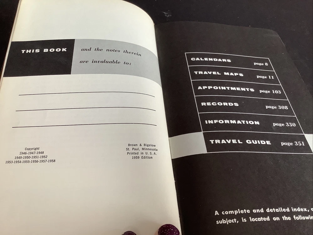1959 Executive Record and Travel Guide Leather Cover, Gilt. Vintage. Non Smoking. Shipped with USPS Media Mail. No writing in book. The cover has worn edges and inside the front cover, the page has se...