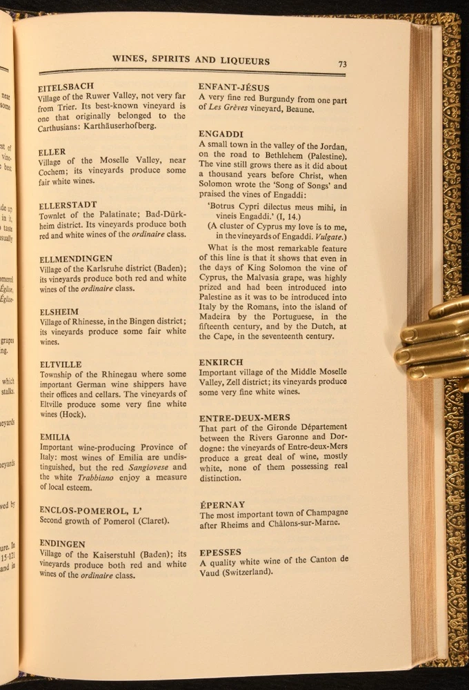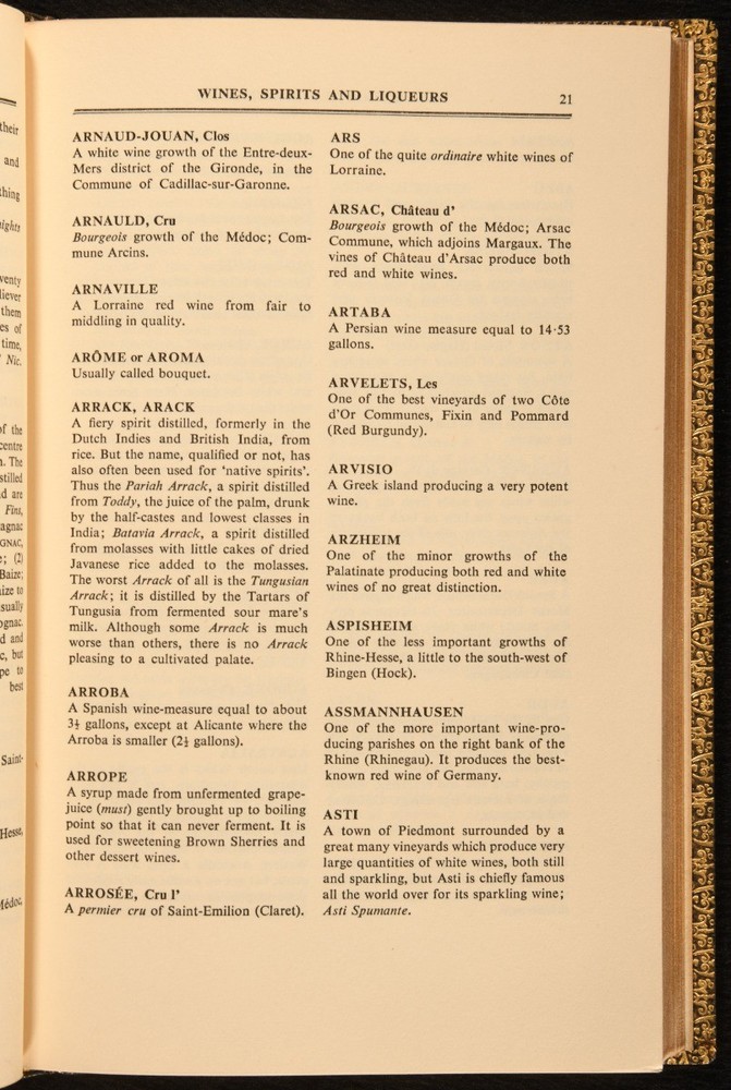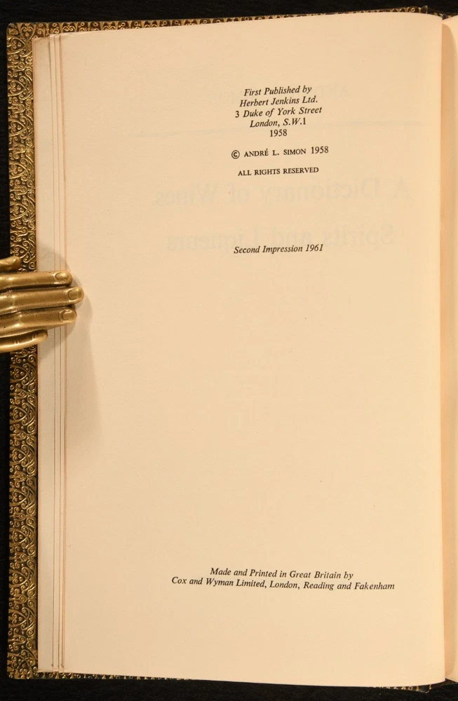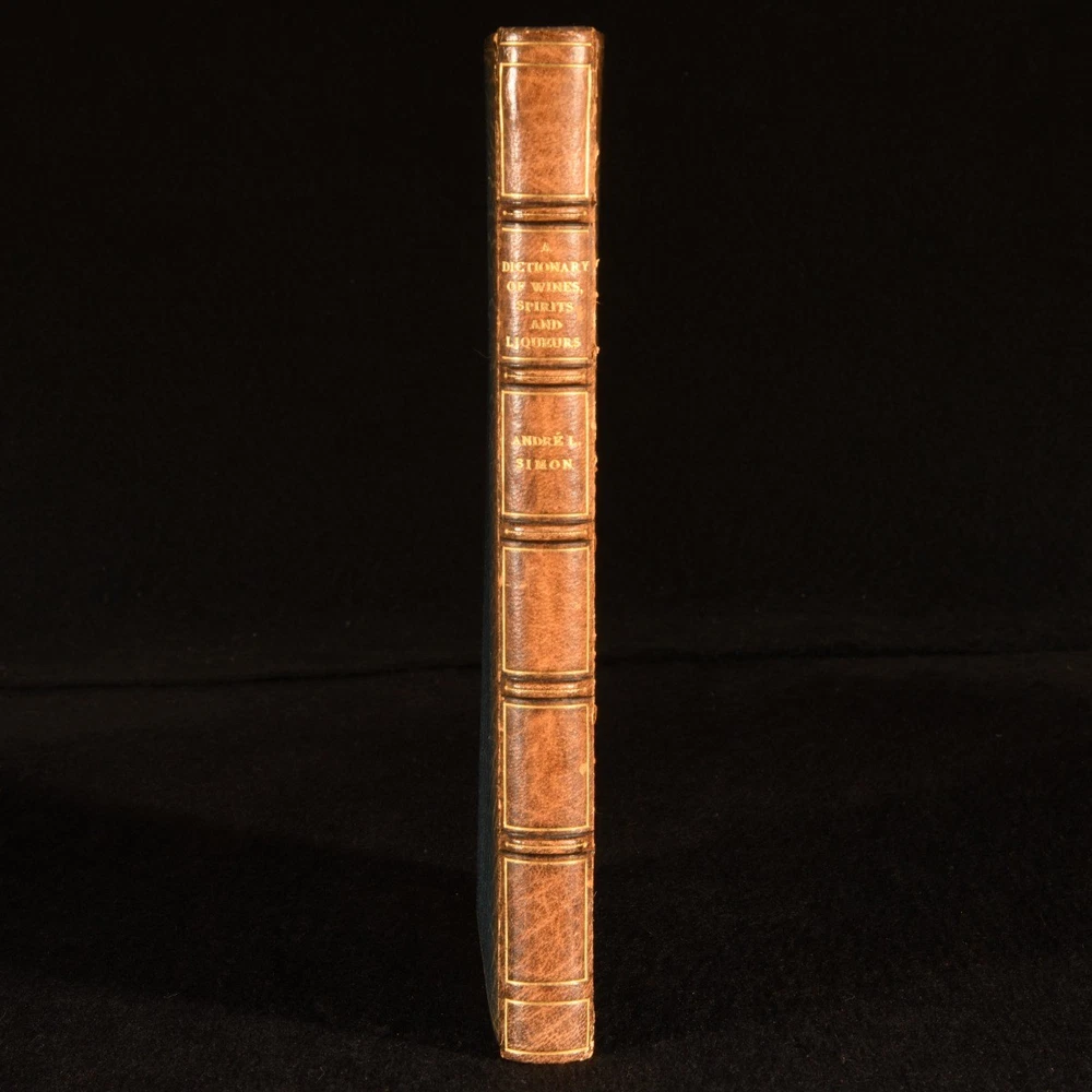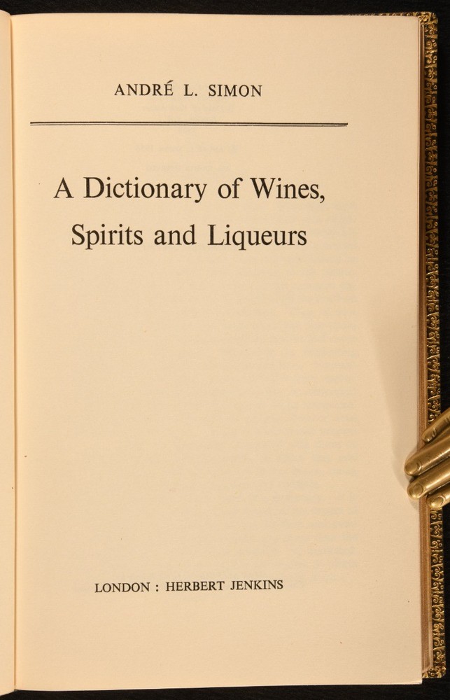 Click here to see our other books! A Dictionary of Wines, Spirits and Liqueurs Andre L. Simon 1961 Herbert Jenkins : London 9" by 5" 5-167 [2]pp SUMMARY A strikingly bound copy of wine merchant Andre L. Simon's impressive guide to wines, spirits and liqueurs, in a crushed morocco signed binding from Asprey. Early Edition,Leather Binding,Signed Binding Overall Condition: Very Good Indeed This book weighs 1 KG when packed UK Postage: £ 3.99 US Postage: £ 22.99 EU Postage : £ 16.99 European Postage: £ 17.99 Asia Postage: £ 22.99 Worldwide Postage: £ 28.99 DESCRIPTION In a crushed morocco signed binding from Asprey, with pictorial gilt detailing to the head of the front board depicting grapes. The second impression of this work, which was first published in 1958. Arranged alphabetically, Simon's work catalogues all manner of wines, spirits and liqueurs, providing detailed information on their manufacture, flavours, origins and regions. With an advertisement leaf to the rear. Simon was a wine merchant, gourmet, and prolific writer about wine, considered to be the 'charismatic leader of the English wine trade for almost all of the first half of the 20th century'. CONDITION In a full crushed morocco signed binding, with gilt detailing, gilt dentelles, and marbled endpapers. Light rubbing to rear joint, with a touch more rubbing to front joint. Fading to back strip, as is common with green morocco. Light horizontal line of rubbing towards front board tail. Internally, firmly bound. Pages exceptionally clean and bright. Overall Condition: Very Good Indeed GLOSSARY OF TERMS Overall Condition (Dustwrapper condition rating is shown after that for the book itself, where a dustwrapper is present) Fine - Very well preserved copy showing very little wear Very Good Indeed - Only one or two minor faults, really a very attractive copy Very Good - Quite a wide term meaning no major faults but probably several smaller ones often expected given the age of the book, but still a respectable copy Good - Meaning not very good. Some more serious faults as will be described in the condition report under 'condition' Good Only - Meaning one or more faults that could really do with repair Fair - As with good only above but with other faults leaving a compromised copy even after repair Poor - Really bad and possibly seriously incomplete. We only sell books in this condition where their rarity or value makes them attractive none the less. Major defects will be described. GUARANTEE We offer a full money back guarantee on our descriptions. Please ask for details and conditions. We prefer PAYPAL. If you pay via PAYPAL we will post the item off the same or the next working day with the postage you have selected. Please note we cannot accept USD cheques