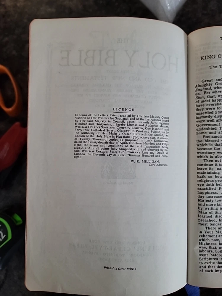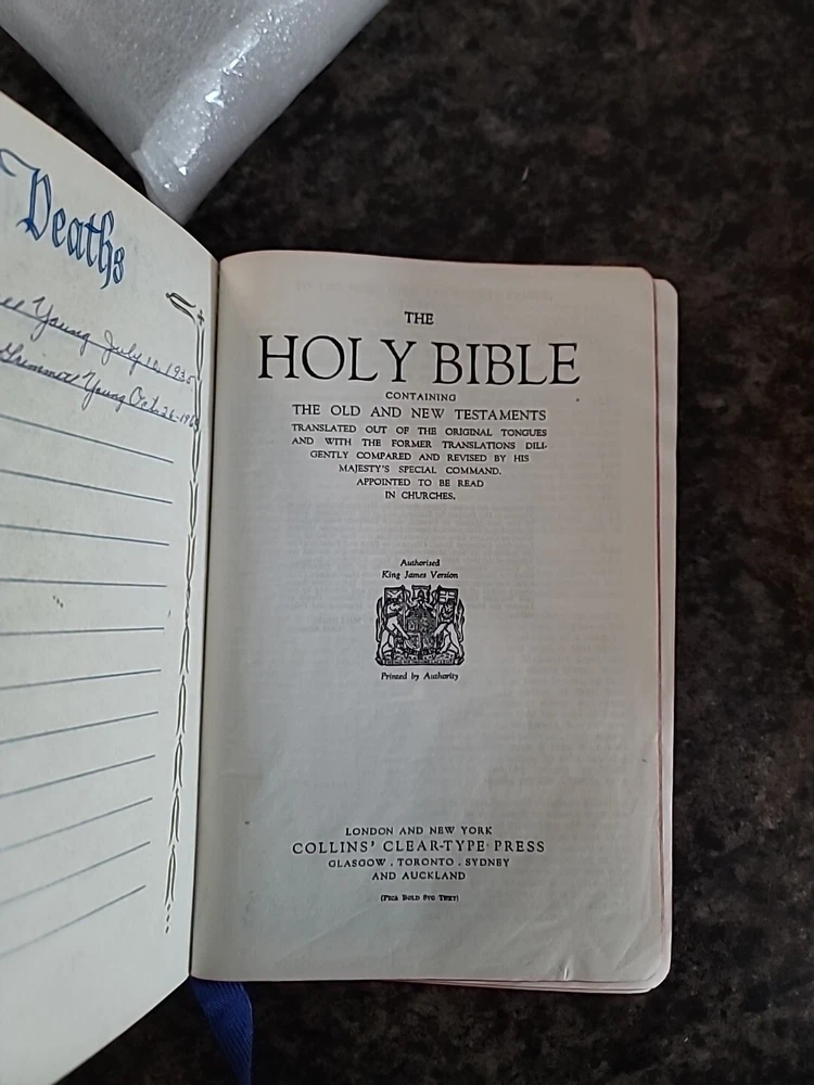 Vintage 1962 Collins Holy Bible – King James Version – Leather Bound, Large Print Own a piece of history with this beautifully preserved 1962 Collins Holy Bible , featuring the King James Version (KJV) and large print text for easy reading. This vintage edition is leather bound , adding to its timeless and elegant appeal. 📖 Product Features: Title: Holy Bible Version: King James Version (KJV) Publisher: Collins Year: 1962 Binding: Leather bound Print Size: Large Print Condition: Very good vintage condition, some wear to cover, pages clean and intact] ✨ Highlights: Classic large-print layout for easy reading Durable leather binding with gold-embossed details Traditional KJV text with poetic and historical language Ideal for collectors, display, or devotional use This Bible is both a spiritual treasure and a beautiful vintage collectible. Whether you're looking to add to your collection or gift a meaningful keepsake, this edition offers timeless value.