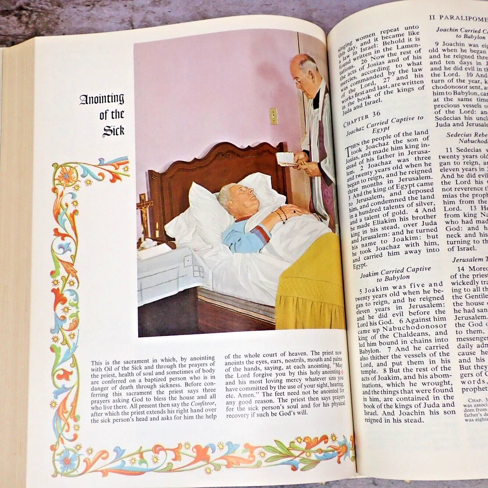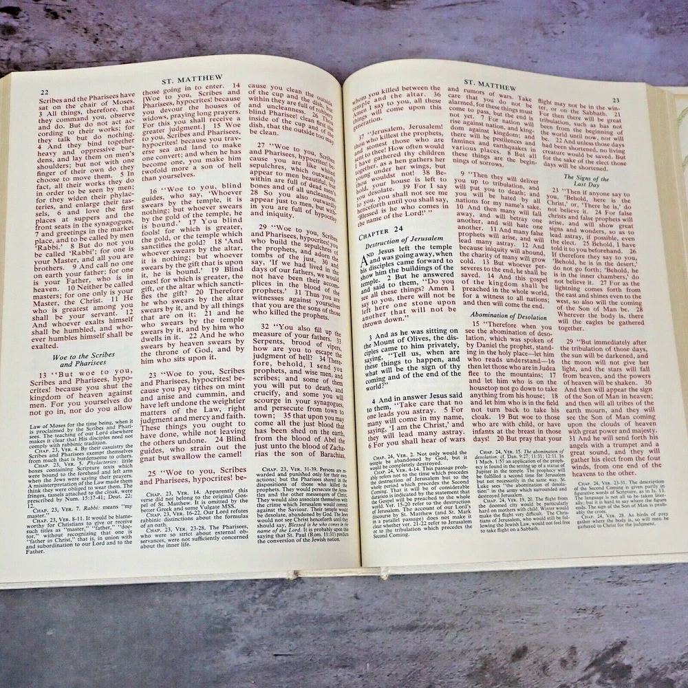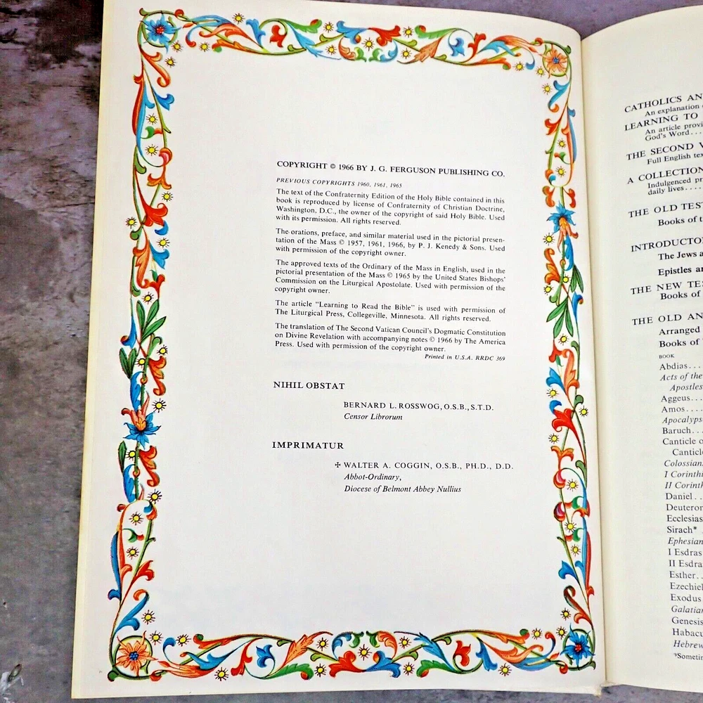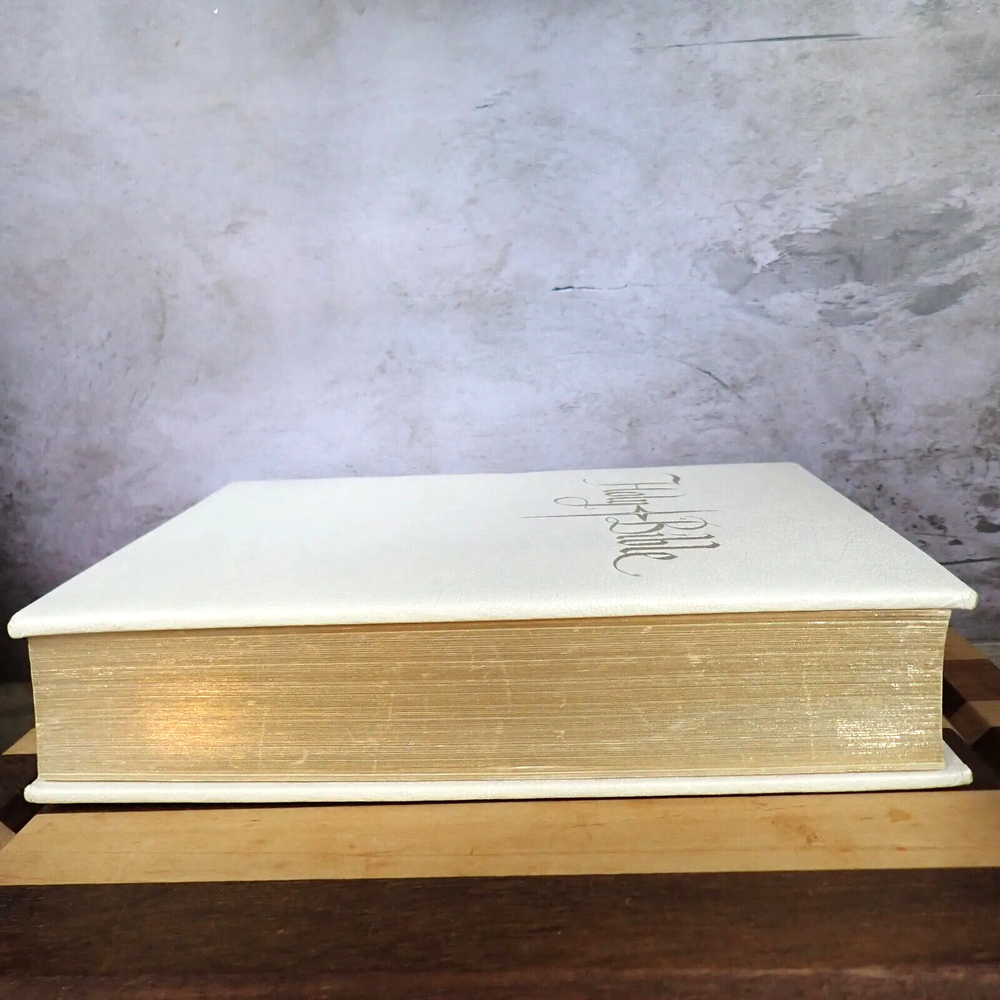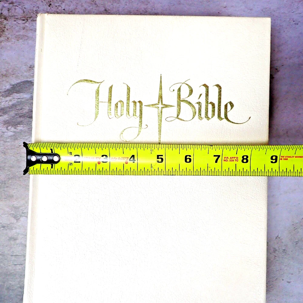 This beautiful 1966 Catholic Bible is in excellent condition—no rips, tears, or markings, just slight yellowing on the pages. The white leather cover and gold gilded edges give it a timeless, elegant look. Photos accurately show its pristine state, though monitor colors may vary slightly. A stunning addition to any collection! Free shipping makes it even better.