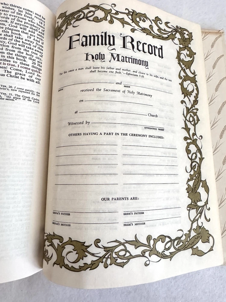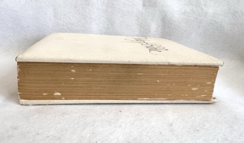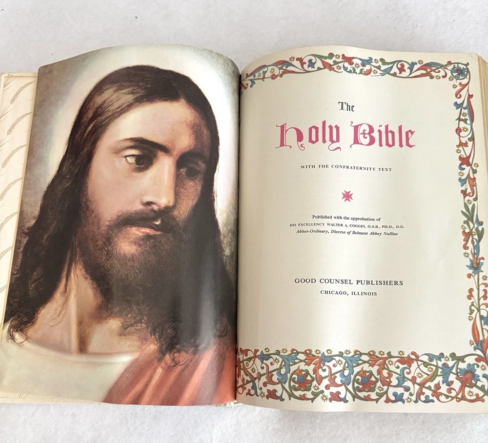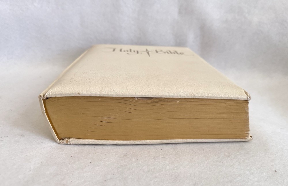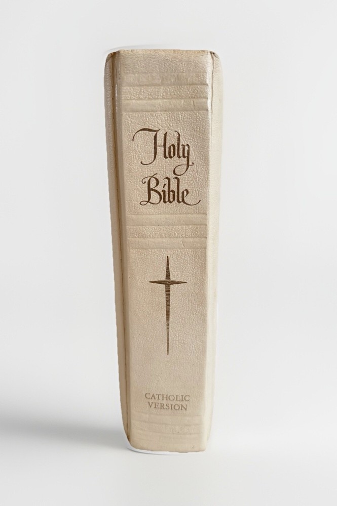 1966 Holy Bible Catholic Edition White w/ Confraternity Text Gold Gilded 11x8" This Holy Bible is the Catholic edition. No family names or events have been entered. The leather cover and all pages are clean. The edges are gold gilded but there are some spots as shown in the pictures.