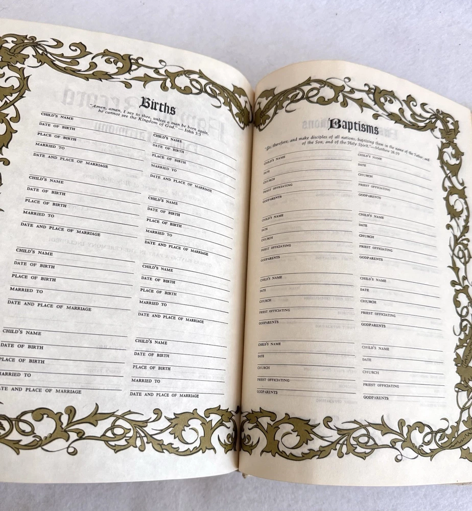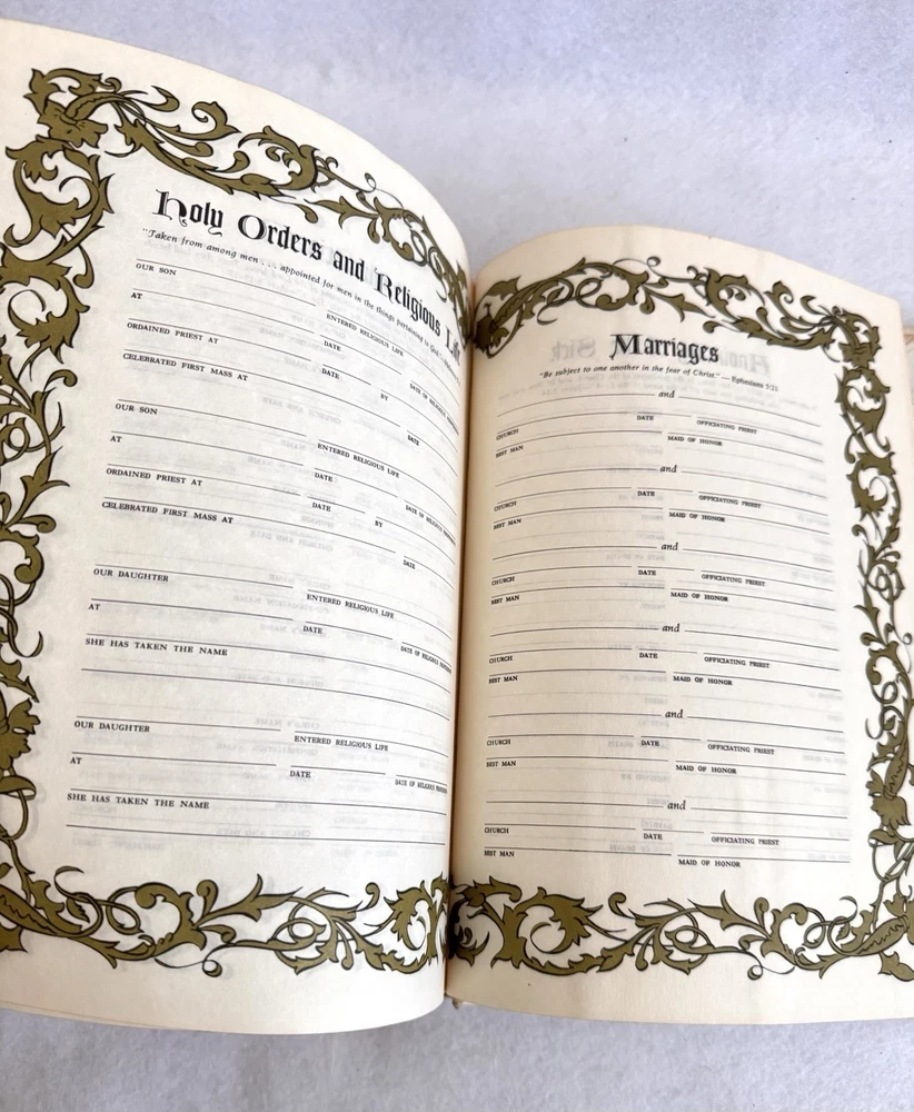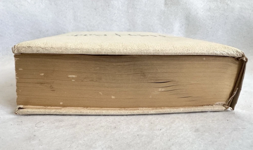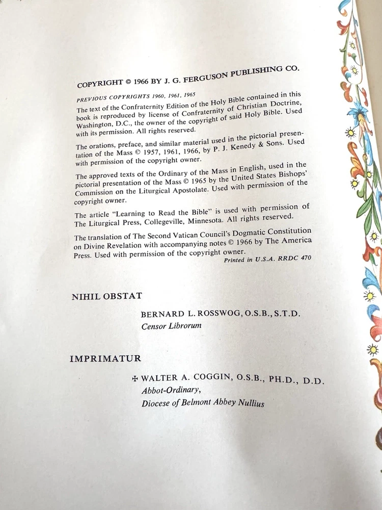 1966 Holy Bible Catholic Edition White w/ Confraternity Text Gold Gilded 11x8" This Holy Bible is the Catholic edition. No family names or events have been entered. The leather cover and all pages are clean. The edges are gold gilded but there are some spots as shown in the pictures.