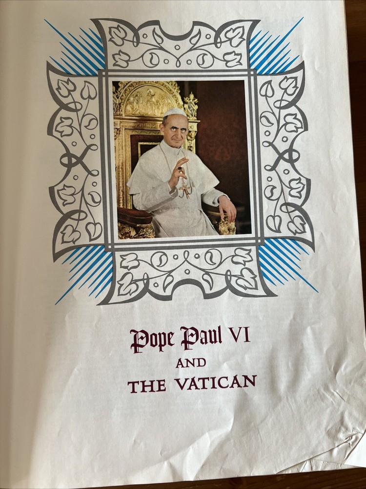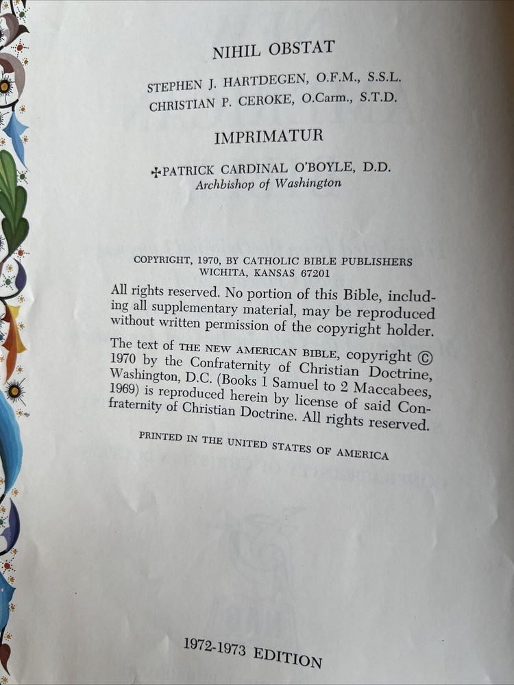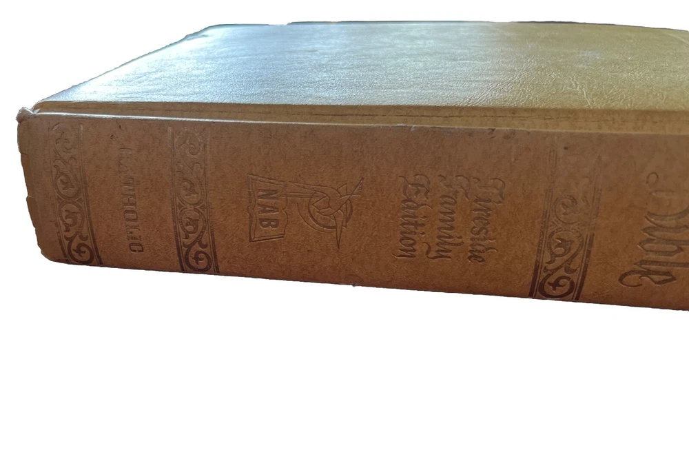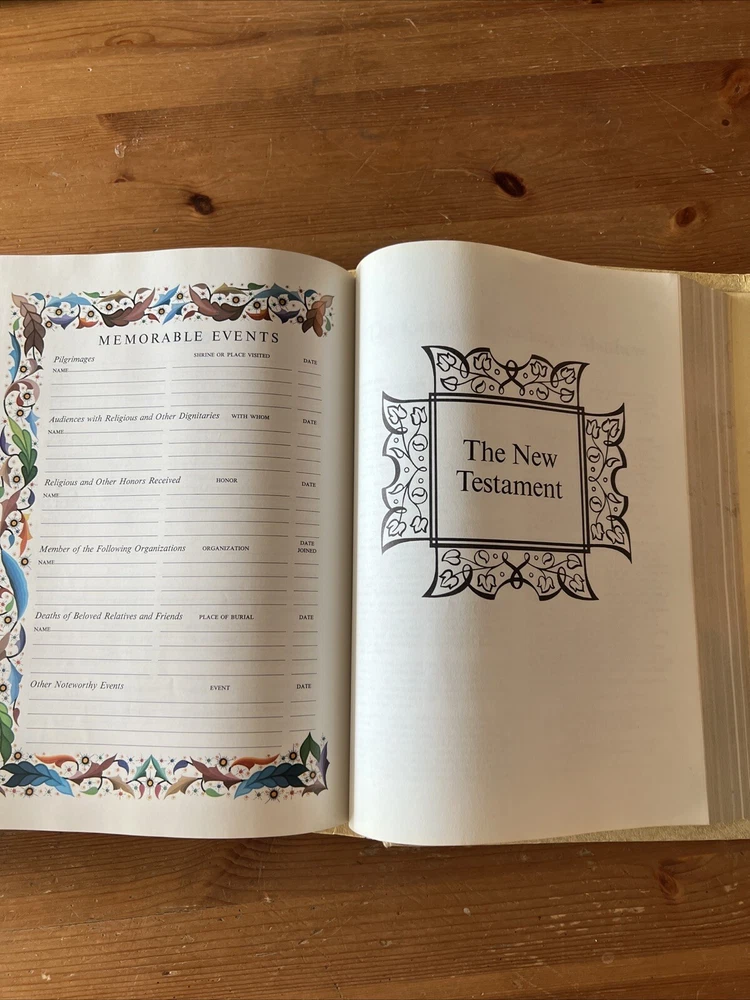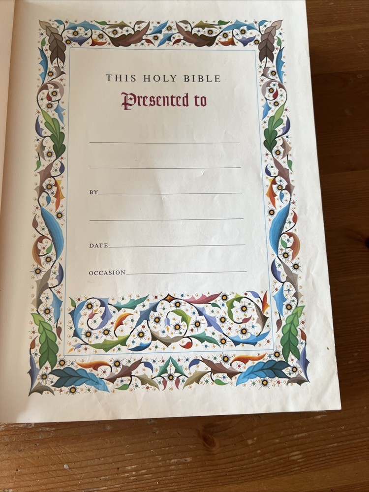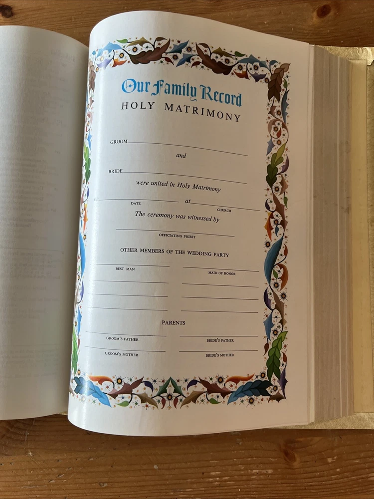 This beautiful 1970 Holy Bible is bound in off-white faux leather. It has gold accents, and a beautiful illustration of Jesus on the front. It is a large book, a perfect family Bible. It measures 12 inches long, 9 inches wide , about 2 1/2 inches tall. It is in good condition, with no writing, no tears, and no missing pages. There is some age to it, please look closely at photos to get a better idea.