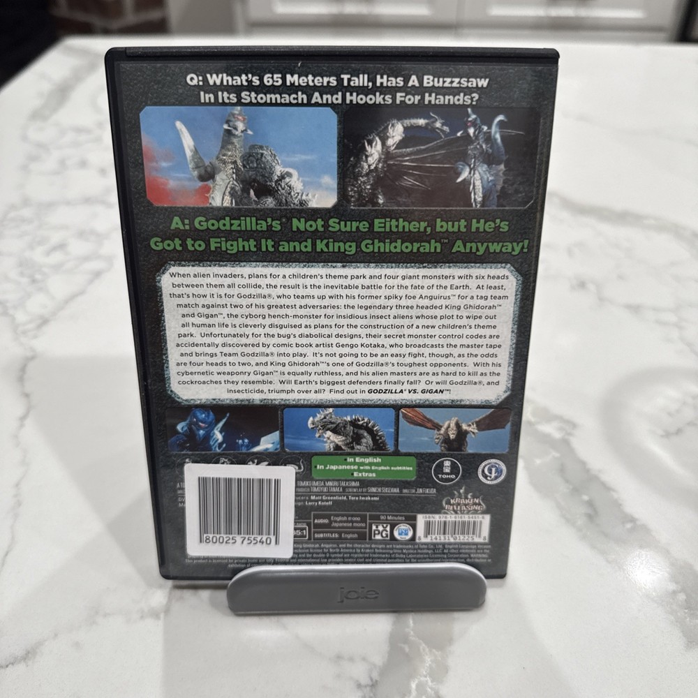 Disk looks fantastic! Tested and working!! The product is a 2014 DVD of the movie "Godzilla vs. Gigan," directed by Jun Fukuda and featuring Godzilla, Tomoko Umeda, and Hiroshi Ishikawa. This DVD includes English and Chinese subtitles, original dubbing, and a full-screen aspect ratio. The film falls under the genres of Creature/Monster, Japanese, and Sci-Fi & Fantasy, with a PG rating. The DVD is in NTSC video format, has a region code of 1 (US, Canada), and is rated for both standard and limited editions.