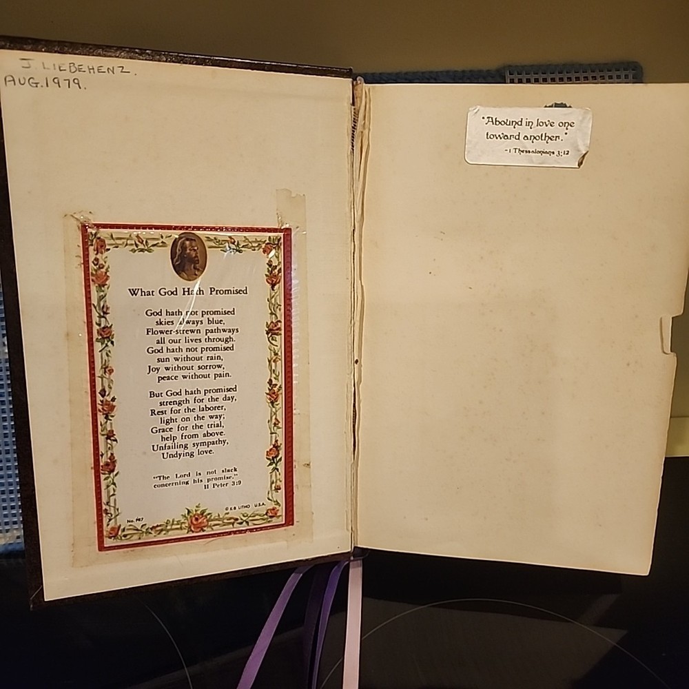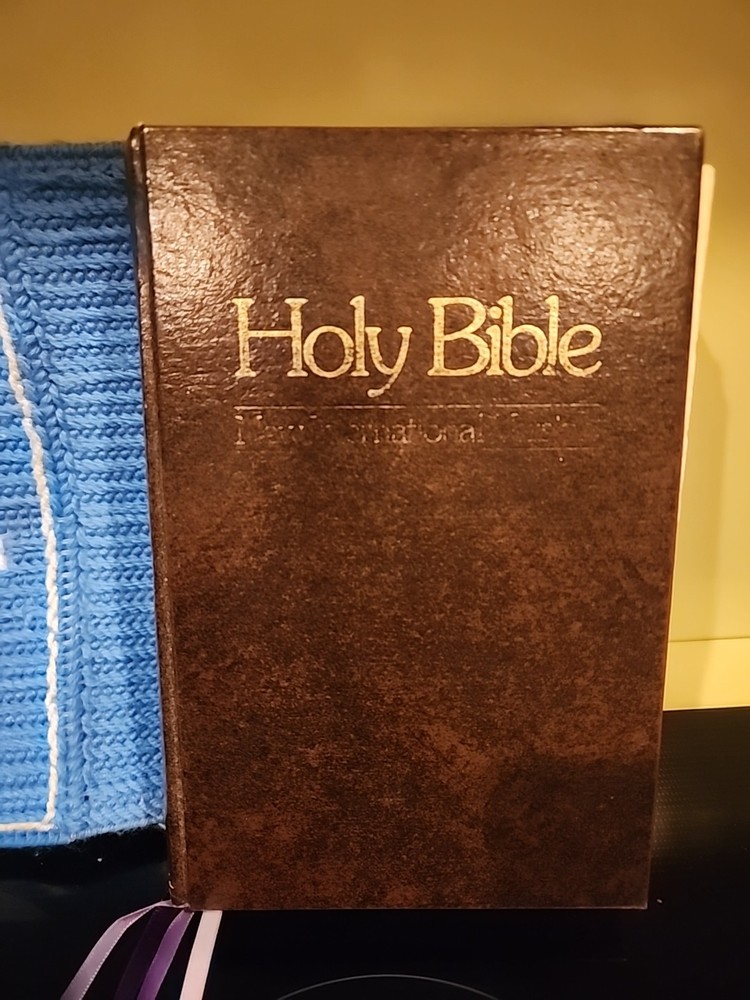 This vintage 1978 NIV Holy Bible published by Zondervan Bible Publishers is a unique and personalized addition to any collection. The hardcover book measures 8.5 inches in length and 5.75 inches in width, with 1341 pages of spirituality and history. The book features a handmade cover. The original cover is made of faux leather, dated and signed by the previous owner, along with notes written by them. This particular edition is the 7th printing and is considered a rare and unique find. The book also includes satin ribbons for easy navigation. Perfect for anyone interested in religion, spirituality, or history. The binding is broken and is shown in pictures but does not take away the uniqueness of this Bible.
