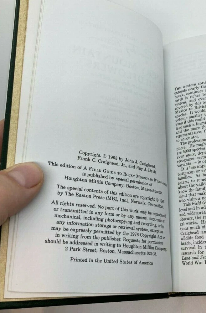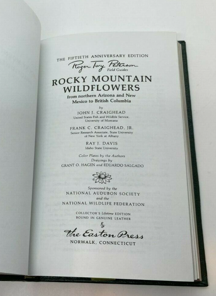 Up for sale is a beautiful 1985 Easton Press 50th Anniversary Edition copy of "ROGER TORY PETERSON FIELD GUIDES: ROCKY MOUNTAIN WILDFLOWERS FROM NORTHERN ARIZONA AND NEW MEXICO TO BRITISH COLUMBIA" by John J. Craighead & Frank C. Craighead . Gold Gilding to the boards and along the spine as well as gilded page ends. A beautiful copy of this classic field guide. This guide describes 590 species, with detailed information on flowering season, related species, range, and habitat. More than 100 plant drawings supplement these descriptions, and more than 200 color photographs show flowers as they appear in the field. Roger Tory Peterson's unique system shows exactly what features to look for to tell one species from another. Peterson Field Guides are designed to work in the field, and every illustration, every word, is directed to that end. For each Field Guide, an author with expertise in the subject and an experienced artist work closely with the editors to ensure that both text and illustrations are accurate. This book is in very good condition. Boards are straight and clean with four good corners. Internally the book is in excellent condition. Spine and pages are extremely tight. No marks, book plates, tears, or writing anywhere in this book. Please review all photos for your best idea of the condition. Shipping on this item will be $5.25. Thank You and Good Luck!!