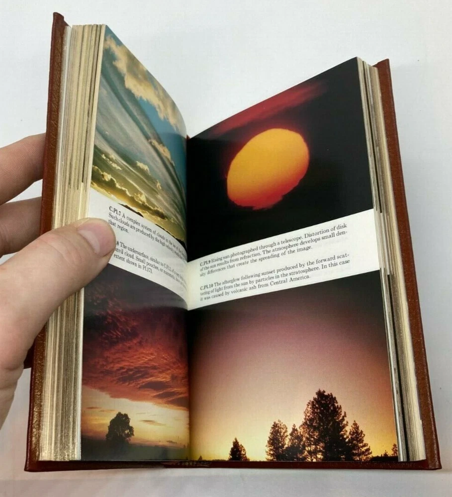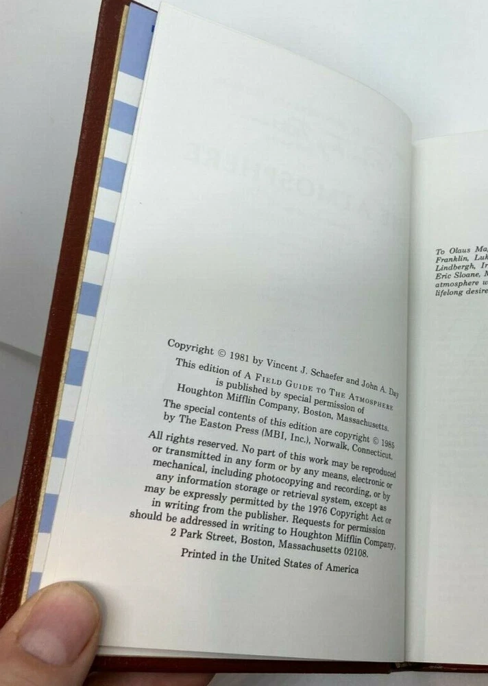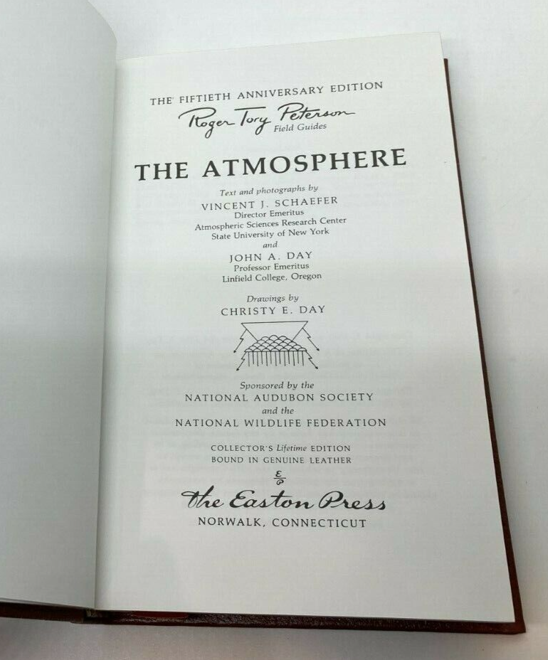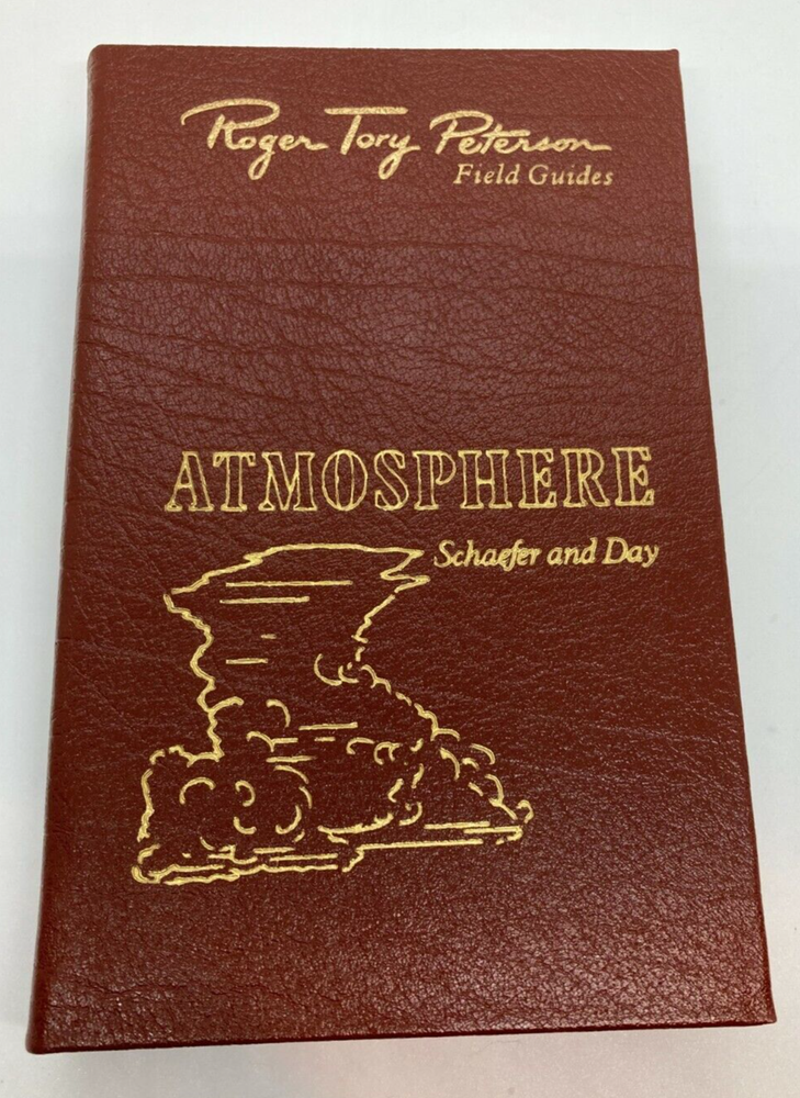 Up for sale is a beautiful 1985 Easton Press 50th Anniversary Edition copy of "ROGER TORY PETERSON FIELD GUIDES: THE ATMOSPHERE" by Vincent J. Schaefer. Gold Gilding to the boards and along the spine as well as gilded page ends. A beautiful copy of this classic field guide. More than 400 photographs and line drawings illustrate every kind of atmospheric phenomenon: clouds of every type; storms, from cloudbursts to hurricanes; and sky colors. This book is in very good condition. Boards are straight and clean with four good corners. Internally the book is in excellent condition. Spine and pages are extremely tight. No marks, book plates, tears, or writing anywhere in this book. Please review all photos for your best idea of the condition. Shipping on this item will be $5.25. Thank You and Good Luck!!